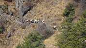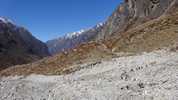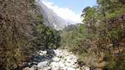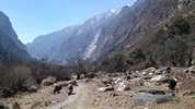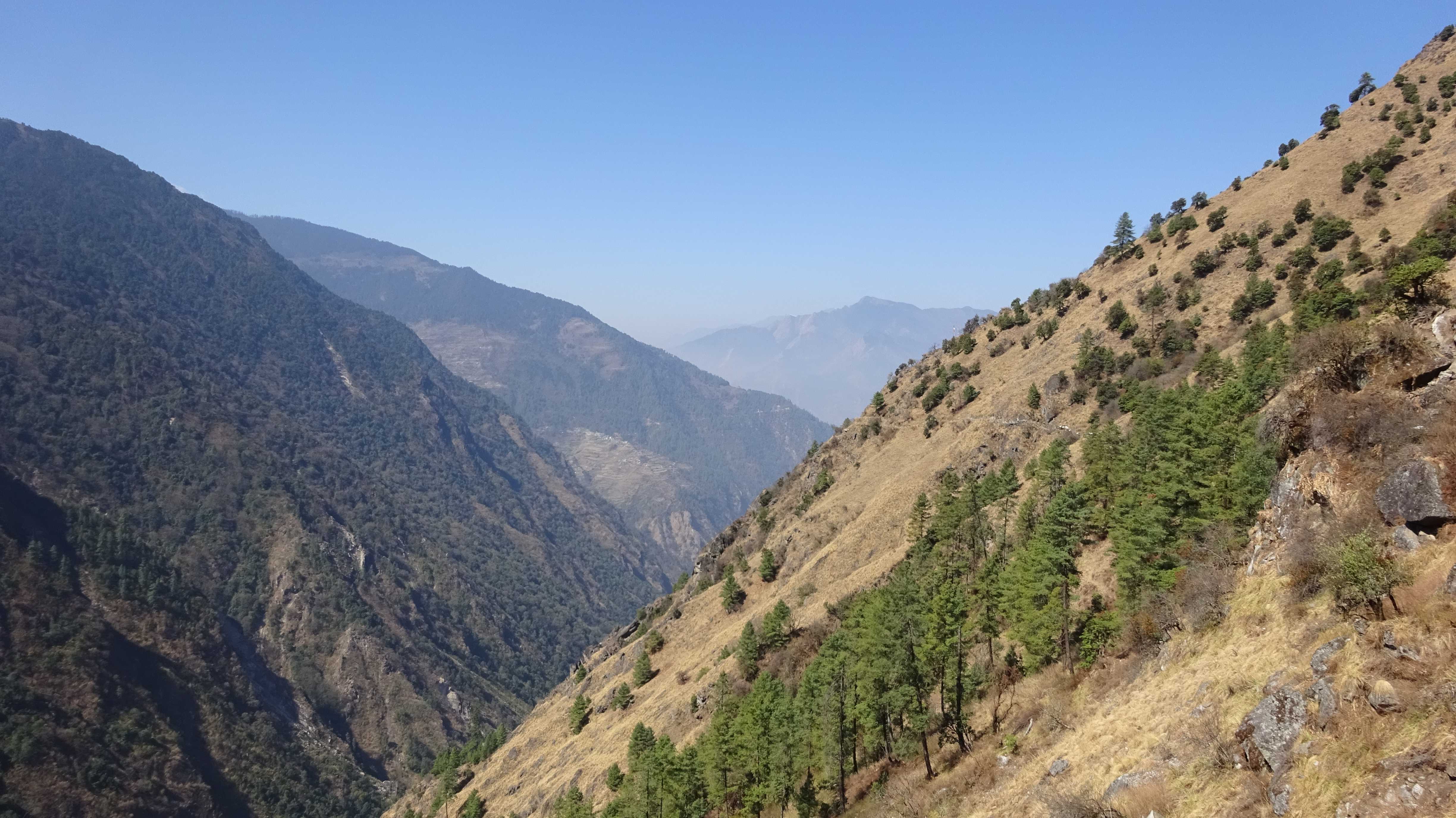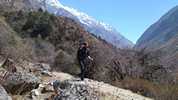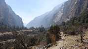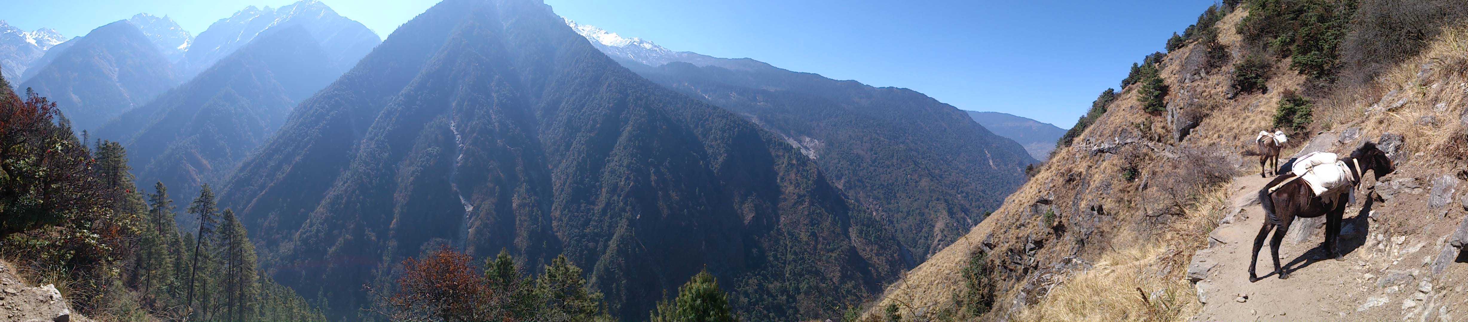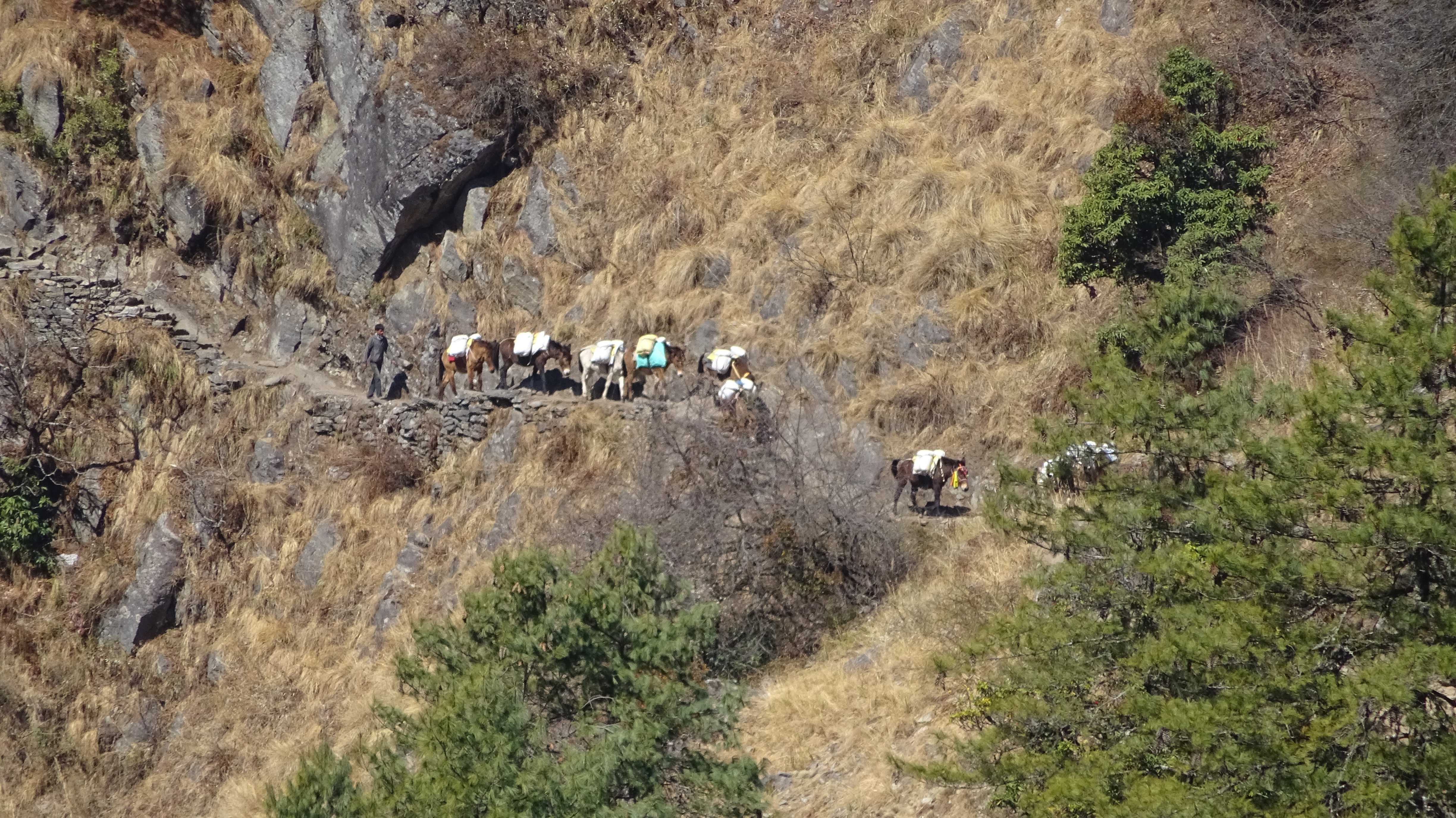 Am nächsten Morgen verlasse ich den ausgetretenen Hauptweg, der am Grund des Tals entlangführt und den ich vor vier Tagen hochgelaufen bin. Ich folge einem alternativen Pfad, der hoch oben am Steilhang verläuft und von dem aus man immer wieder nach unten in das tiefe Tal blicken kann. Und plötzlich sind alle Touristen verschwunden. Trifft man auf der Hauptroute meist viele Male pro Stunde auf „Gegenverkehr“, treffe ich hier während der ganzen sechs Stunden nur auf drei Israelis, die gerade auf dem Weg sitzen und Pause machen, als ich vorbeikomme. Und natürlich auf mehrere Gruppen von Maultieren, die – meist mit Zementsäcken beladen – von einem Nepalesen mit einem Holzknüppel und Steinwürfen die Berge hoch und runter getrieben werden.