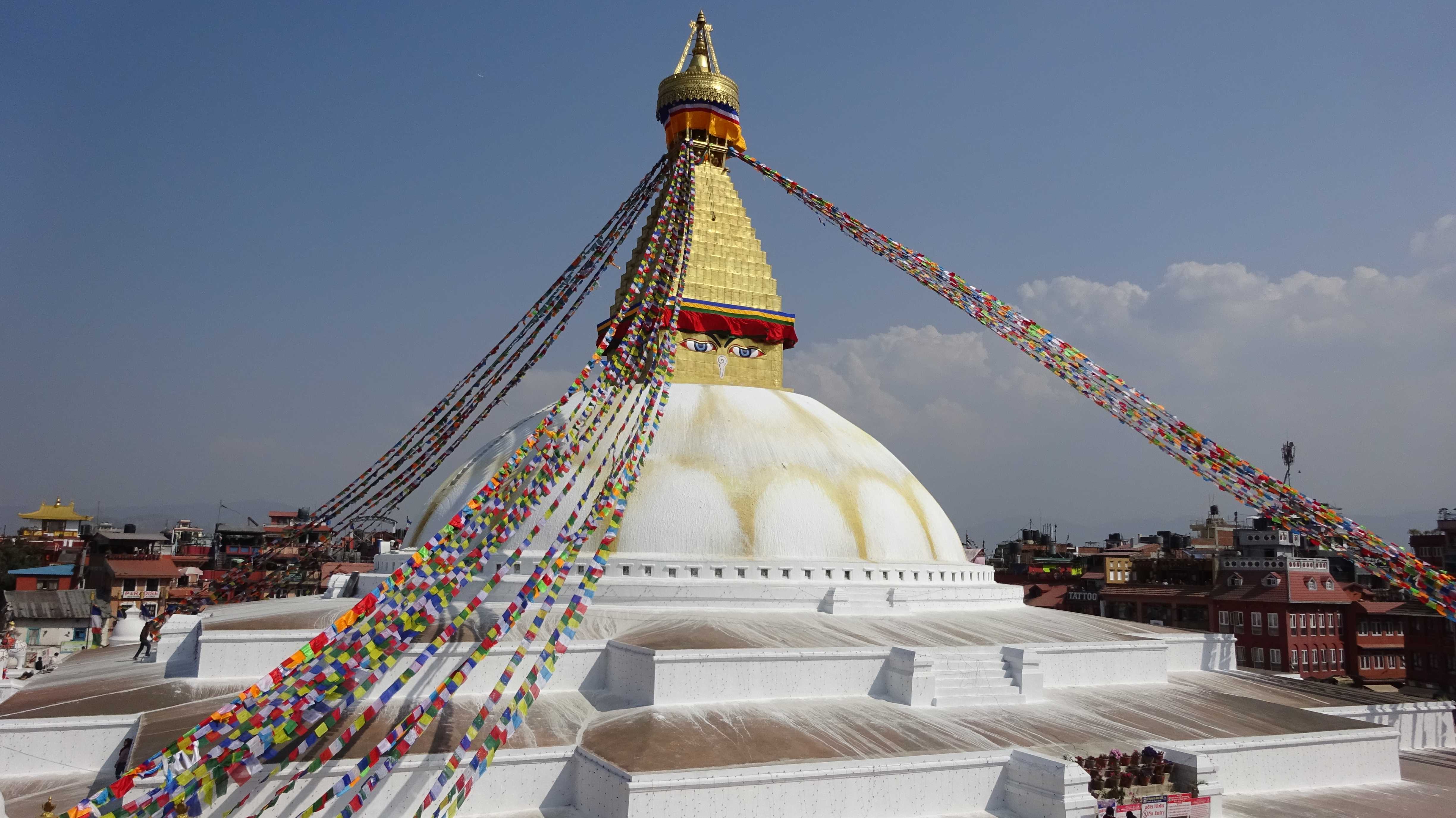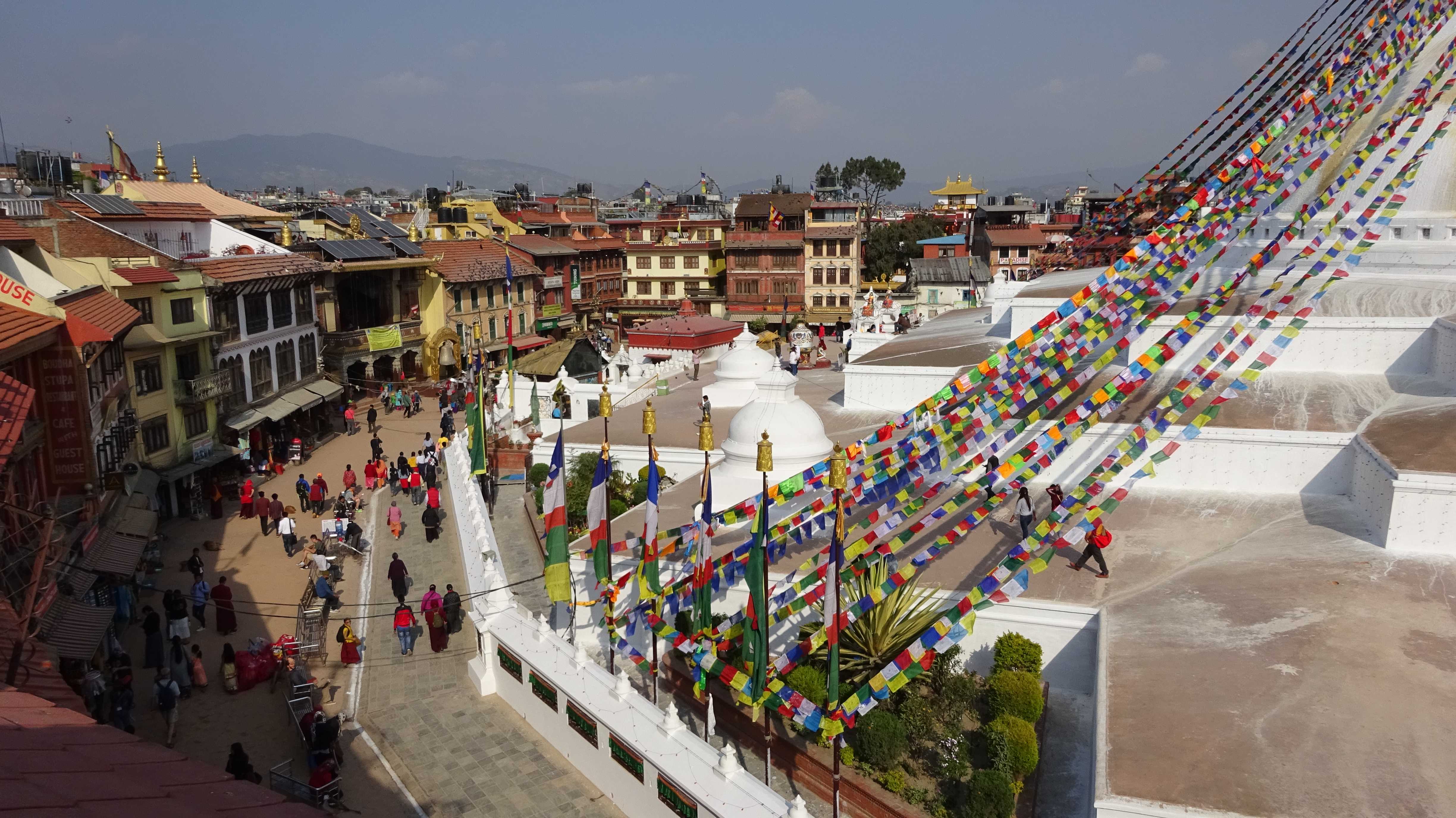 Ziel war der große Buddha-Stupa, rund fünf Kilometer vom Zentrum Kathmandus entfernt. Auch dieser Stupa soll durch das Erdbeben 2015 beschädigt worden sein. Dies erkenne ich allerdings nur an den gestiegenen Eintrittspreisen für das Areal, die angeblich zur Reparatur des Stupas nötig sind. Der Stupa selbst sieht aus wie neu.