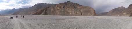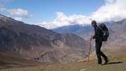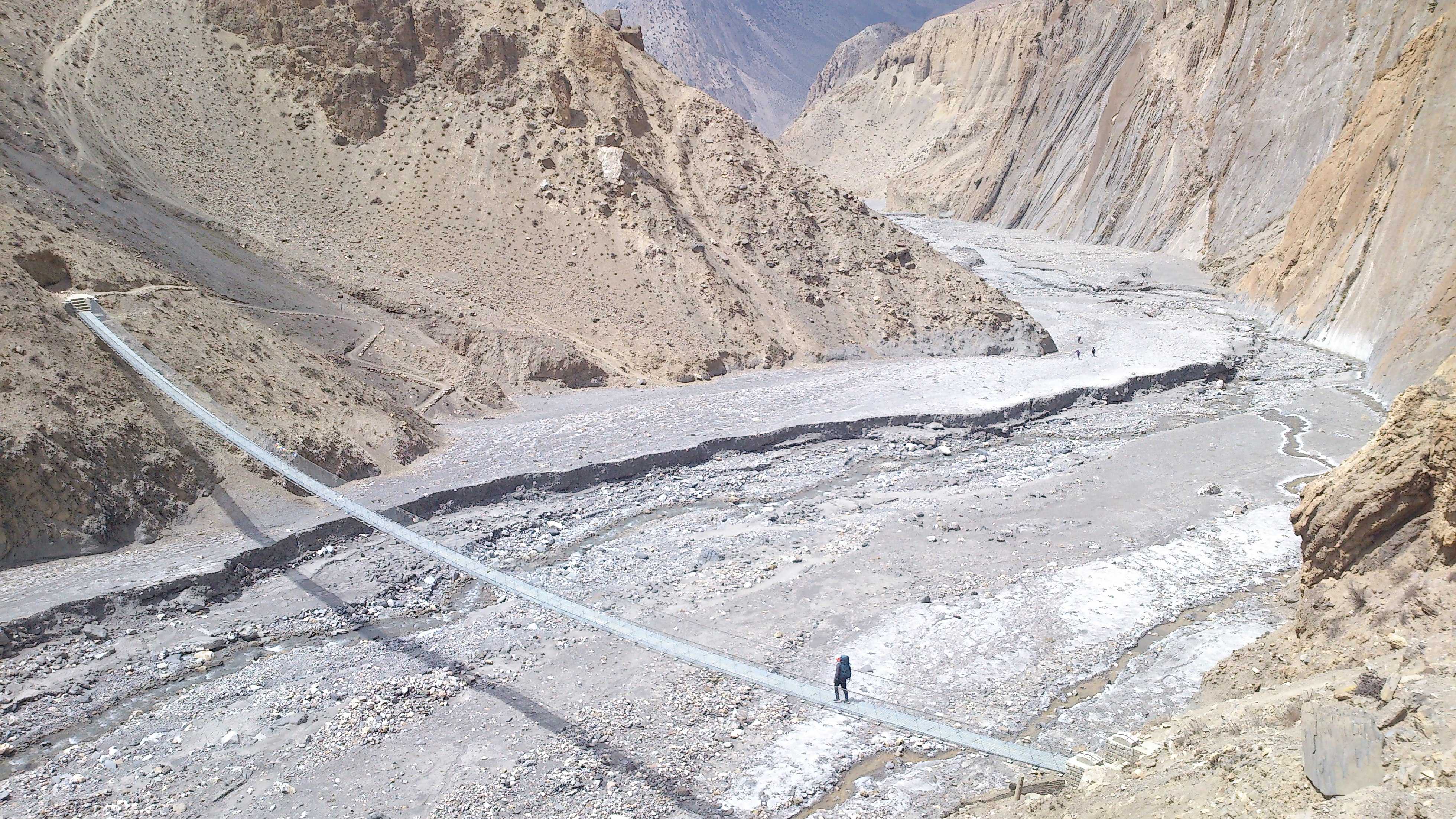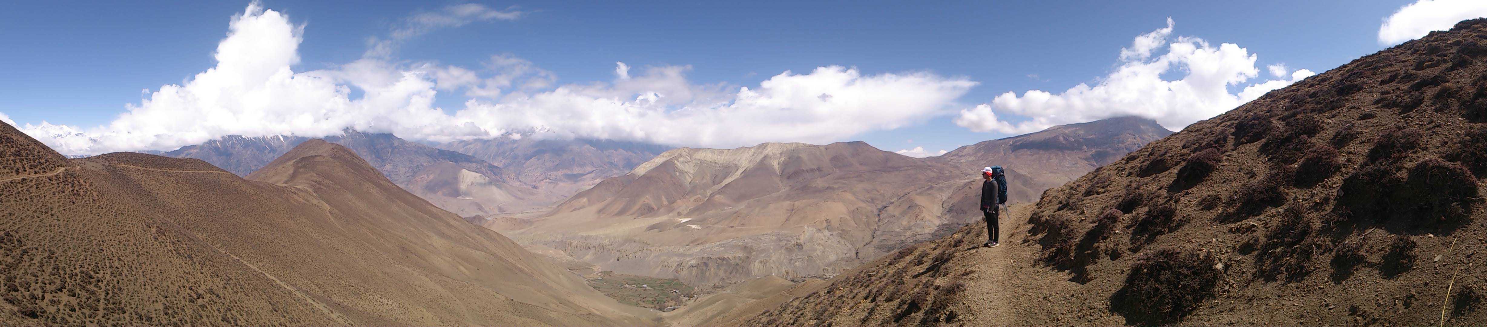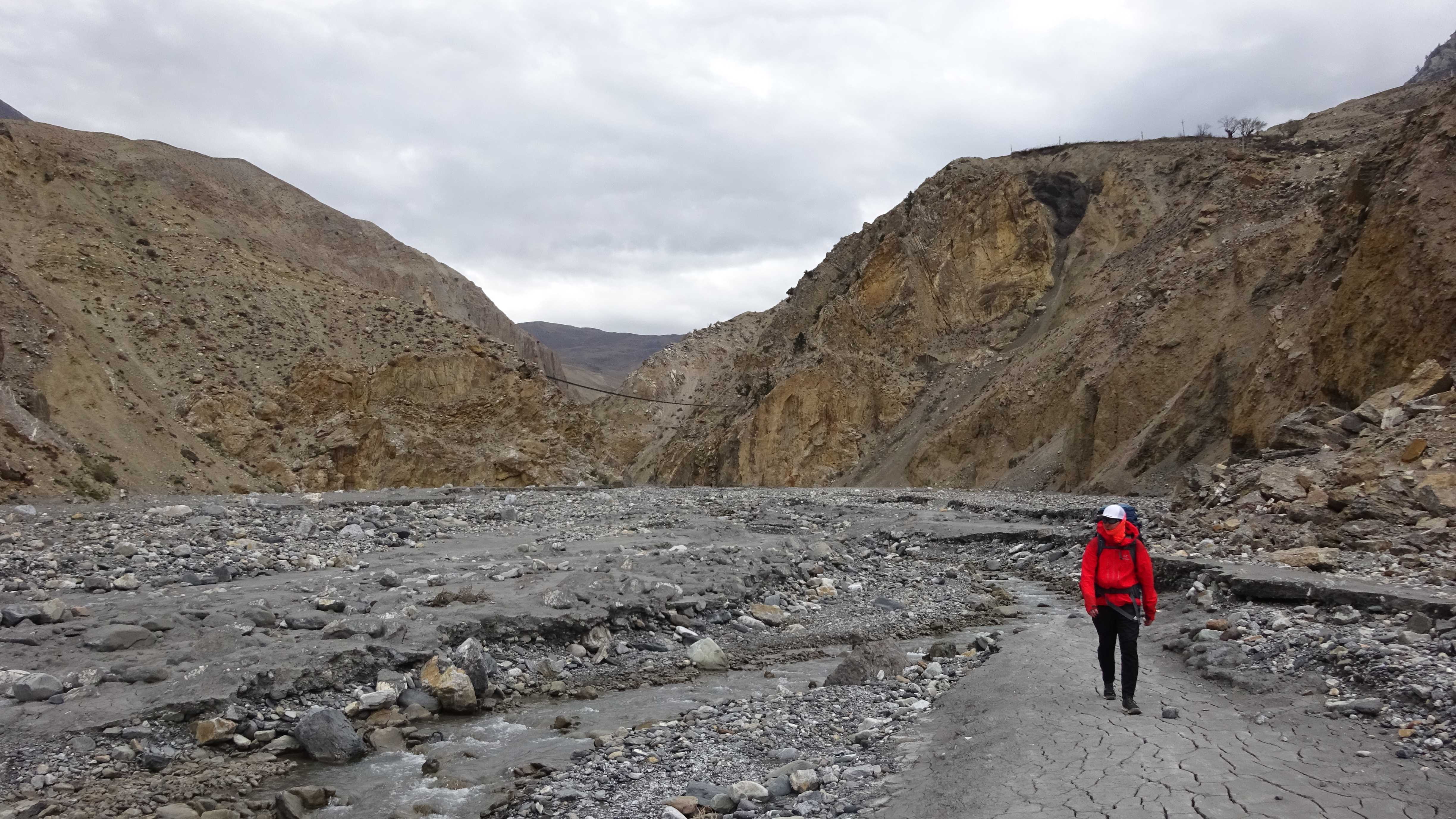Die letzten Kilometer bis Jomsom laufen wir in einem mehr als hundert Meter breiten Flusstal, das bis auf einen kleinen Bach momentan ausgetrocknet ist. Auch das sieht in Marokko genauso aus, nur vielleicht etwas kleiner. Ein kräftiger Gegenwind zerrt an unseren Regenjacken und bläst uns Staub in den Mund, aber kalt ist es nicht mehr, hier auf unter 3000 m.