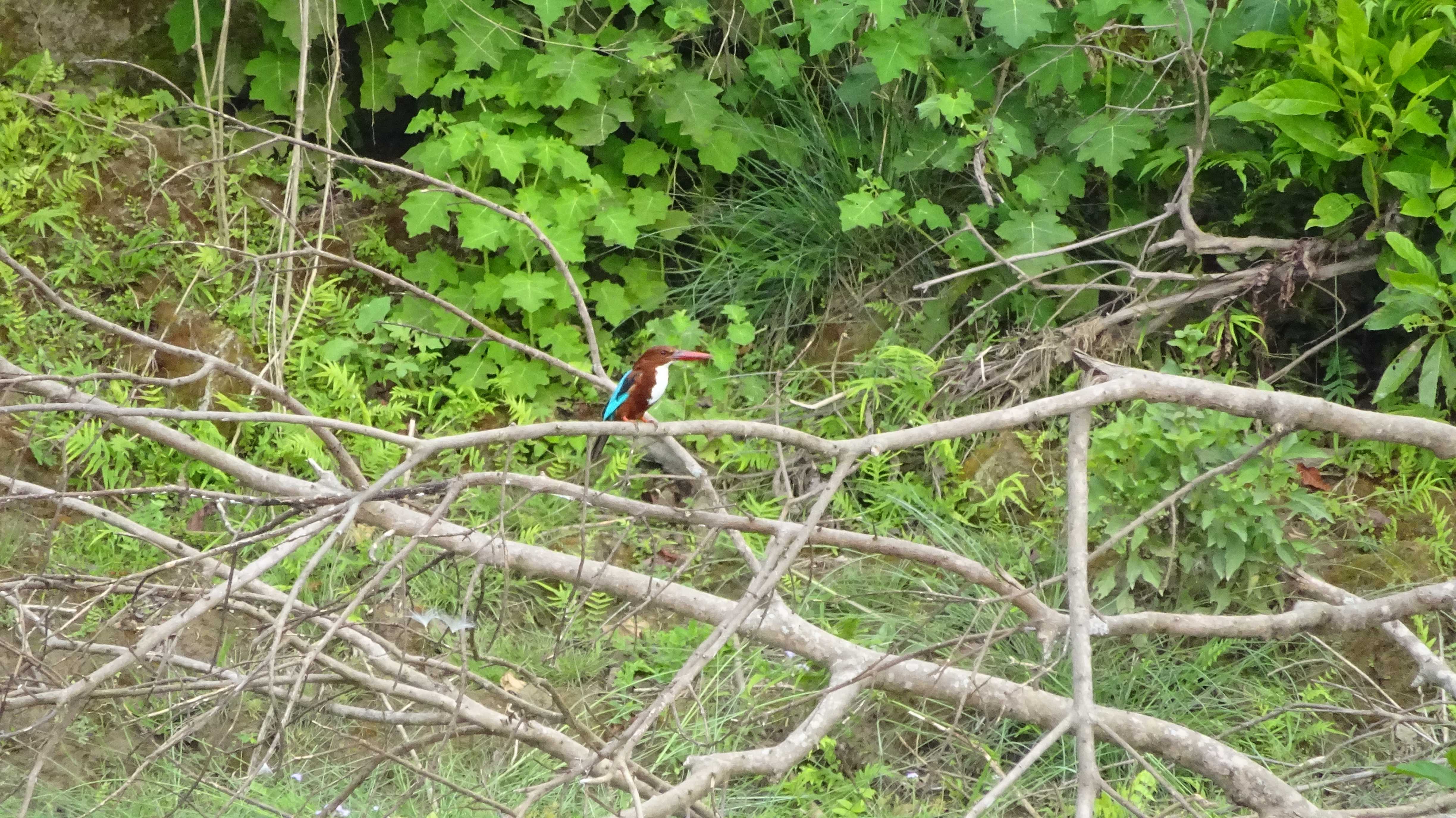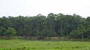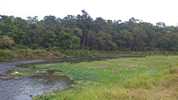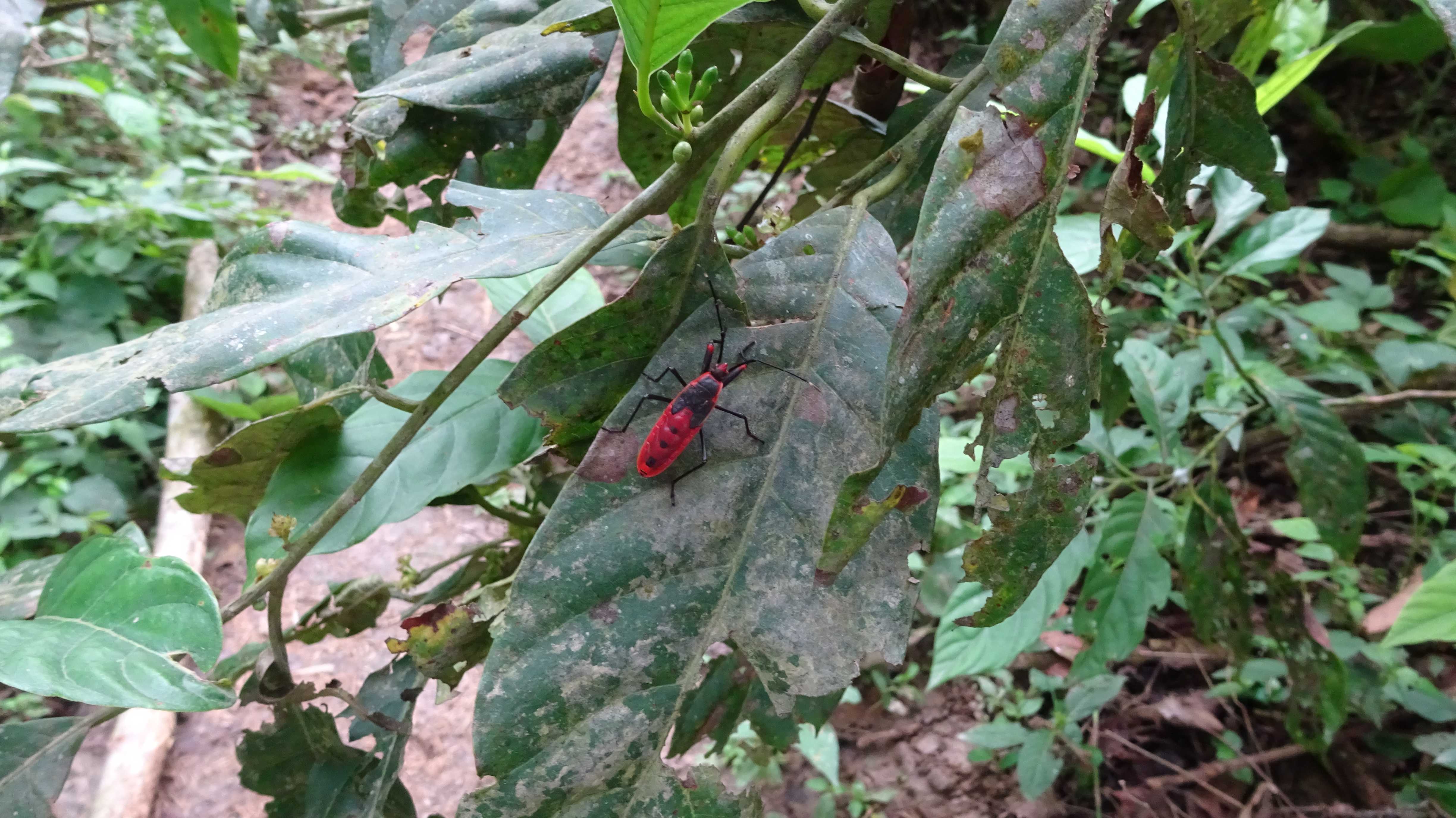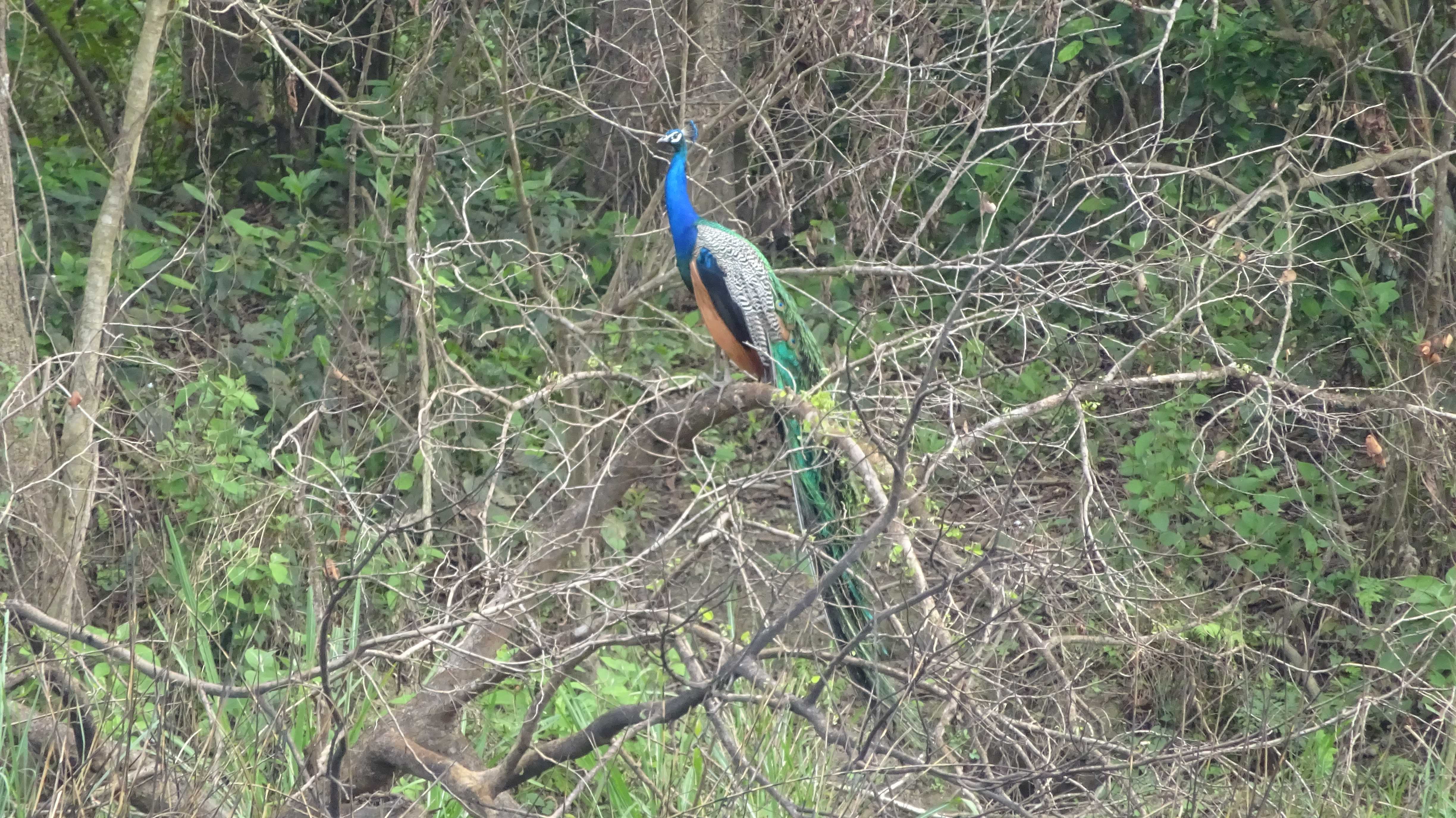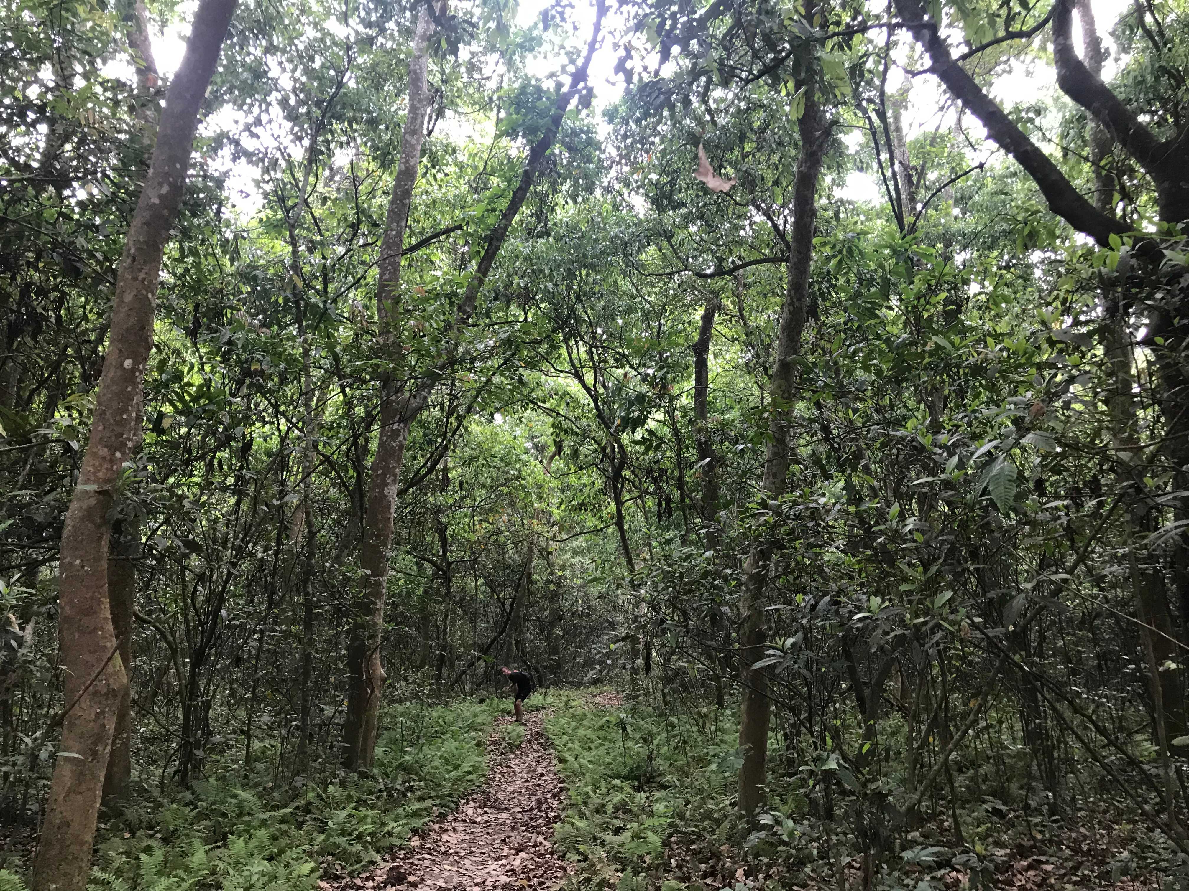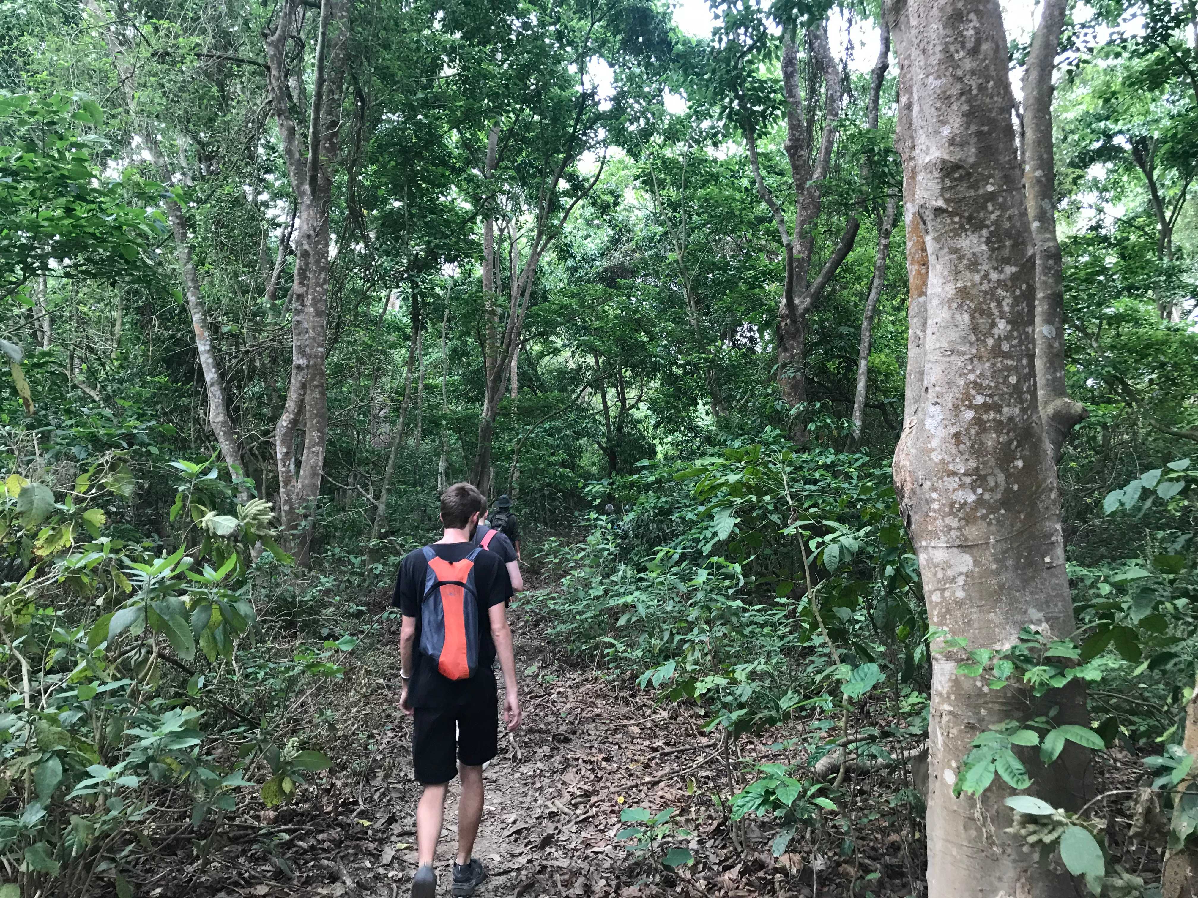 Man gewöhnt sich schnell an die latente Gefahr, der Wald an sich ist nicht besonders beängstigend. Aber er sieht tatsächlich ein bisschen so aus, wie man Regenwälder aus dem Fernsehen kennt. Und abwechslungsreich ist er auch: Wir laufen von dichtem Wald, wo wir links und rechts das Gebüsch streifen, auf weitläufige Lichtungen, die mit knapp zwei Meter hohem Elefantengras bewachsen sind. An Tieren sehen wir einen Pfau, Affen in den Baumkronen sowie viele große rote Käfer. Einmal raschelt es gewaltig im Gebüsch, vielleicht zwanzig Meter entfernt; ich sehe nichts, doch die anderen haben wohl zwei davonrennende Rehe ausgemacht. Aber wir stehen nicht plötzlich direkt vor einem Nashorn, wie wir es in ein paar Erfahrungsberichten gelesen haben. Dieser Nervenkitzel bleibt uns leider verwehrt. Die Flora, die Landschaft, war beim Wandern beeindruckender als die Fauna.