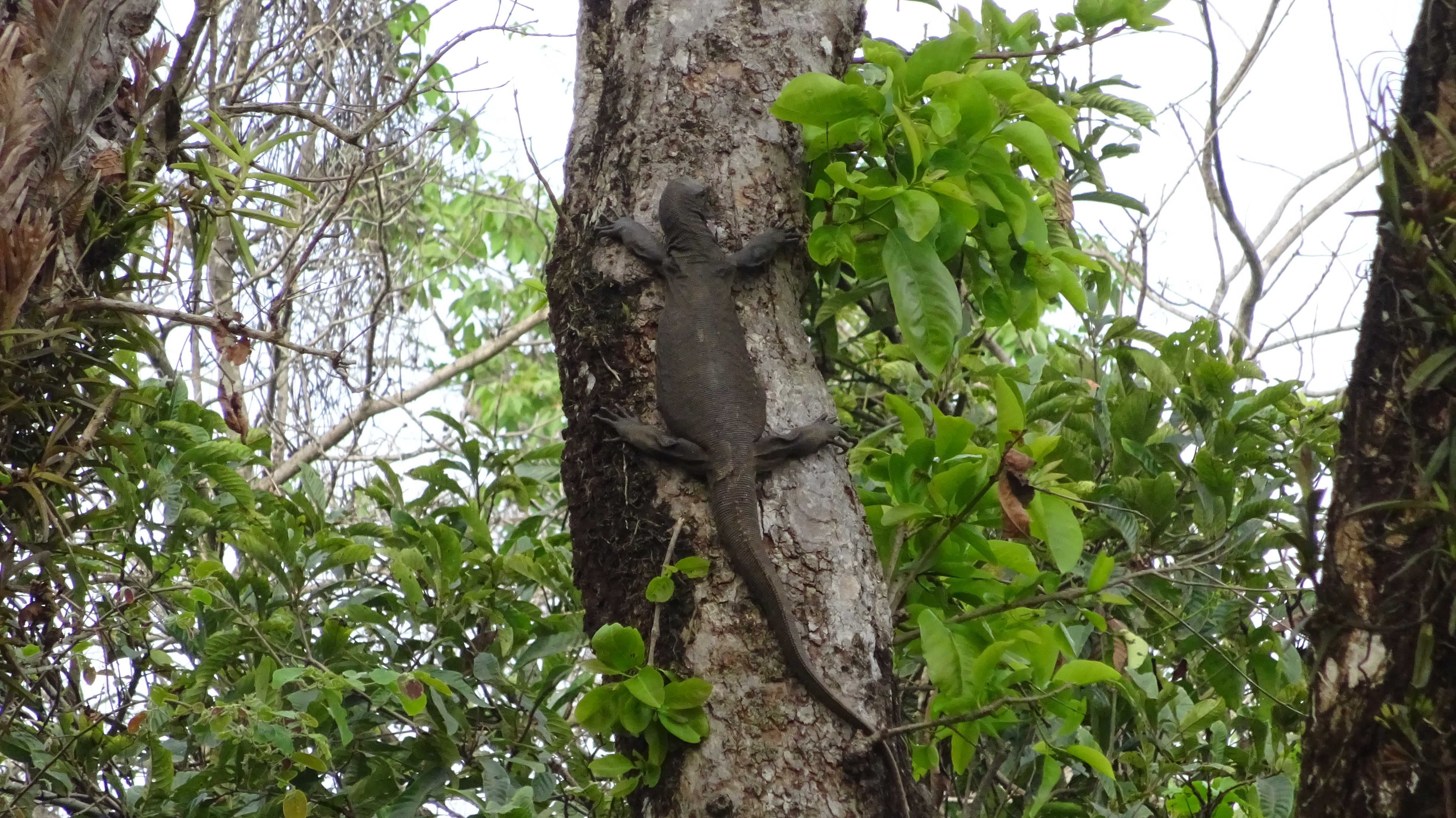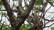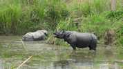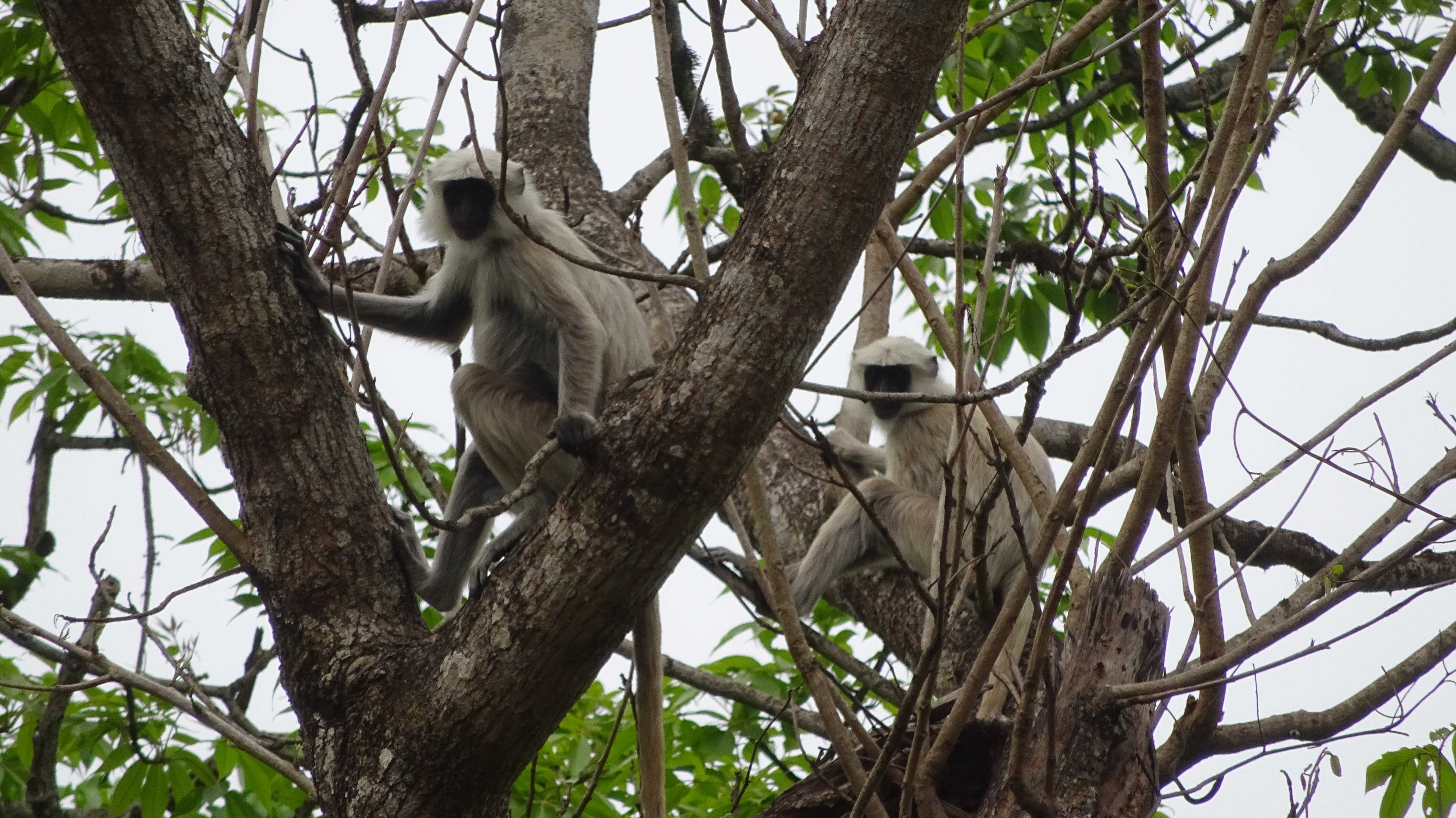 Am Nachmittag haben wir noch eine knapp vierstündige Jeep-Safari im Programm. Auf die Ladefläche eines Pick-up-Geländewagens passen drei Sitzreihen à drei Plätze. Mehrmals erkennt der Guide in der Ferne ein Nashorn und bringt den Jeep zum Stoppen, sodass wir nach dem grauen Fleck im grünen Gras Ausschau halten können. Ein, zwei Mal sehen wir auch ein Nashorn, dass direkt neben der Straße in einem Tümpel liegt. Zudem gibt es wieder Rehe, Pfaue, weiße Affen und einen ziemlich großen Leguan, der neben der Straße an einem Baum hängt. Das Highlight waren sicherlich zwei Nashörner, die wieder erst nur in der Ferne als graue Flecken zu erkennen waren, die sich dann aber gegenseitig in Richtung Straße gejagt haben. In vollem Lauftempo verfolgte der eine den anderen rund hundert Meter vor uns über die Straße. Kurz darauf haben sie sich beide zu unserer Rechten in einem Tümpel von der Verfolgungsjagd erholt; einer der beiden blutete leicht am Hinterleib.