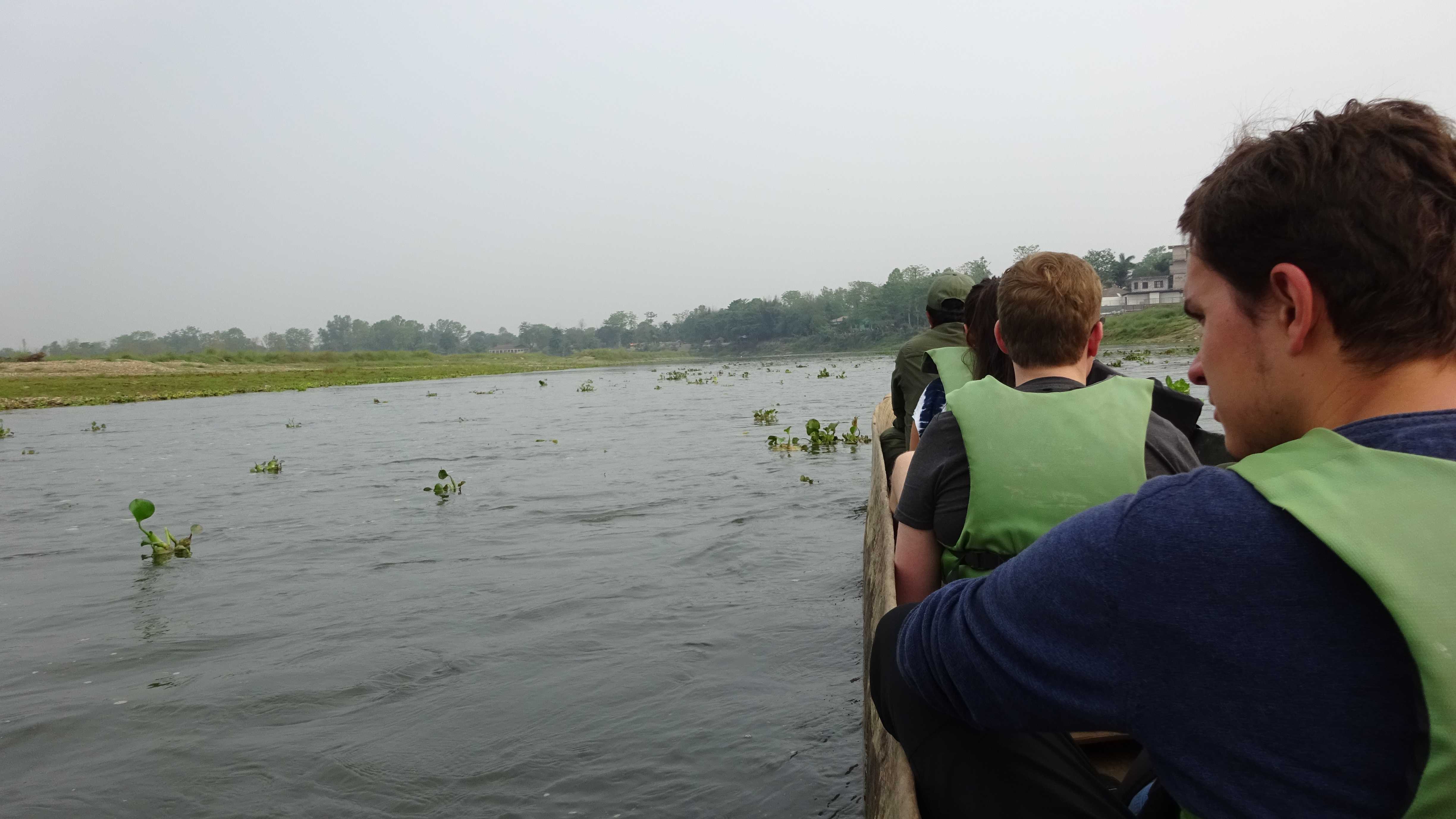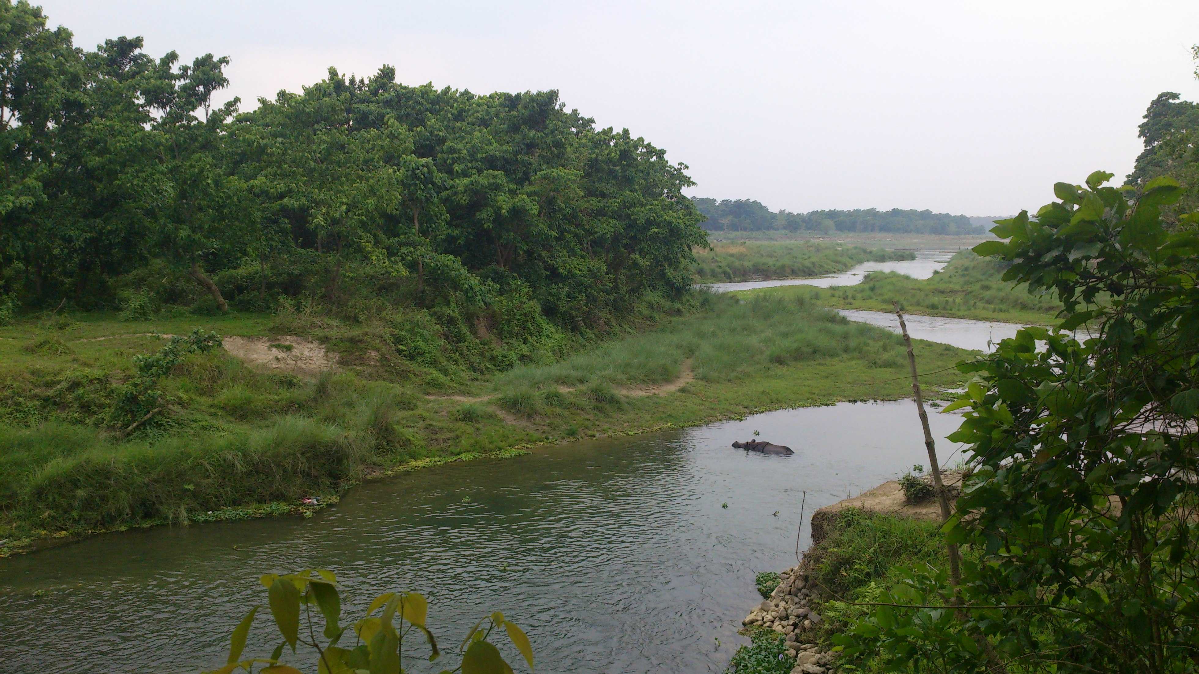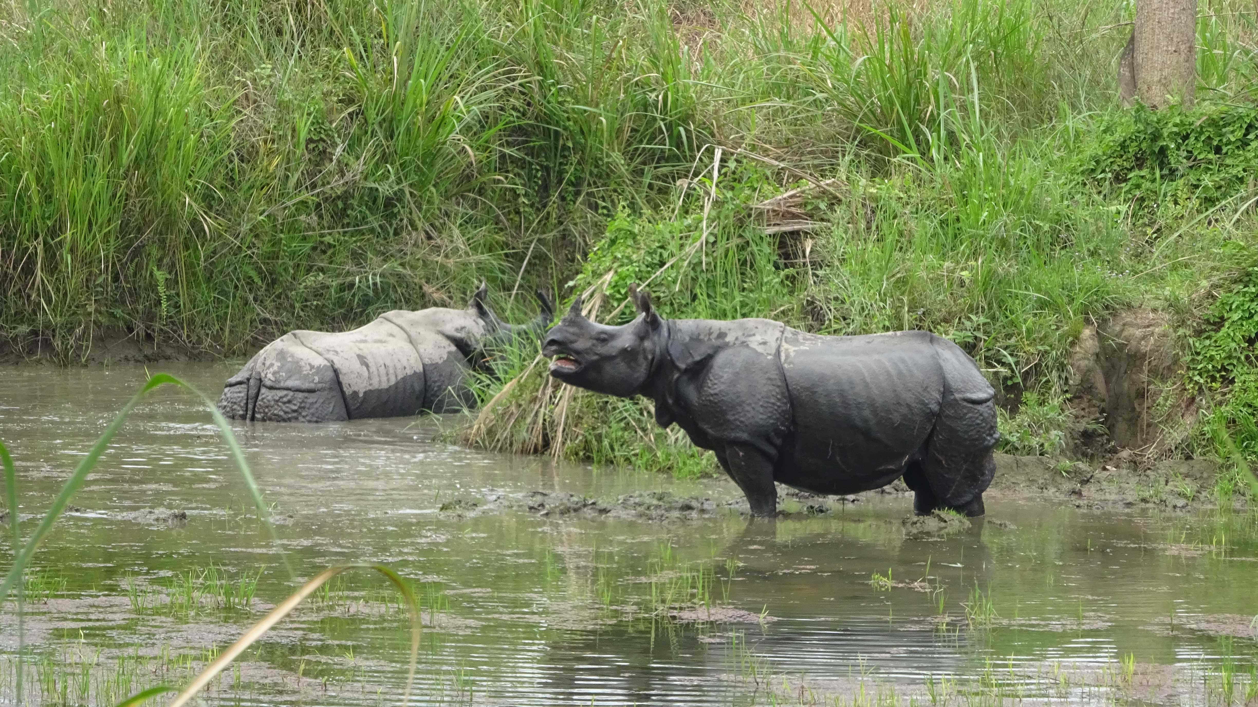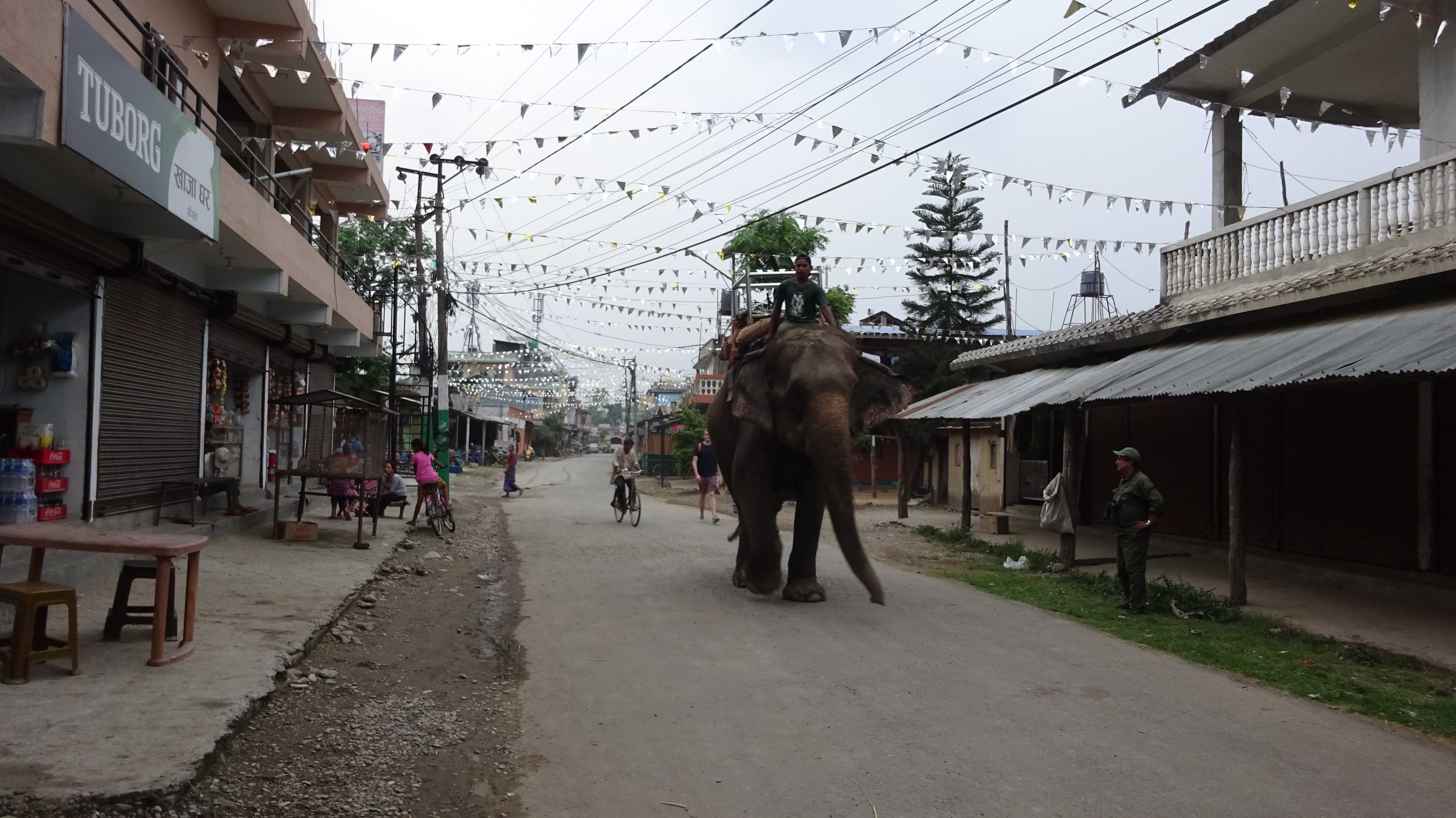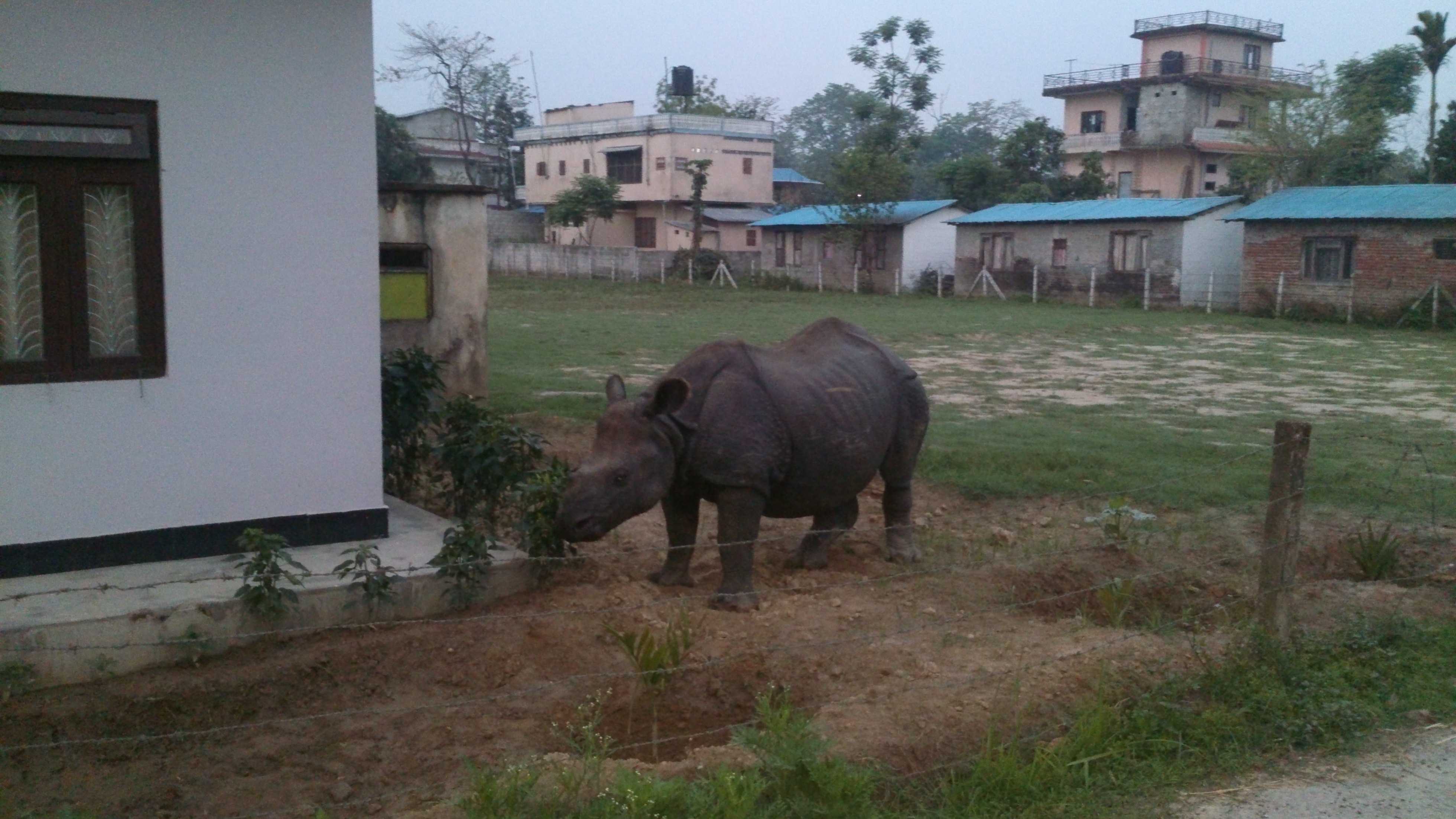 Es ist 05:48 Uhr, als wir von „Rhino, Rhino“-Rufen geweckt werden. Der Kellner rennt im Innenhof unserer Lodge umher und schmeißt die Gäste aus ihren Betten – gut, das sind eigentlich nur ein britisches Pärchen und wir. Wir schnappen uns die Kamera und rennen, angezogen von dem Enthusiasmus, der in den Rufen des Kellners liegt, nach draußen. In Nachbars Garten steht ein Nashorn aus dem angrenzenden Nationalpark, das unserem Dorf einen Besuch abgestattet hat. Wir bestaunen es von der Straße aus zusammen mit rund zwanzig Nepalesen, viele davon Kinder. Keine zehn Meter entfernt frisst der Koloss an einem Strauch. Was für ein Glück wir doch haben, denken wir uns; wir fragen den so begeisterten Kellner, wie oft das vorkommt, dass ein Nashorn hier mitten im Dorf steht. „Och, die kommen eigentlich jede Nacht, um das Maisfeld zu plündern“, meint er grinsend.