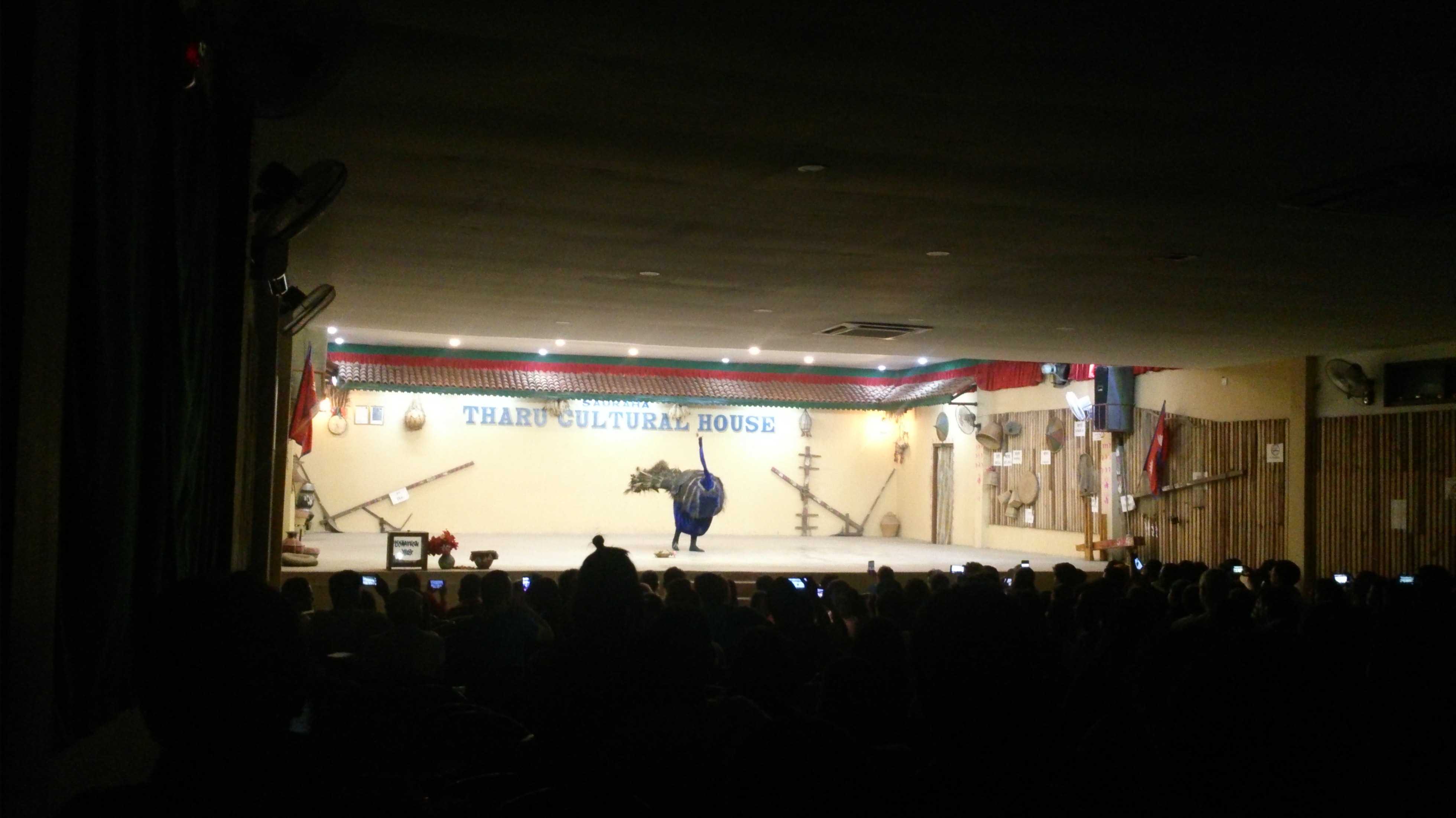 Am Abend steht noch „Cultural Dance“ auf dem Programm und wir sitzen mit Dutzenden anderen Touristen, die den Tanz nicht unbedingt sehen wollten, sondern anwesend sind, weil er im All-Inclusive-Package gebucht wurde, in einer Halle. Eine Frau in vermutlich traditionellen Gewändern betritt die Bühne und kündigt den ersten Tanz an – was wir jedoch rein aus dem Kontext schließen können. Wegen der Übersteuerung der Mikrofonanlage und ihrer Aussprache des Englischen verstehen wir absolut kein Wort. Ein Trommler betritt die Bühne und trommelt los, kurz darauf erscheinen ein Dutzend junge Frauen und bewegen sich im Kreis herum um den Trommler. Nach ein paar Minuten kommt der nächste Tanz an die Reihe und so weiter, wobei alle nach dem gleichen Muster – Trommler und im Kreis tanzen – verlaufen. Nur eine Vorstellung sticht heraus und übertrifft die anderen, die halbwegs seriös waren, an Albernheit bei Weitem: Ein als Pfau verkleideter Nepalese wiegt sich im Takt zu einer ziemlich kindischen Melodie. Er tänzelt nach links und rechts und übergibt mit seinem Schnabel zum Abschluss einer Frau in der ersten Reihe eine Rose. Ich hab mich noch nie so sehr als Club-Urlauber gefühlt.