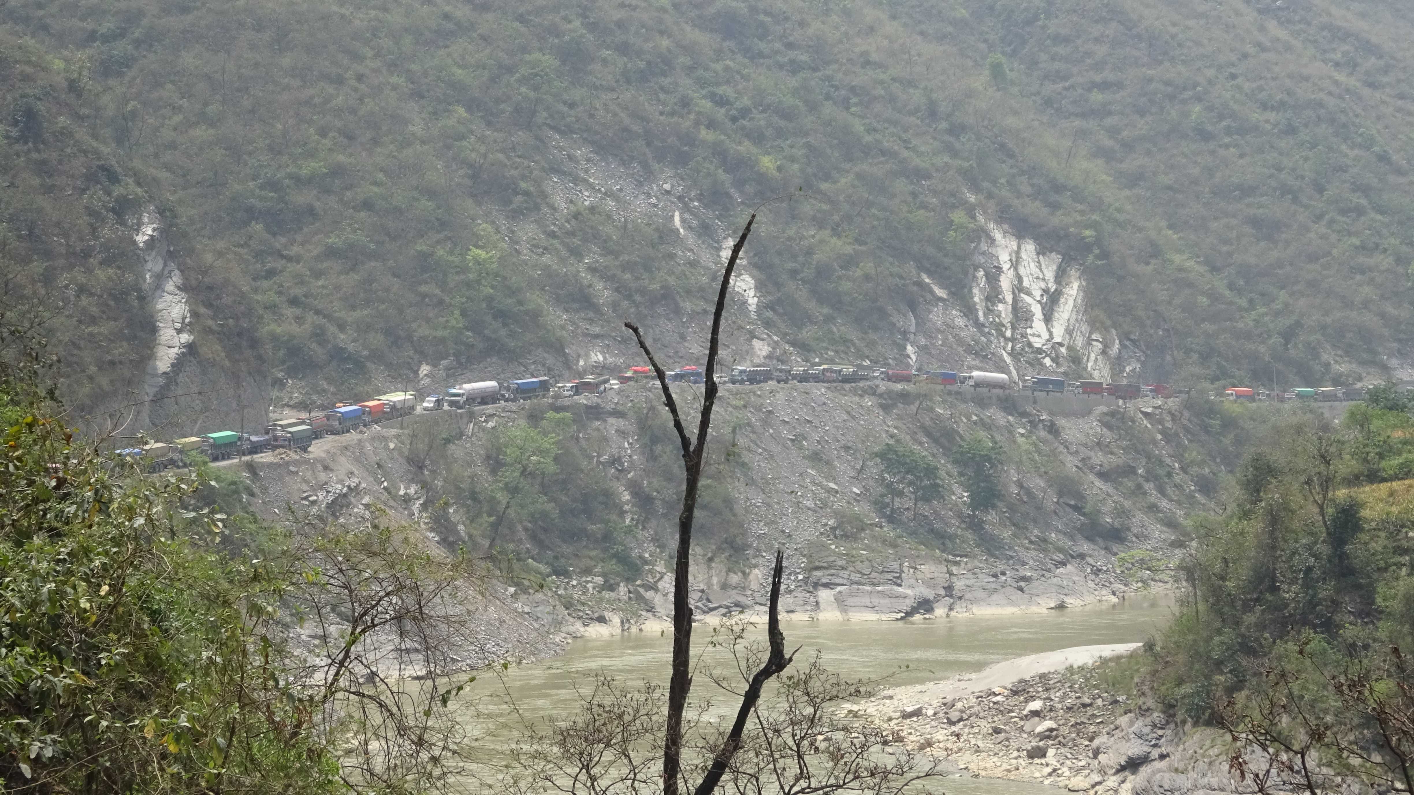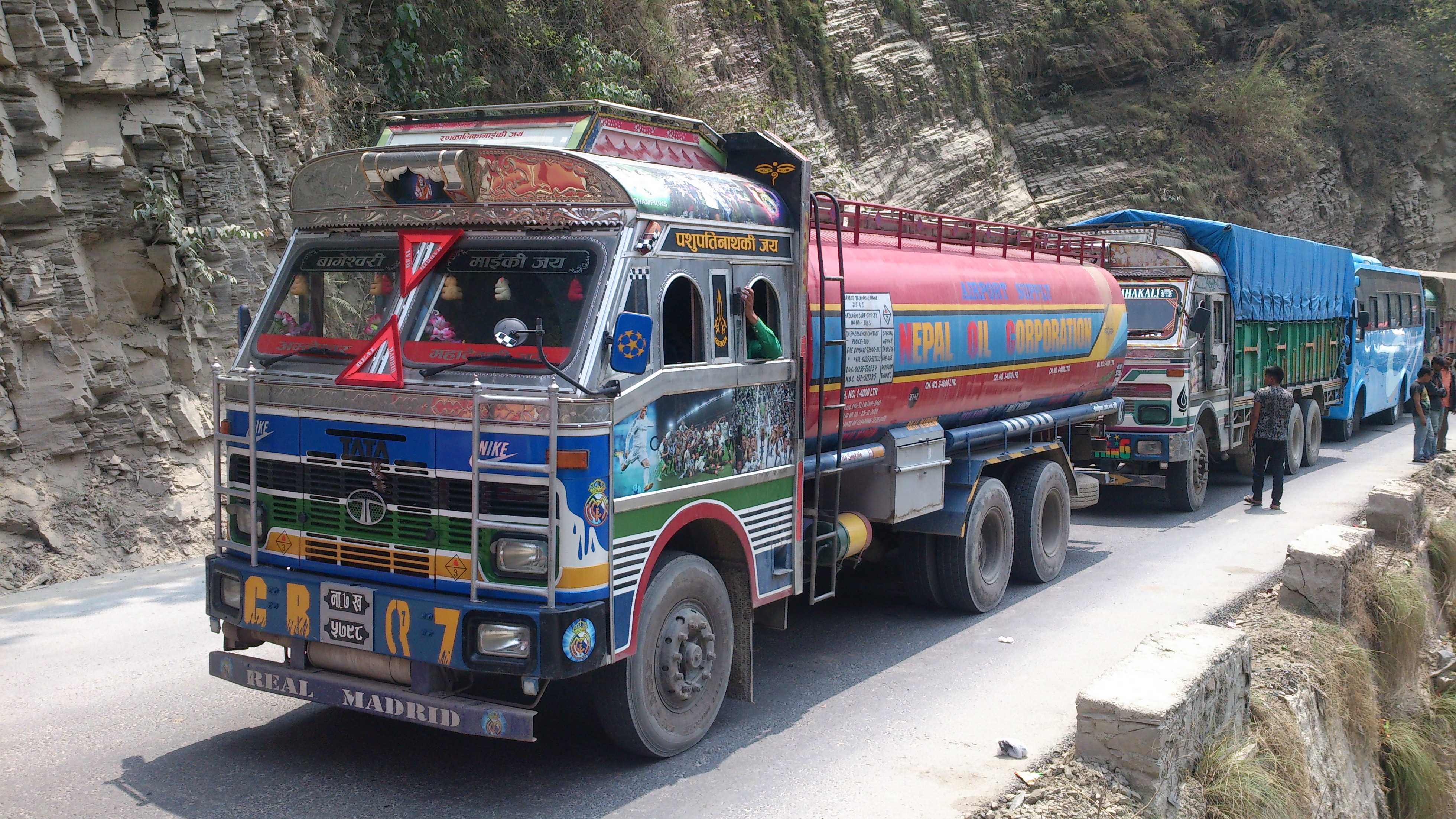 Obwohl geteert und mehr oder weniger schlaglochfrei, ist eine Fahrt auf diesen Straßen nicht mit einer Fahrt in Deutschland vergleichbar. Es sind Bergstraßen mit ständigen Steigungen und engen Kurven. Gleichzeitig sind es aber die besten Straßen, die Nepal zu bieten hat, und entsprechend ist der LKW-Anteil immens. Die stets kurios bunt geschmückten, indischen Tata-LKW haben sichtlich mit den Steigungen zu kämpfen – mehr noch, als die indischen Tata-Busse, in denen wir sitzen. Also gilt es dem natürlichen Instinkt des Menschen folgend, die LKW zu überholen, wobei sich wiederum die vielen engen Kurven als problematisch herausstellen.