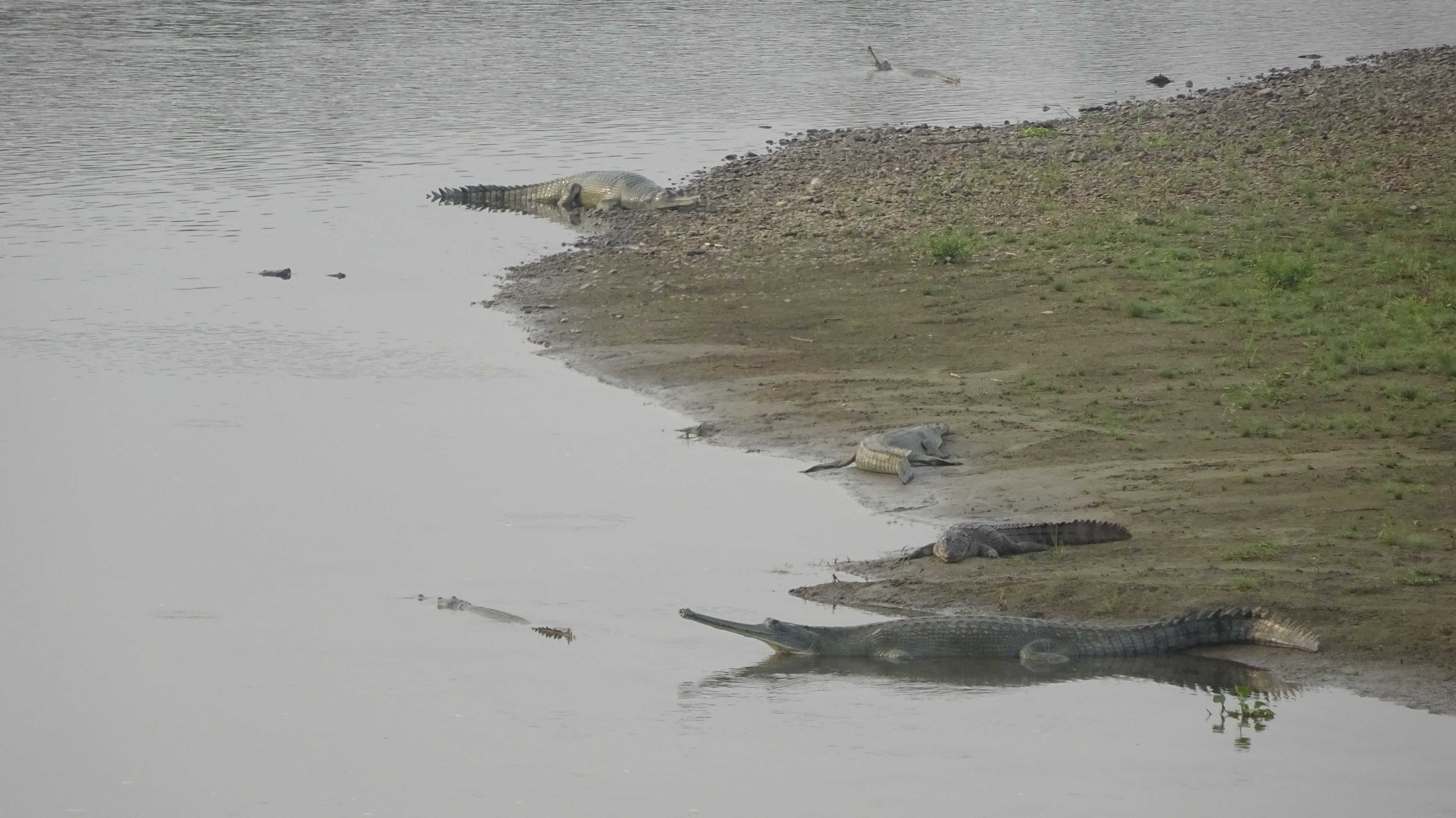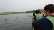 Unsere Safari beginnt mit einer Kanufahrt; zusammen mit den Briten und unserem obligatorischen Guide sitzen wir in einem Kanu, das von einem Ruderer angetrieben wird, der hinten auf der Kanubordwand steht. Gemächlich treiben wir den Fluss hinab, vorbei an ein paar Krokodilen, die bewegungslos am Ufer liegen. Vom Fluss aus sehen wir vor allem Vögel, darunter einen Kormoran, einen Storch, mehrere Eisvögel, kleinere Papageien und Bienenfresser.