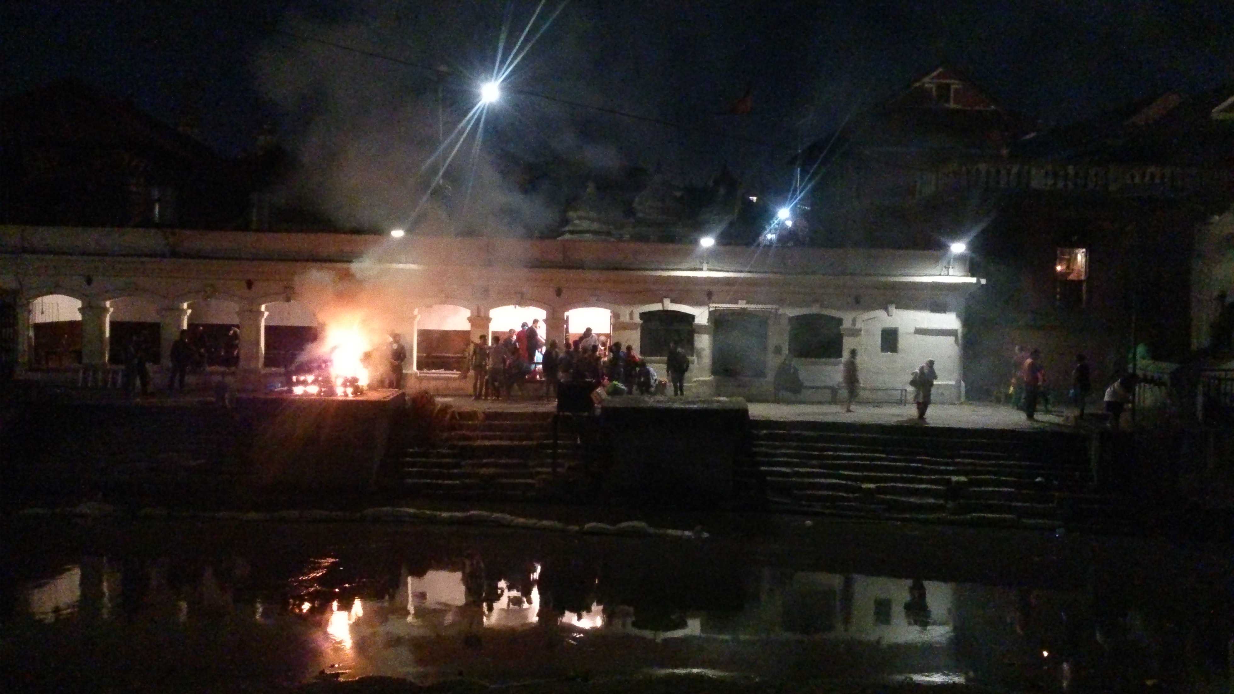 Das rechte Flussufer besteht aus einer Treppe mit rund zehn Stufen. Am oberen Ende der Treppe liegt die Leiche auf dem Boden, als wir kommen, eingehüllt in ein gelb-orangenes Tuch. Auch das linke Flussufer besteht aus einer Art „Treppe“, deren „Stufen“ rund 1,50 Meter hoch und tief sind. Sie dient als Tribüne; wir gesellen uns zu dutzenden Nepalesen, die hinüber zur Leiche blicken.