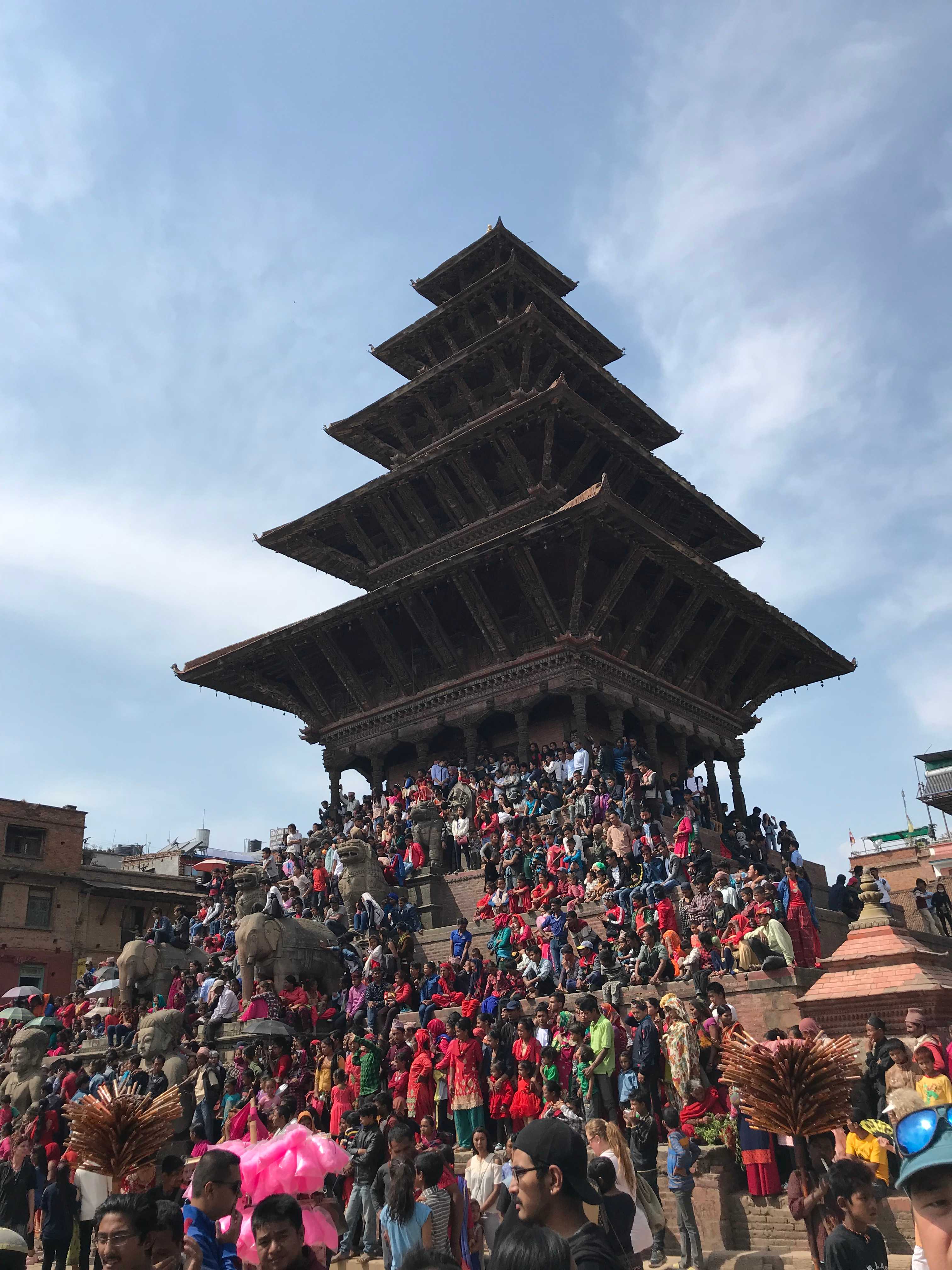 Auf dem Hauptplatz Bhaktapurs ist eine Bühne aufgebaut und es werden Tänze zu Ehren des neuen Jahres aufgeführt. Der ganze Platz davor ist voll mit Leuten. Und die sind vermutlich alle aus Kathmandu mit dem Bus angereist. Mit unserem Bus. In den nepalesischen Bussen gibt es neben dem Fahrer immer auch eine Art Schaffner, der aus der Tür heraushängt, den Leuten am Straßenrand das Fahrtziel entgegenschreit und abkassiert. In diesem Fall war es auch seine Aufgabe, möglichst viele Leute in dem Bus unterzubringen. Immer wieder treibt er die im Mittelgang stehenden Leute in dem proppenvollen Bus enger zusammen und schafft so weitere fünf Stehplätze, was wir bereits drei Haltestellen zuvor nicht mehr für möglich gehalten hätten. Wir stehen ebenfalls im Mittelgang, ich mit leicht geneigtem Kopf, da die Busdecke ein paar Zentimeter niedriger als meine Körpergröße ist. Einmal muss ich mich auf Zehenspitzen stellen, damit eine junge Frau aus dem hinteren Busteil, die gerne aussteigen würde, beim Vorbeidrängen den Platz findet, ihre Füße abzustellen. Eine ältere Frau, die uns etwa bis zum unteren Ende des Brustbeins reicht, hält sich mit beiden Händen an Valentins T-Shirt fest. Nach ein paar Zustiegen wird sie etwas zu mir gedrängt und greift mit einer Hand um, hat nun auch mein T-Shirt in der Hand. Schließlich lehnt sie auch ihren Kopf an meinen Bauch und ihr roter Punkt auf der Stirn hinterlässt einen Abdruck auf meinem T-Shirt.