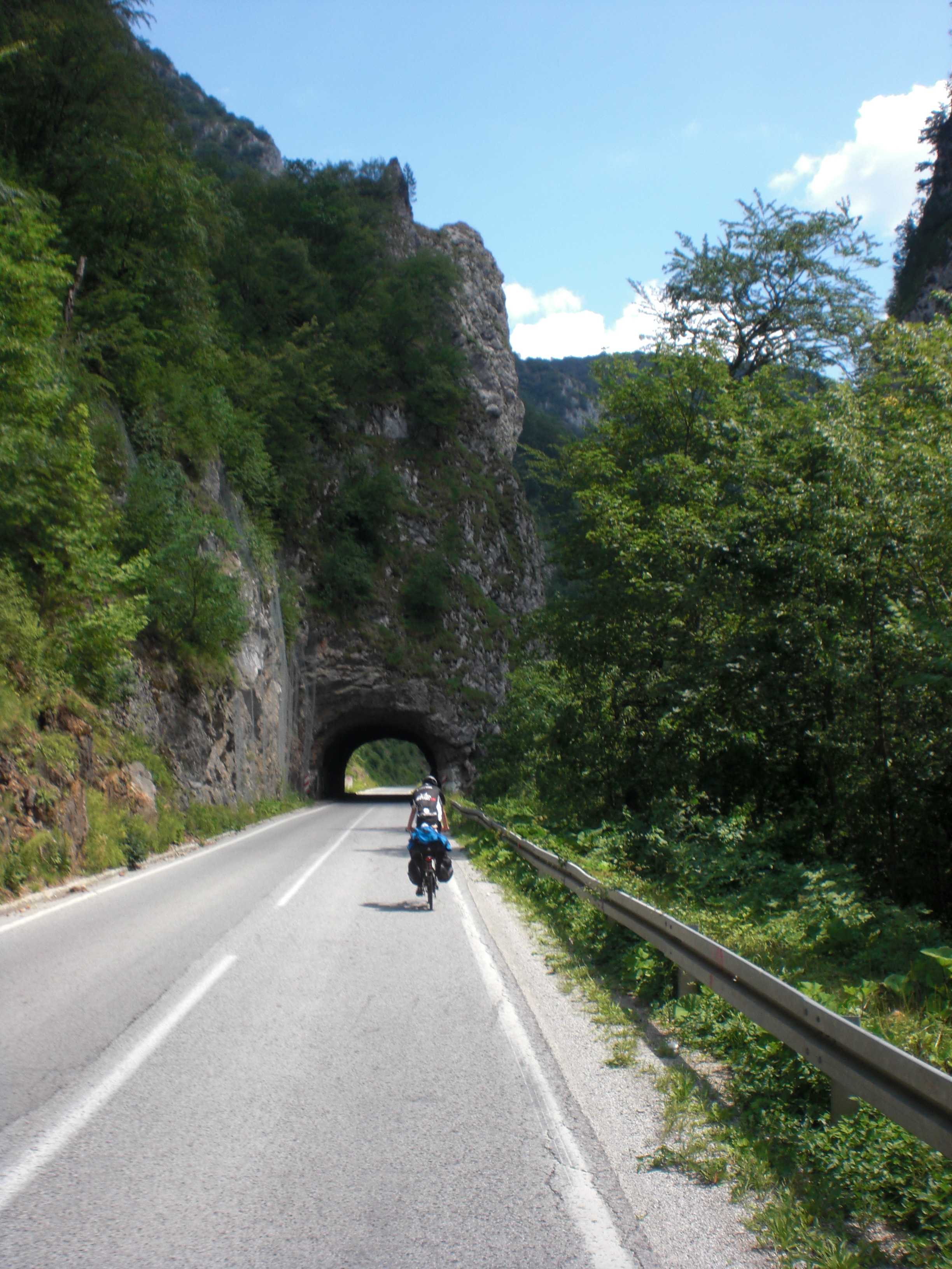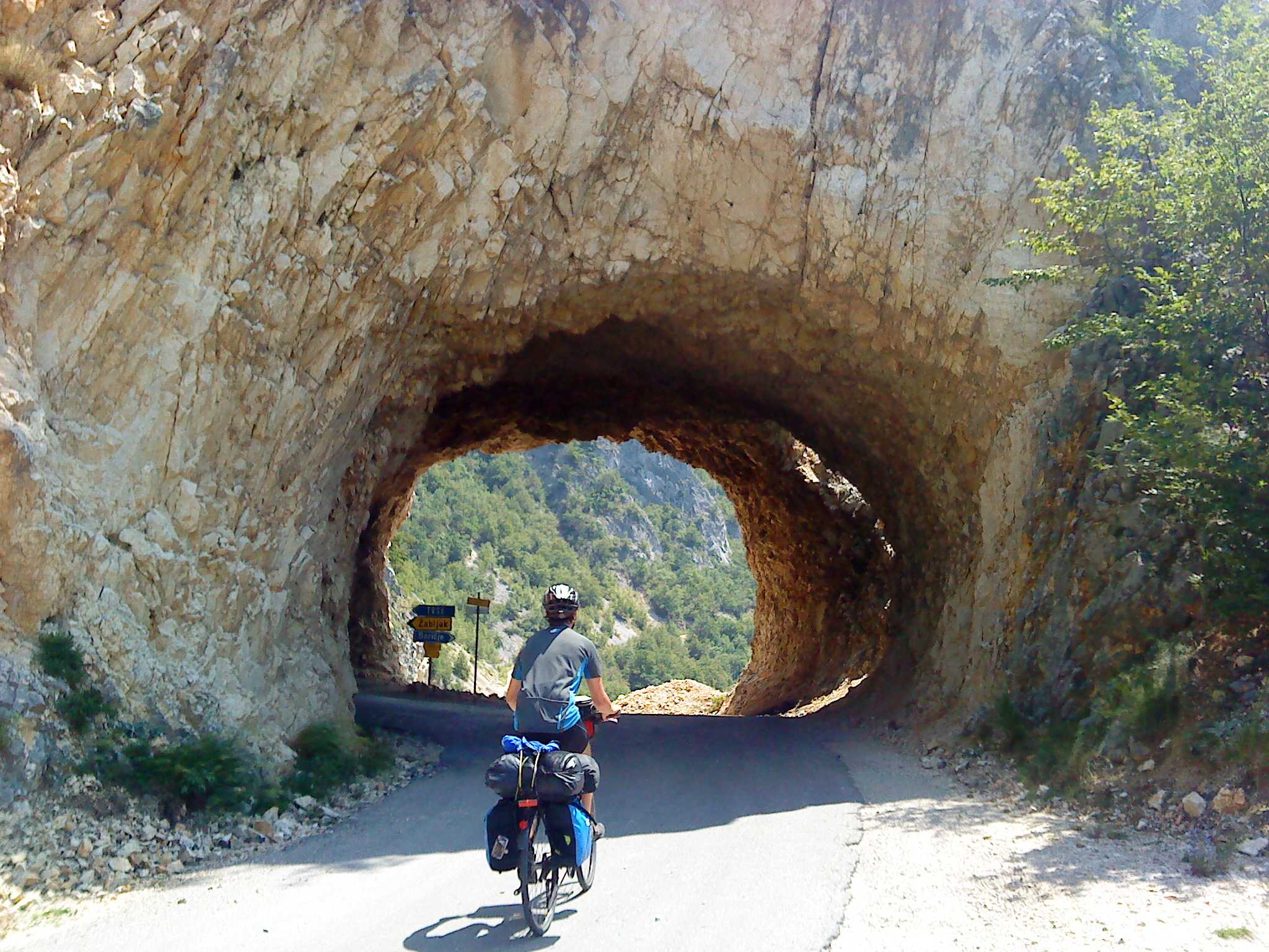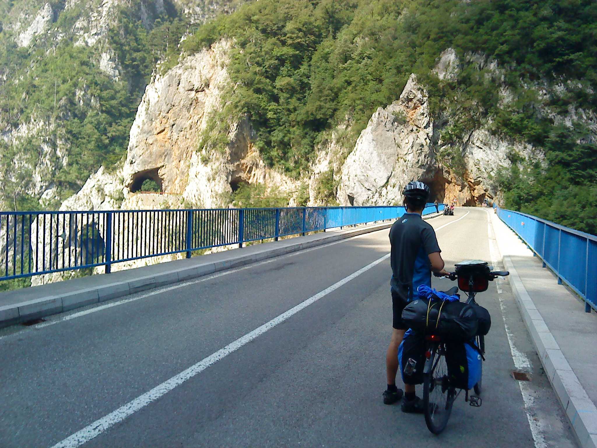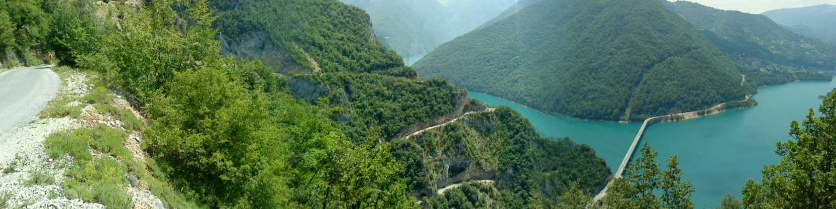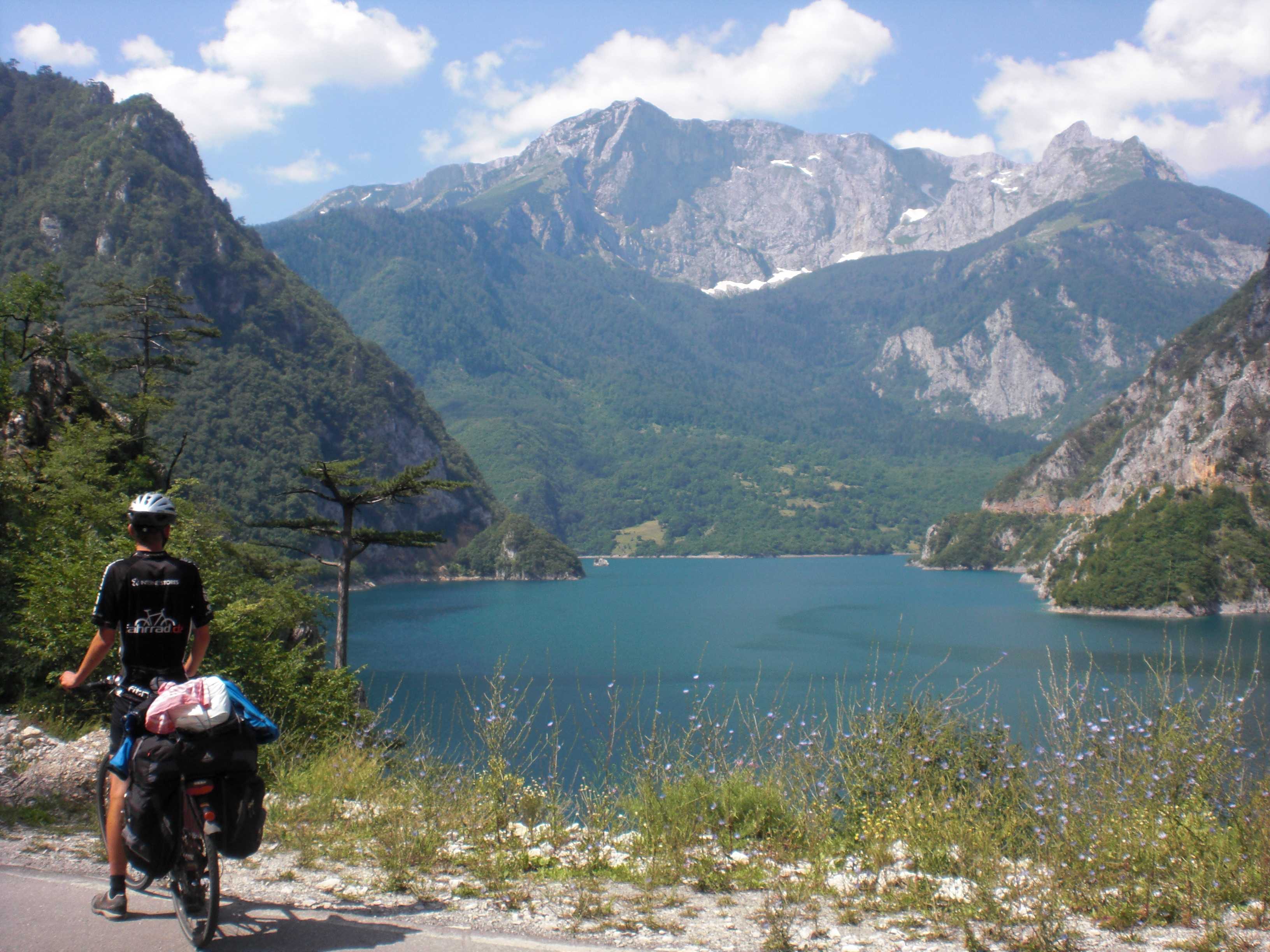 Doch Montenegro bietet sogleich eine überwältigende Ablenkung: Eine Brücke spannt sich in großer Höhe von der einen auf die andere Seite der Schlucht. Auf der anderen Seite mündet sie in einen steinernen Tunnel, einfach so ohne Verkleidung in den Felsen gesprengt. Wie sich herausstellen soll, die übliche Bauweise in Montenegro. Wir fahren entlang von steilen Felswänden durch mindestens 15 Tunnel. Alle 100 m halten wir kurz für ein Foto. Es ist wirklich ein grandioser Traum für einen Radfahrer. Schließlich erreichen wir eine Staumauer; ab hier fahren wir entlang eines Sees: Wieder türkises Wasser, das kennen wir mittlerweile gut. Und wieder dutzende Tunnel.