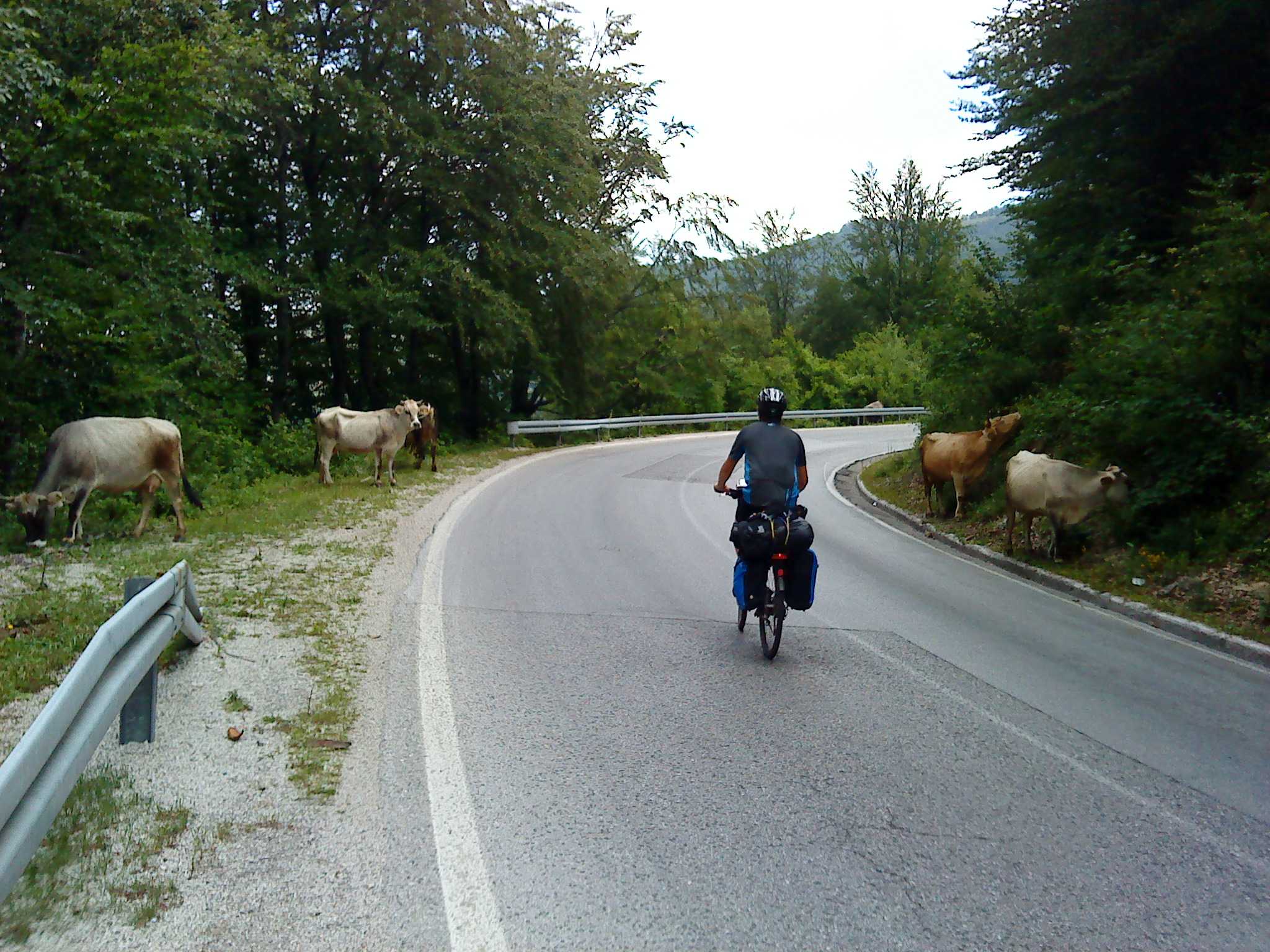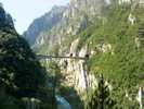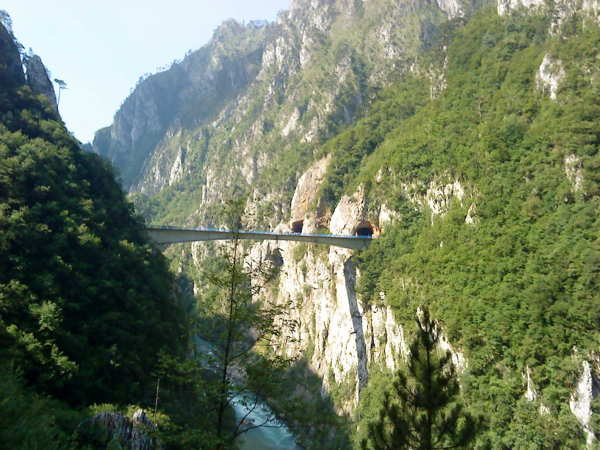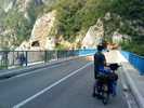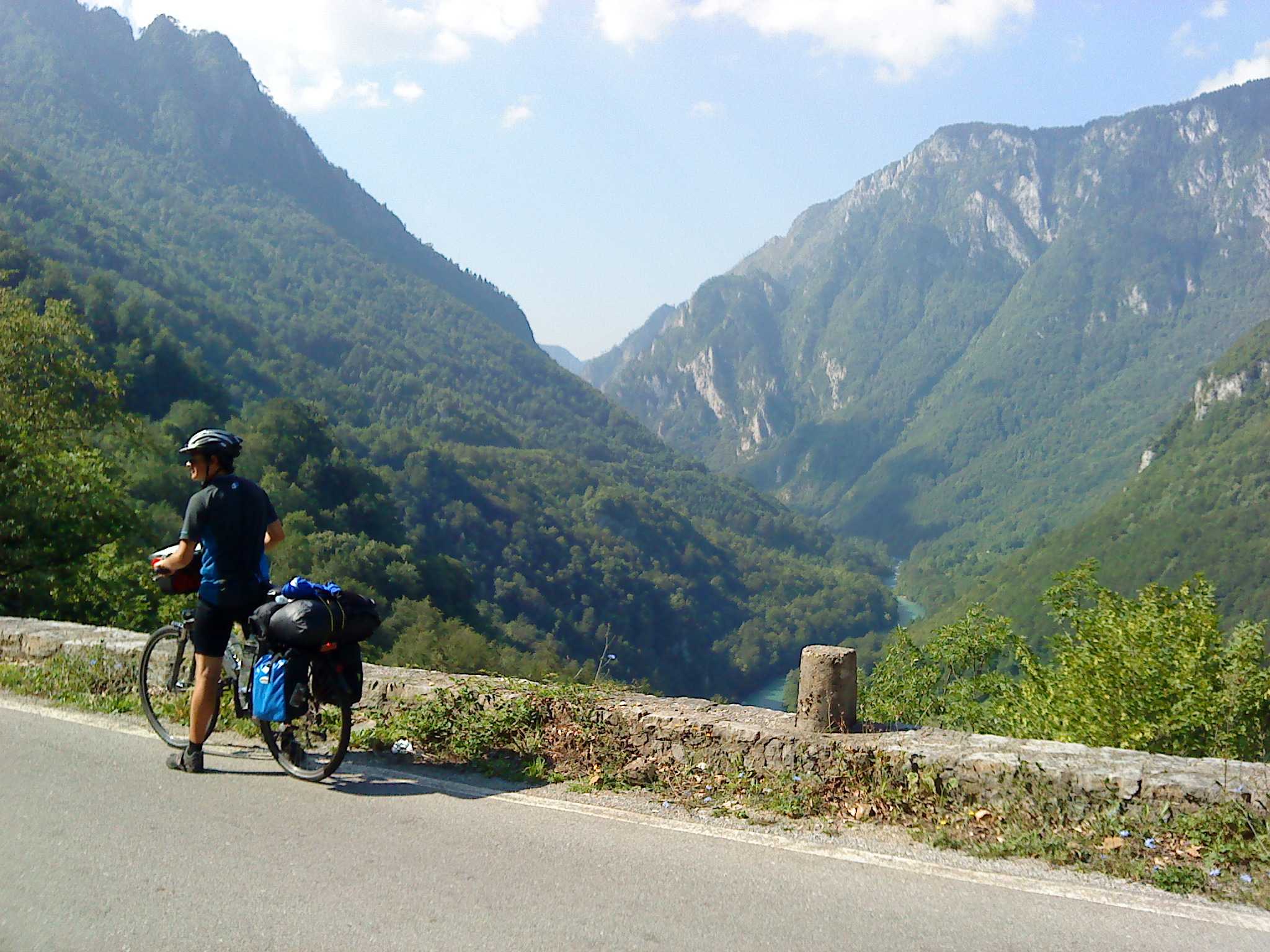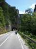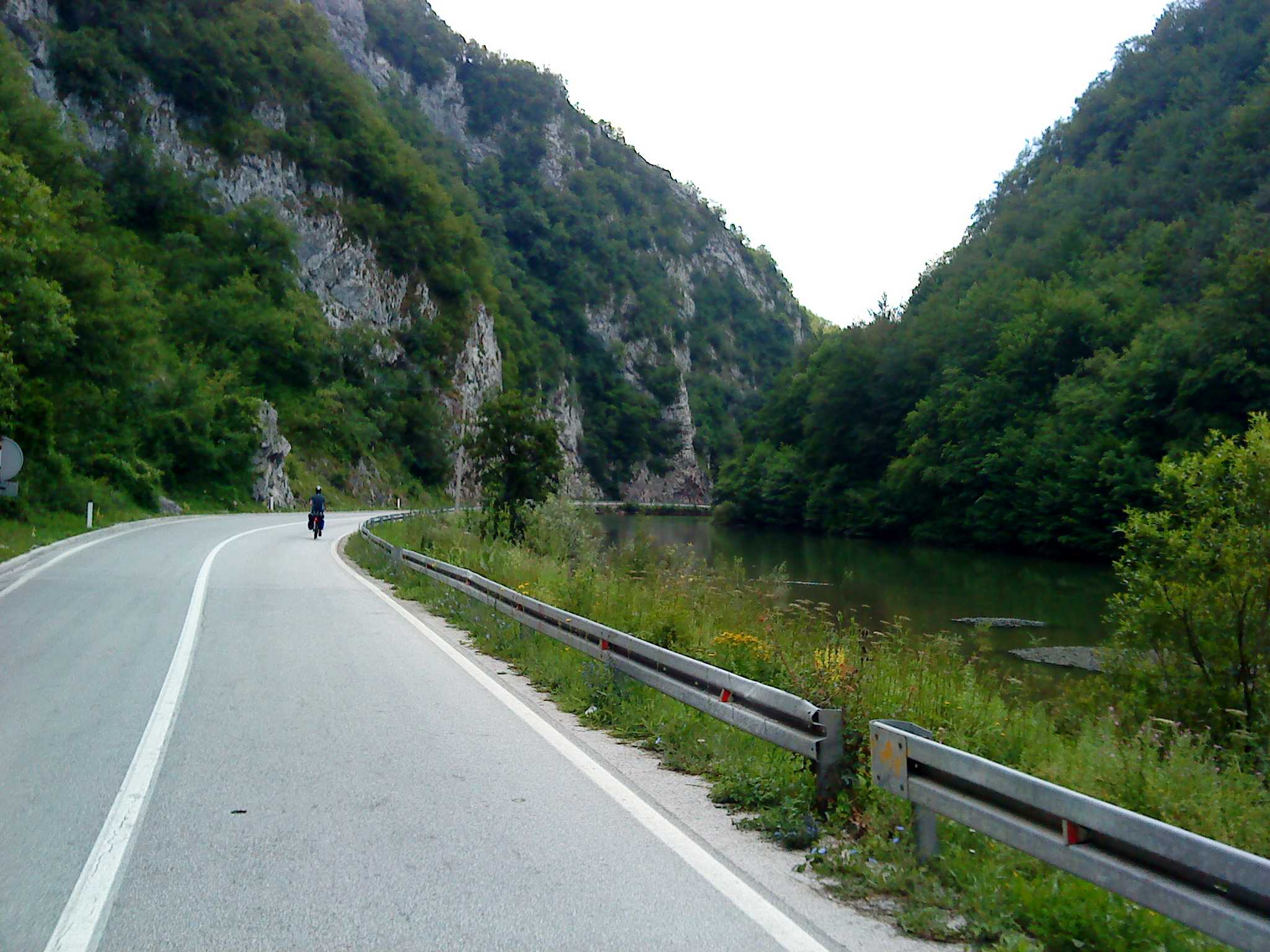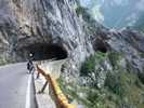Doch Montenegro bietet sogleich eine überwältigende Ablenkung: Eine Brücke spannt sich in großer Höhe von der einen auf die andere Seite der Schlucht. Auf der anderen Seite mündet sie in einen steinernen Tunnel, einfach so ohne Verkleidung in den Felsen gesprengt. Wie sich herausstellen soll, die übliche Bauweise in Montenegro. Wir fahren entlang von steilen Felswänden durch mindestens 15 Tunnel. Alle 100 m halten wir kurz für ein Foto. Es ist wirklich ein grandioser Traum für einen Radfahrer. Schließlich erreichen wir eine Staumauer; ab hier fahren wir entlang eines Sees: Wieder türkises Wasser, das kennen wir mittlerweile gut. Und wieder dutzende Tunnel.