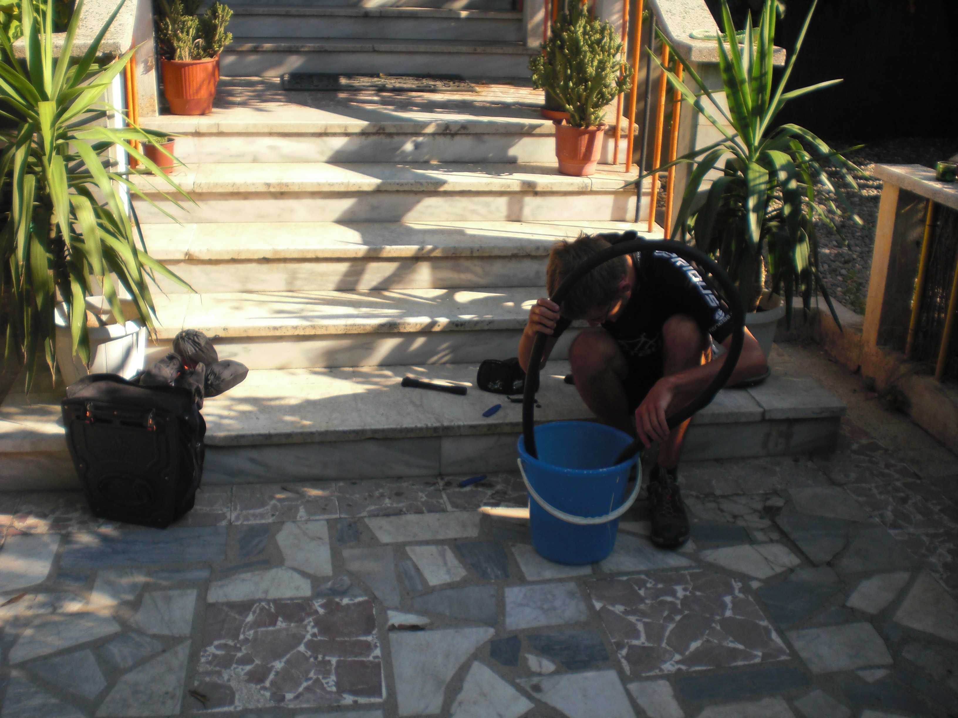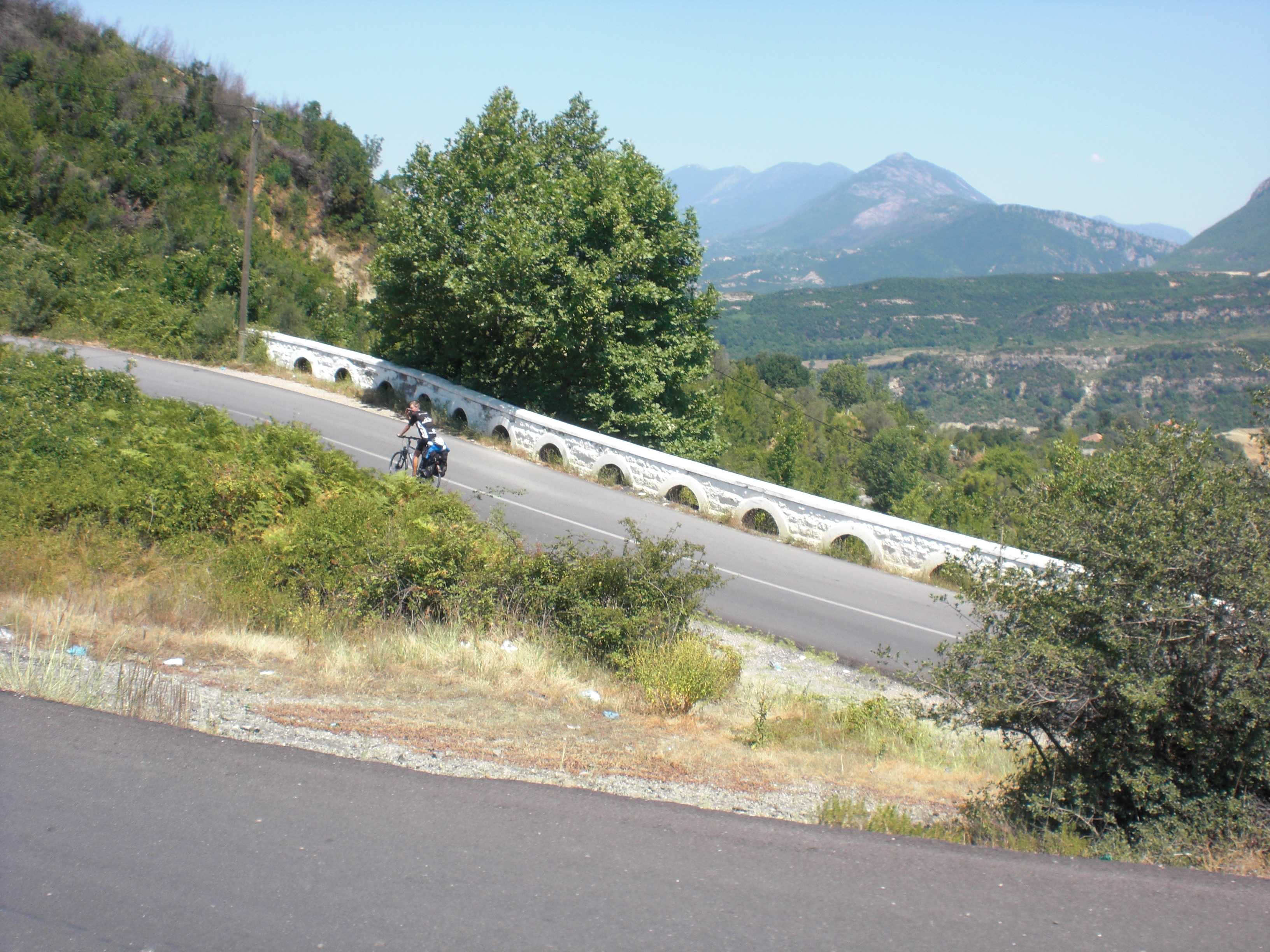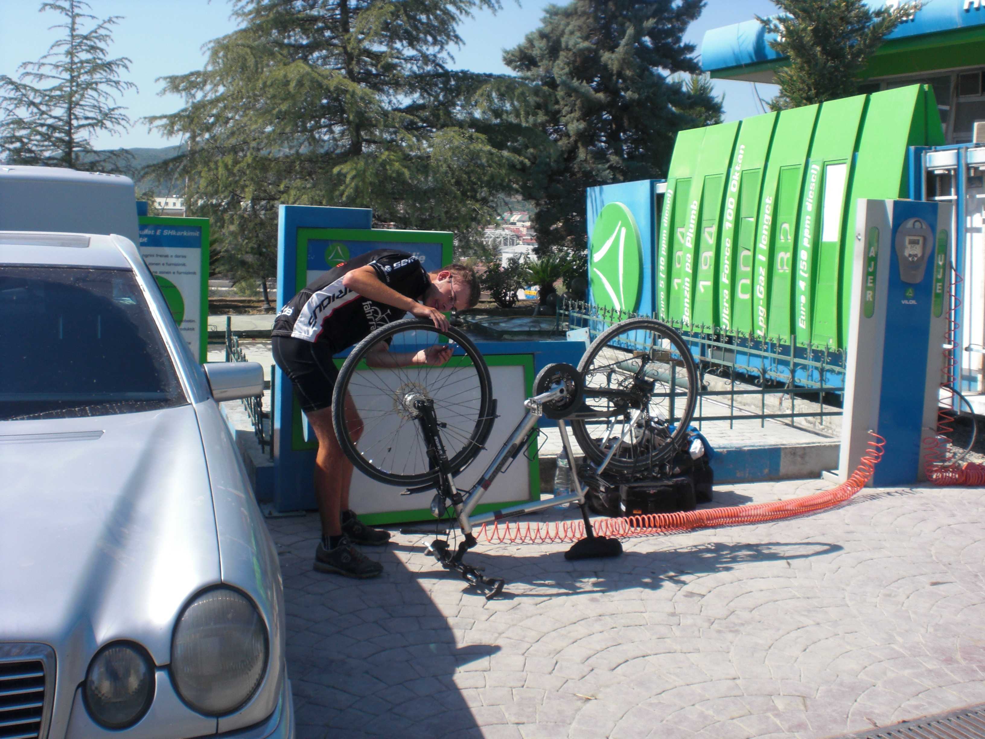 Als wir am Morgen aus unserem Hostel in Tirana treten wartet erst mal eine böse Überraschung auf uns. Ich habe einen Platten, und das ausgerechnet an dem Tag, an dem wir uns die lange 130-km-Etappe an den Ohridsee vorgenommen haben. Das Flicken kostet Zeit und so kommen wir erst in der Dunkelheit an dem kleinen überfüllten Campingplatz an.