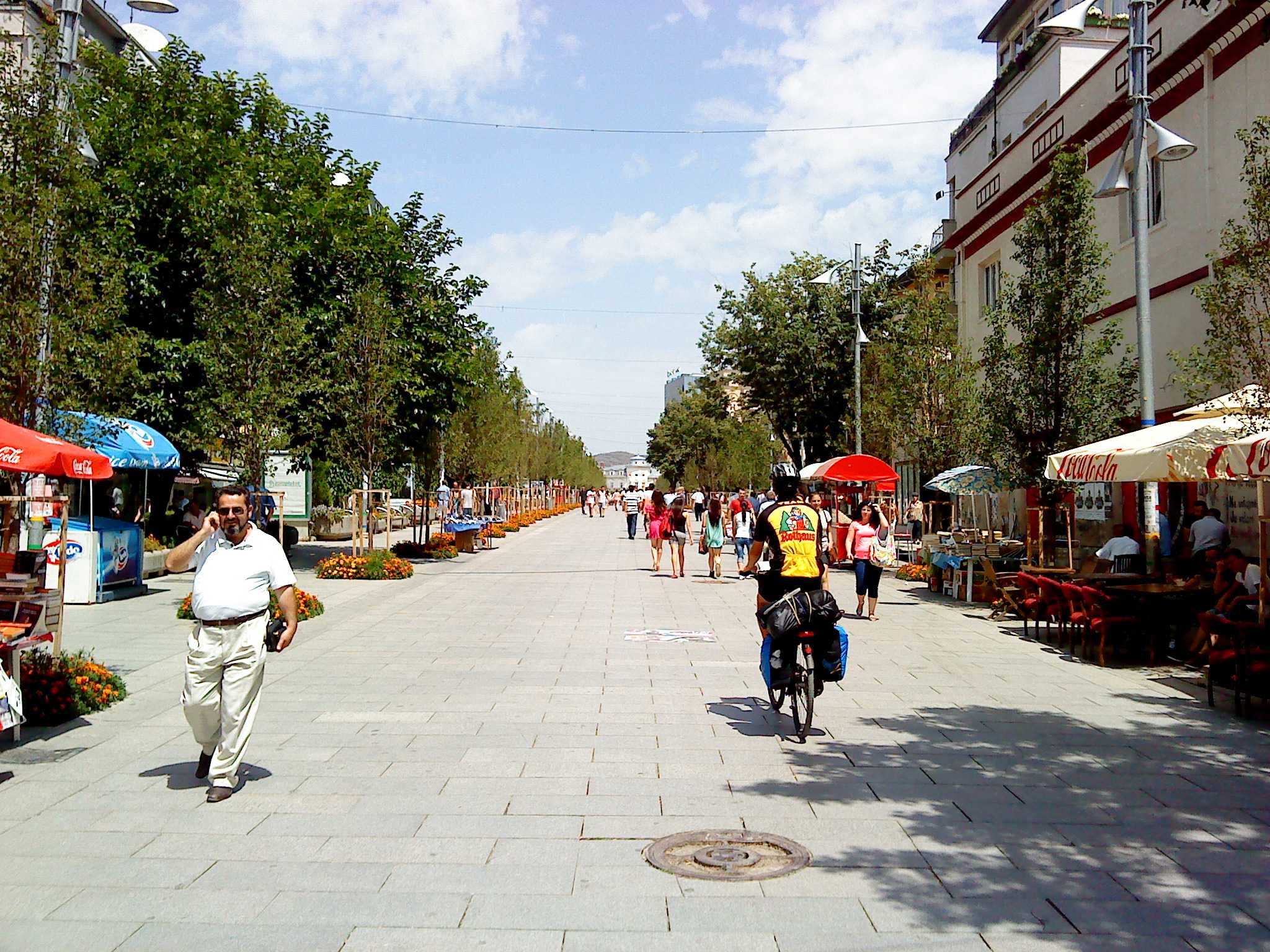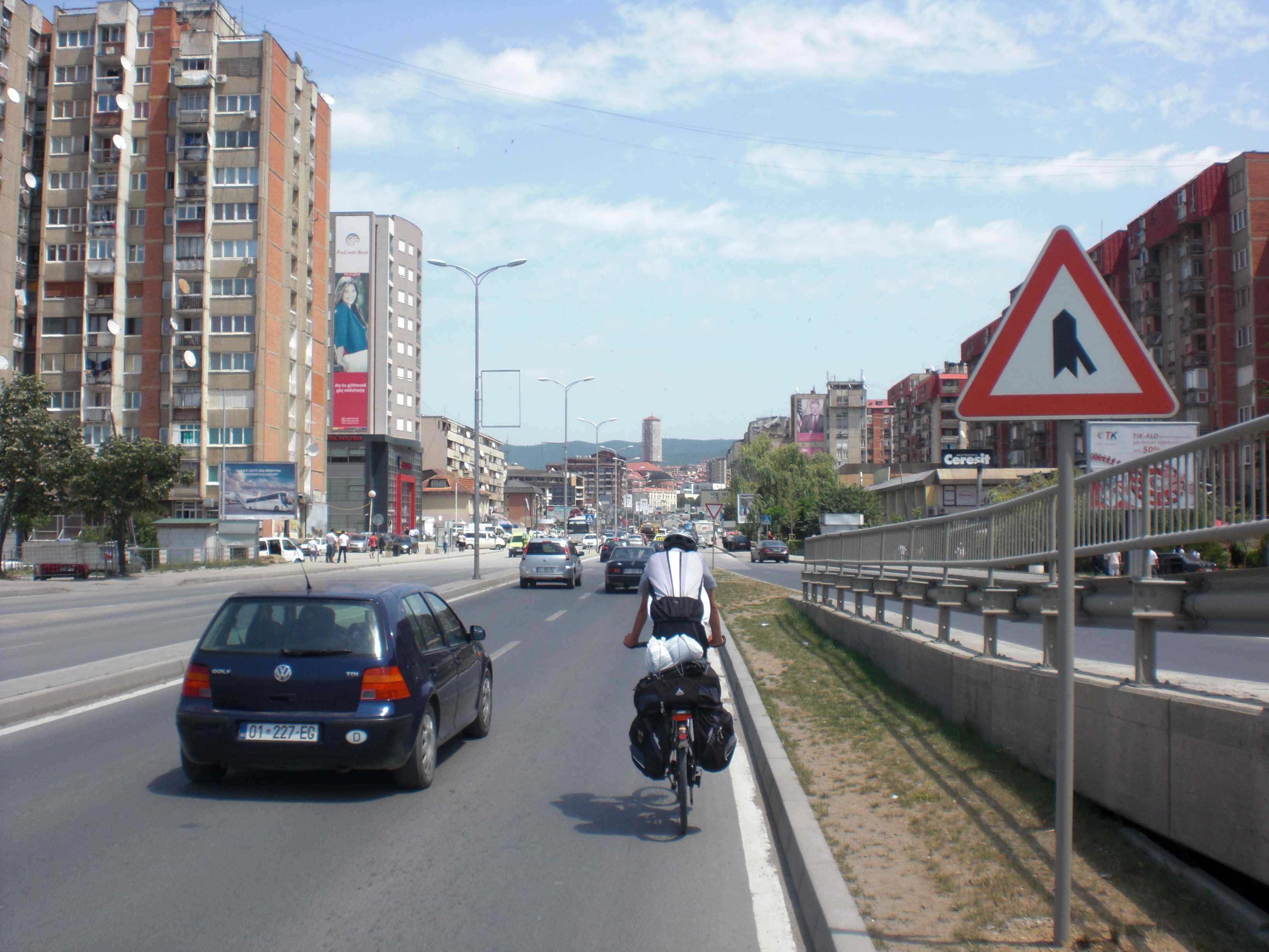 Vor Pristina wartet noch auf über 20 km eine autobahnähnliche Straße auf uns, diesmal wenigstens mit Seitenstreifen. Der Verkehr, Lärm und Staub ziehen an den Nerven. Kurz vor der Stadt wird allerlei verkauft, zum Beispiel lebende Hühner, an den Beinen zusammen gebunden auf dem Boden liegend. Das zerrt auch an den Nerven. Wir sind froh als wir die Innenstadt erreichen.