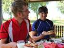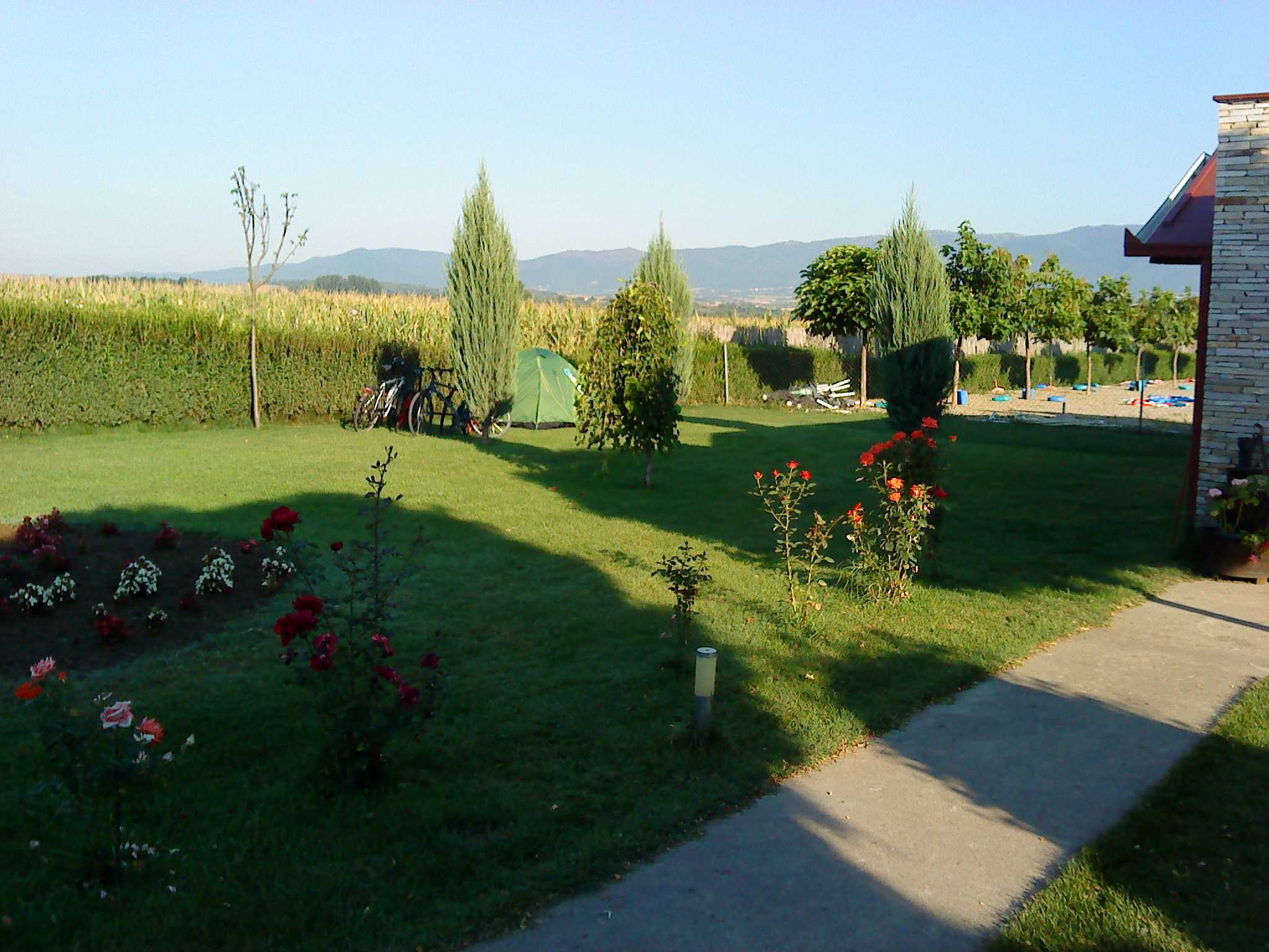 Der Campingplatz hingegen ist einer der besten, auf dem wir bisher waren: Zwischen Blumenbeeten und sauber gestutzten Bäumen liegen Flächen besten englischen Rasens. Nur wenige Zelte stehen dort rum und wir können den Platz für unser Zelt frei wählen. Nach dem Zeltaufbau bekommen wir erstmal eine Cola, die aufs Haus geht. Für den unheimlich sympathischen jungen Serben, der den Campingplatz führt, ist es kein Problem, dass wir unser eigenes Zeug auf den Tischen des angeschlossenen Restaurants essen. Am Nebentisch stehen gerade ein paar Leute auf und lassen auf den Platten ein paar Würstchen. Cevapcici und Fleisch zurück. „Ohhhh, das könnte er doch jetzt uns noch hinstellen“, träumen wir. Doch ein älterer Herr räumt den Tisch ab, ohne uns zu fragen. Wir packen also doch unsere Brote aus, gerade als der junge Serbe an den Tisch tritt: „Do you want some salate? And I have some meat left? I could throw it away or give it you, so if you want …“