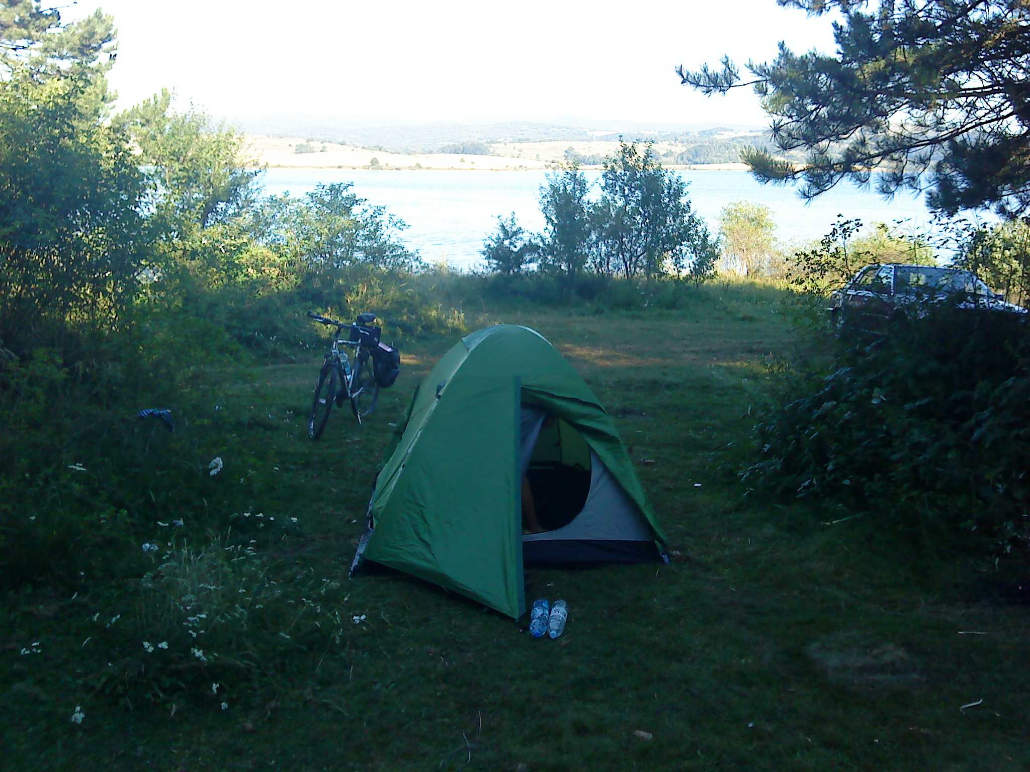 Diese Entscheidung erweist sich als sinnvoll: der See liegt auf einer Hochebene, davor geht es also ganz schön bergauf. Auch wegen dem Pool am Morgen kommen wir erst um fünf Uhr am See an und fahren daran entlang um den Campingplatz zu finden. Am See haben einige Serben ihre Zelte aufgeschlagen, ohne, dass das nach einem Campingplatz aussieht. Wir entscheiden, unseres dazu zustellen, vielleicht haben wir mal wieder Glück und bekommen was von ihrem Grillgut ab. Wir fragen erst mal nach, ob wir hier auch zelten können: Klar, kein Problem. Als unser Zelt steht, kommt einer der Serben nochmal auf uns zu, mit großen leuchtenden Augen, doch alles was er dabeihat, ist eine Plastikflasche mit Schnaps. Das Zeug brennt dermaßen im Hals; auch ohne hohe Ansprüche: Eine Cola wäre uns lieber gewesen. Nach unserem Wasser-und-Brot-Abendessen legen wir uns schon früh schlafen.