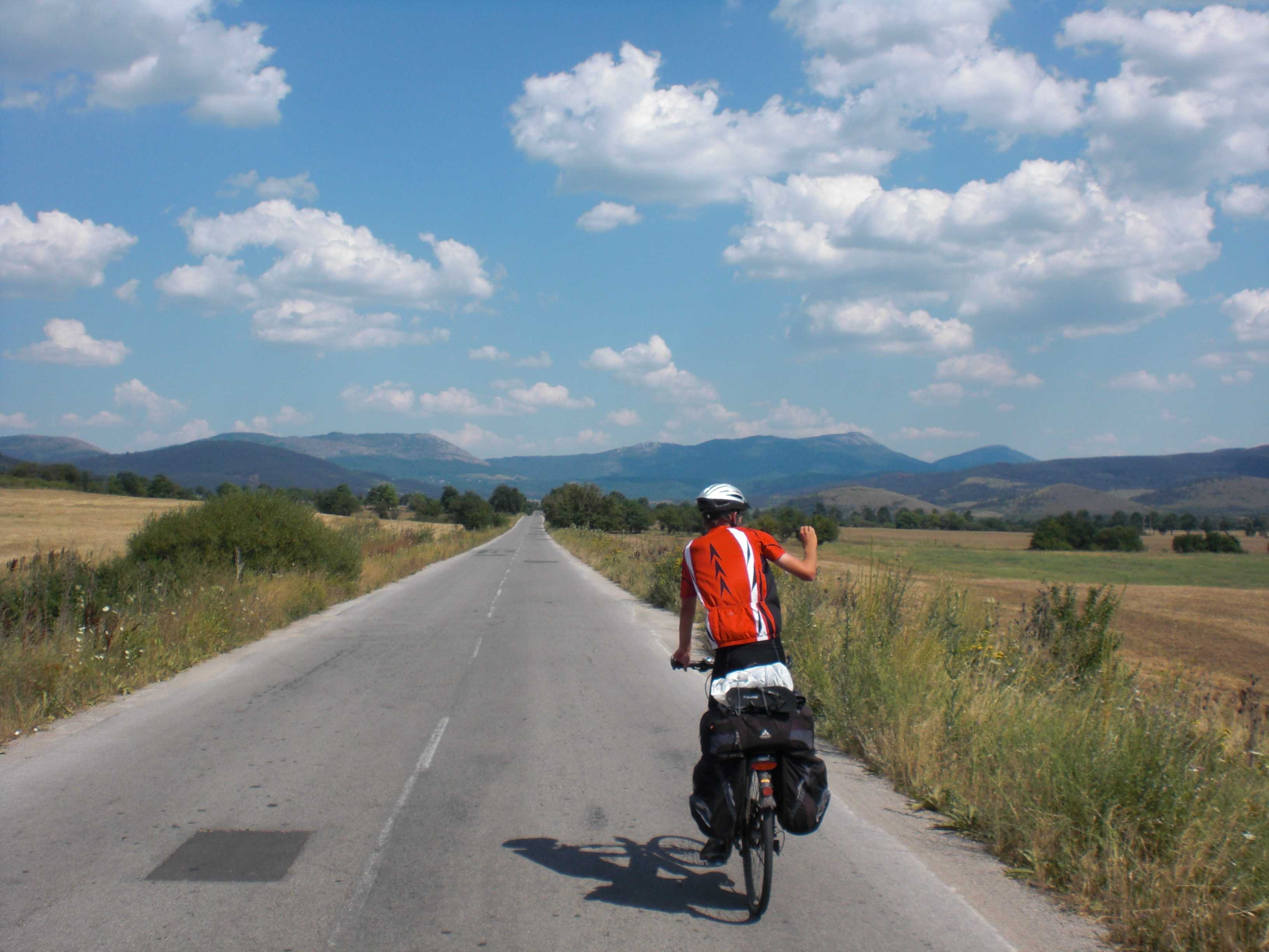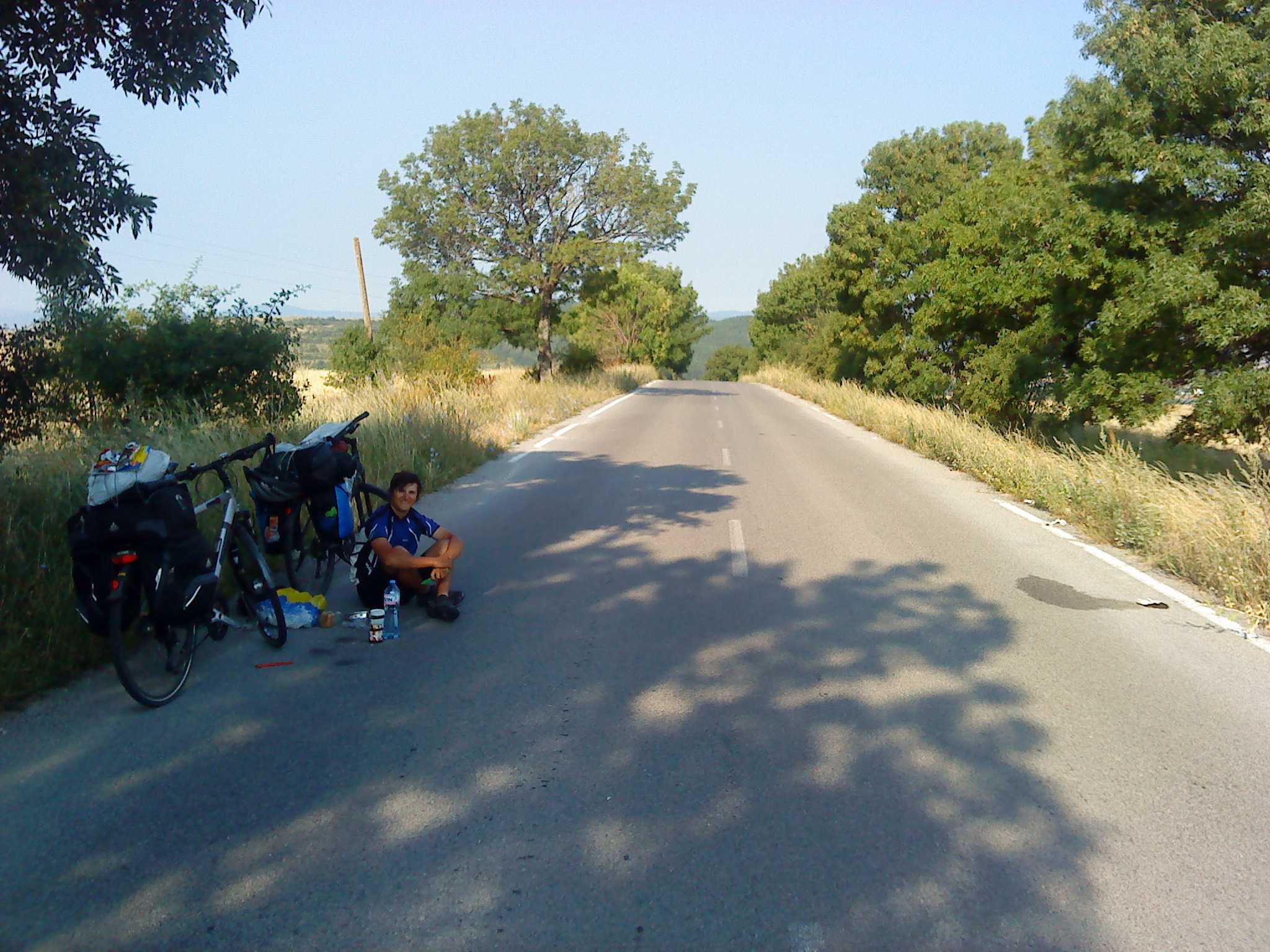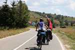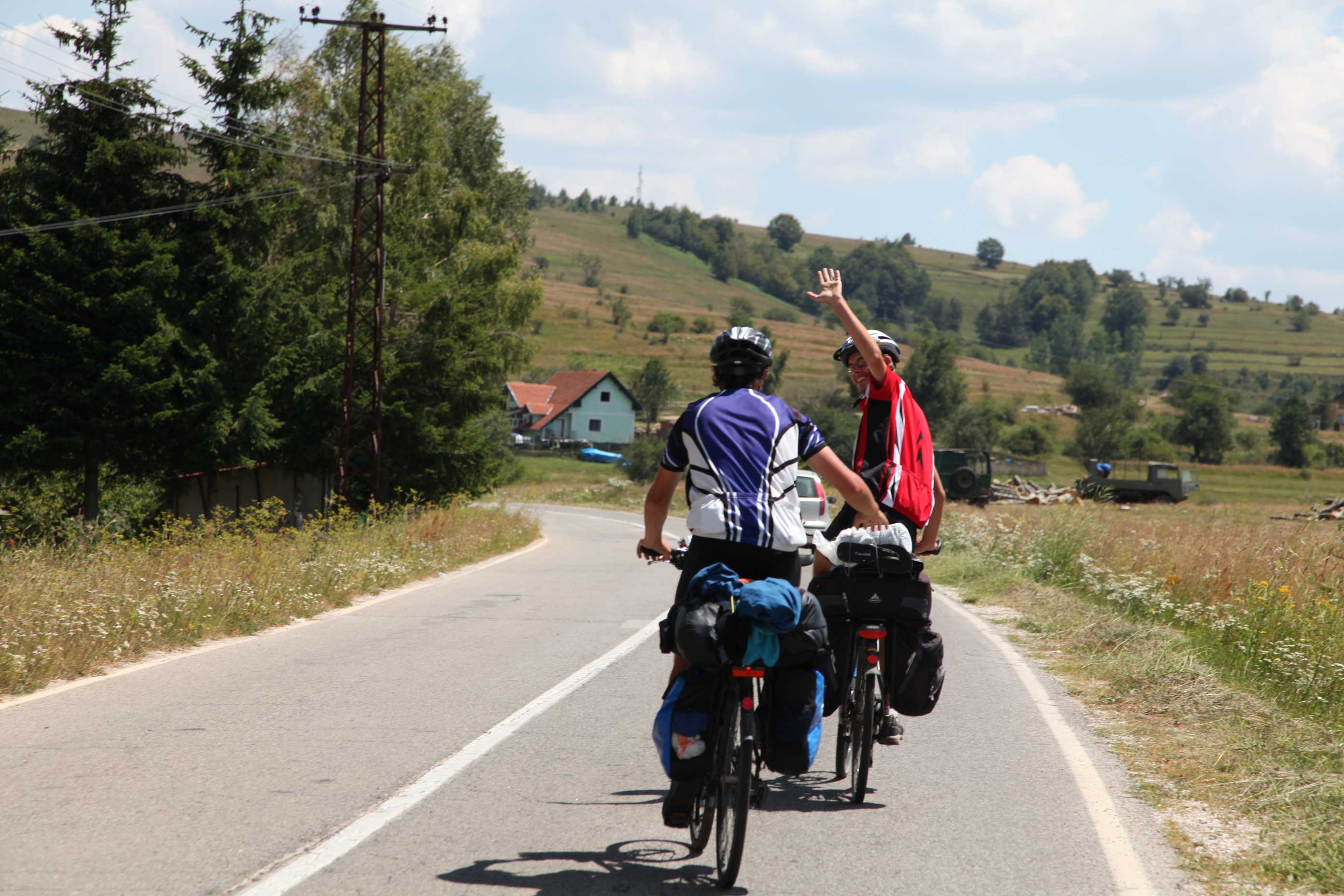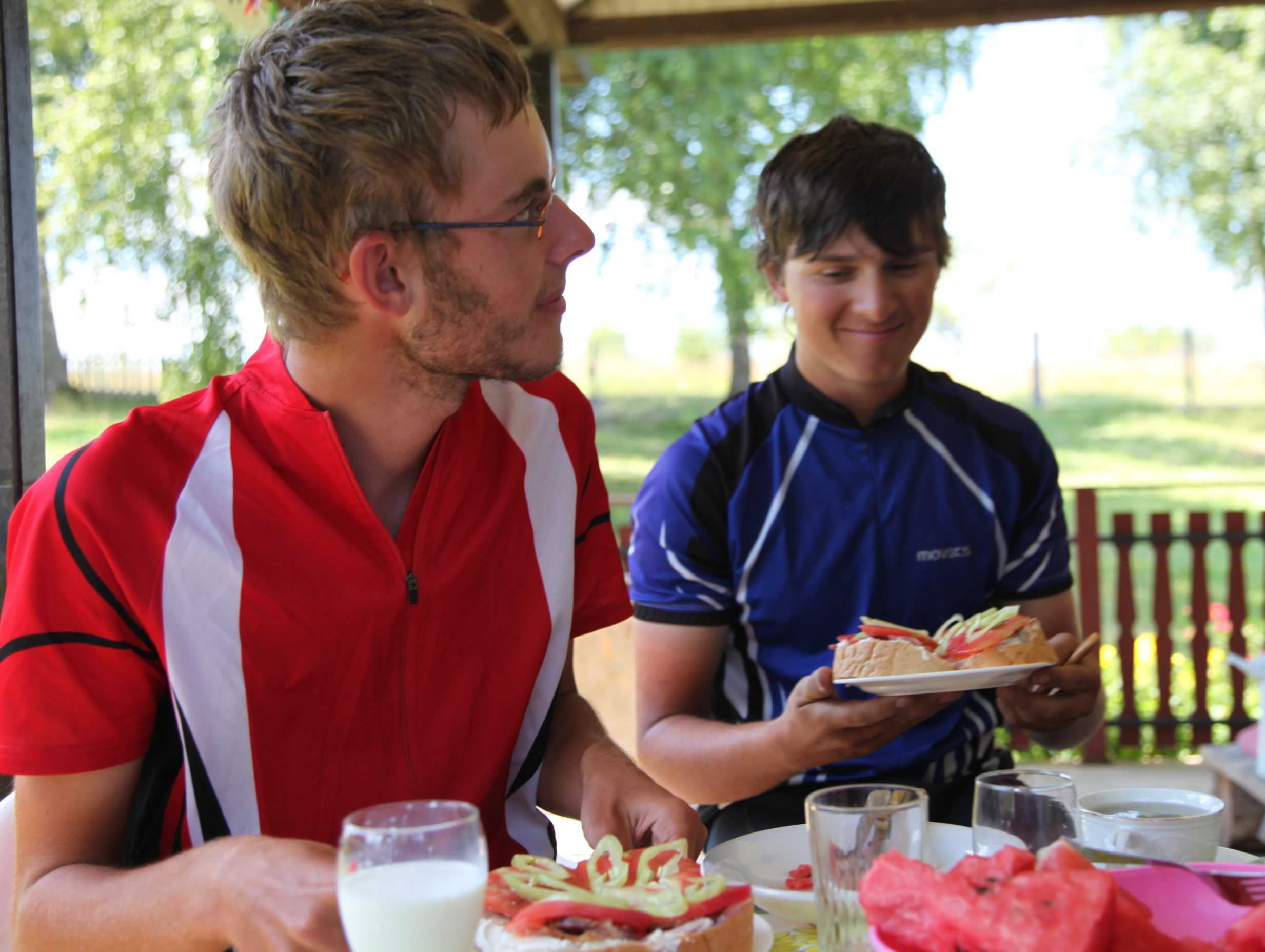 Am nächsten Morgen haben wir keine Vorräte mehr und fahren daher ohne Frühstück ab. Nach einigen Kilometern kommt ein kleiner Laden und nach 15 Tageskilometern vespern wir vor den Zäunen von ein paar Grundstücken. Wir packen gerade wieder zusammen, als eine Frau und ihre Tochter, die nur wenige Jahre älter ist, als wir, an uns vorbeilaufen. Die Mutter spricht uns auf Serbisch an. „English“, antworten wir. Die Tochter kann sehr gutes Englisch und übersetzt. Ob wir Wasser wollen? Ja, tatsächlich waren unsere Wasservorräte allmählich leer (wir konnten in dem Laden nicht so viel kaufen, weil uns das serbische Geld ausgegangen ist). Wir folgen den beiden durch das Gartentor und werden auf der Veranda auf ein paar Stühle gedrückt. Ob wir Erdbeersaft wollen? Nagut, gerne, Wasser hängt uns zum Hals raus und da wir von Skopje nun vier Tage bis Sofia fahren haben wir auch Zeit genug. Ob wir Wassermelonen wollen? Ein Berg von Wassermelonen steht kurz darauf auf dem Tisch. Ob wir Kaffee, Tee oder Milch wollen? Kaffee mögen wir beide nicht, aber Tee oder Milch ist okay. Mittlerweile ist noch die 18-jährige Schwester der Tochter aus dem Haus erschienen und setzt sich dazu. Die Mutter rennt lachend in der Gegend rum und scheint alle möglichen Leute zusammenzutrommeln. „I sat on the toilet and she called me: Hey, come, there are some guys from Germany travelling by bike!“, erzählt zum Beispiel der Ehemann der Cousine, die ebenfalls am Tisch Platz genommen hat – neben einem weiteren Familienmitglied, ein studierter Fotograph und Möbeldesigner (ein Beruf, den man ihm auch deutlich ansieht).