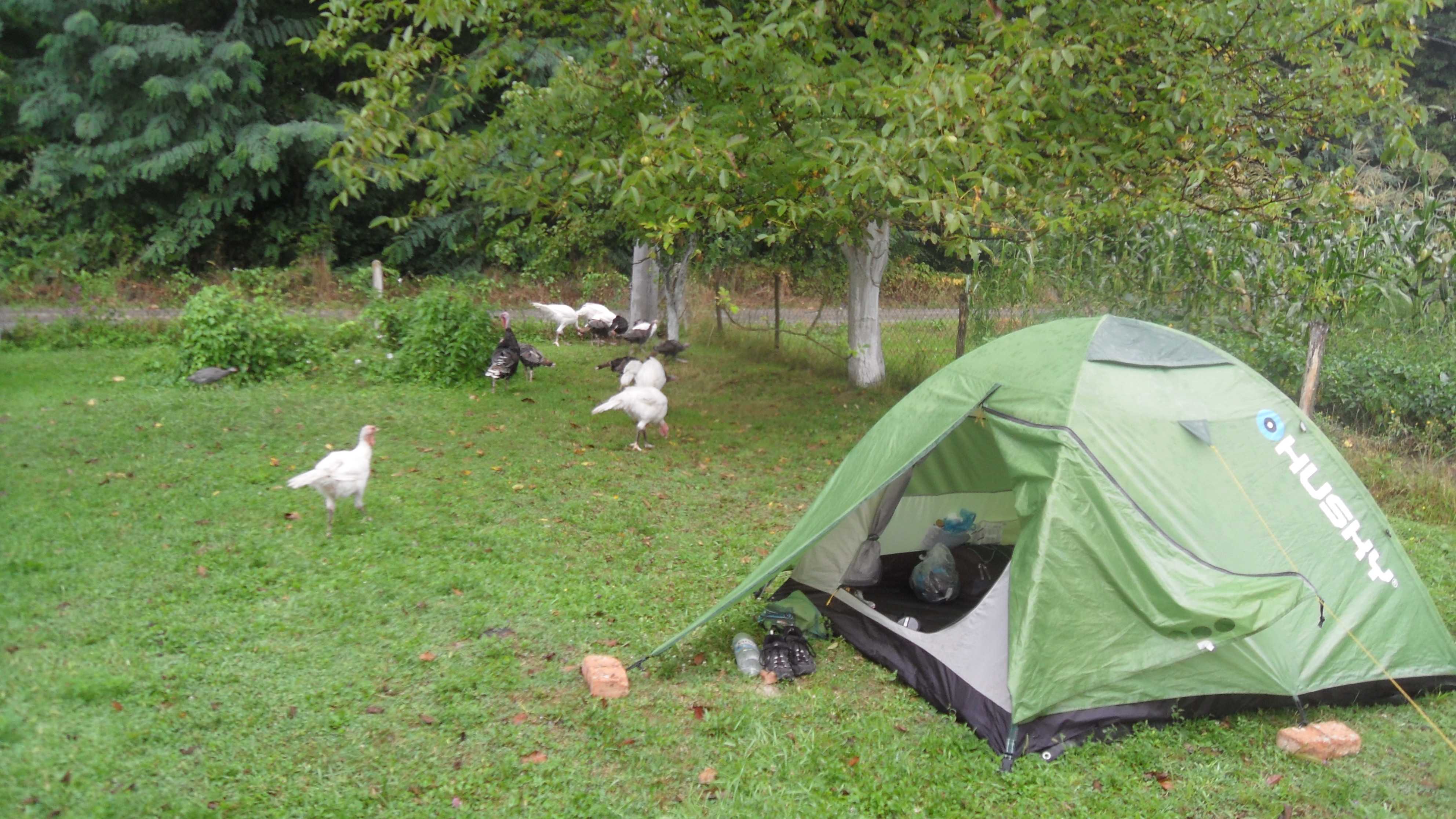 Vor einem der Häuser steht eine Frau mittleren Alters im Garten. Schöner Rasen, kein Zaun, kein Hund: Die Voraussetzungen sind gegeben. Wir halten und bringen gestenreich unser Anliegen vor. Die Frau holt im Haus einen Mann, er spricht Englisch mit uns und erlaubt uns das Zelten. Hinter dem Haus sei es ruhiger, „but be careful. There are turkeys and, you know, they shit around.“ Wir entscheiden uns für die Gesellschaft von Truthähnen anstelle der Autos auf der Straße. Die Frau tischt Äpfel und Birnen aus dem Garten auf, wir schneiden die Maden heraus und tuen uns daran gütlich. Der Mann ist ihr Sohn, Mitte dreißig und hat sich selbst Englisch beigebracht – dafür ist es erstaunlich gut! Er arbeitet als Techniker und repariert Eisenbahnen. „Interesting“, kommentiere ich. „Not really. It's hard work and poorly paid. [...] Any job is poorly paid in this country, except in politics. [...] Elections are less about content, the two major parties are almost the same. They are more about who is in power to steal from the people.“ Wir schlafen schließlich mitten im Truthahngehege.