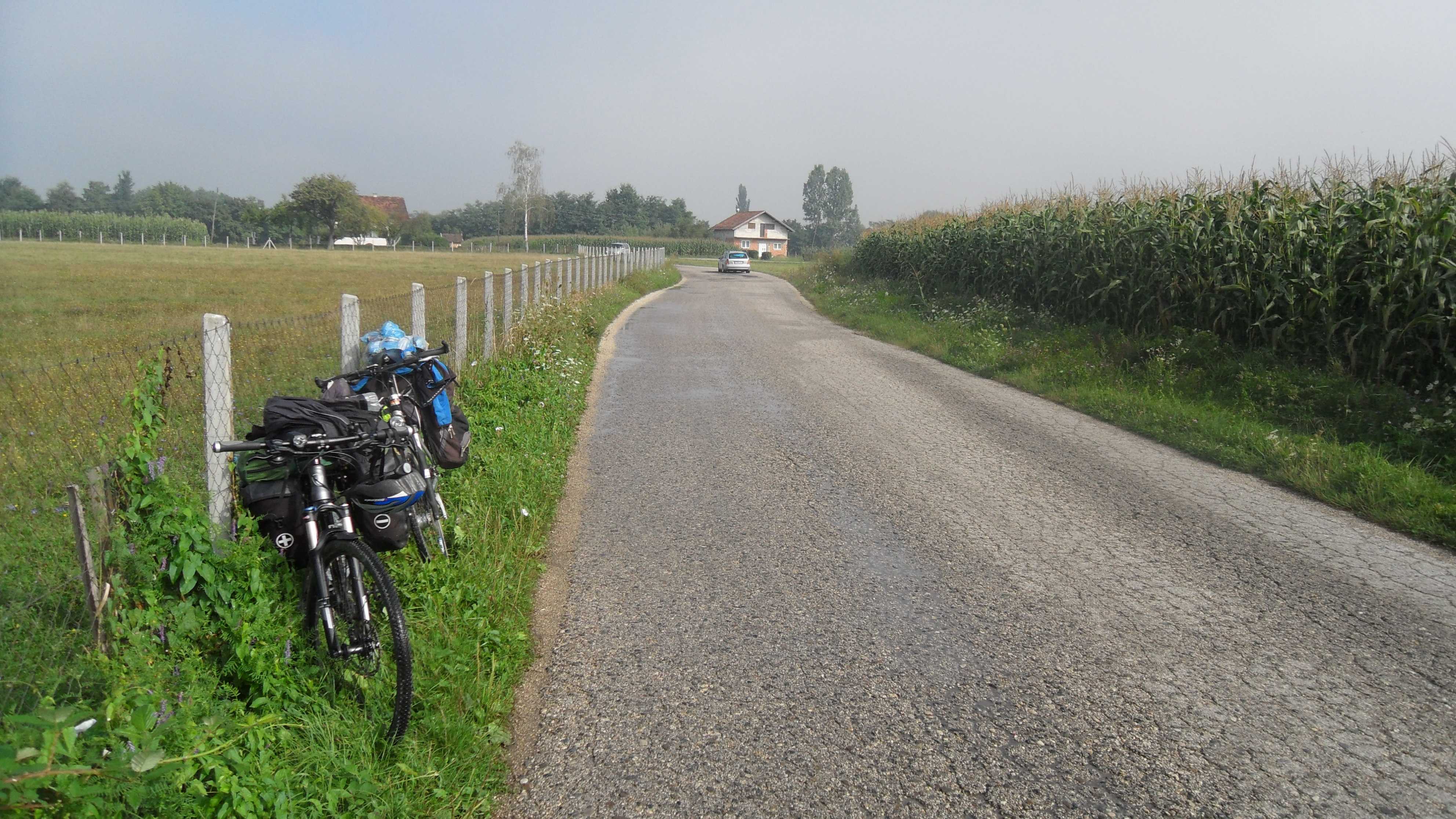 Die Stadt Prijedor verliert sich mit größerer Entfernung vom Stadtzentrum sehr diffus in der Landschaft, soll heißen die Häuserdichte nimmt mit größerer Entfernung sehr langsam ab. Und so fahren wir hinter Prijedor auf der Suche nach einem Schlafplatz durch lose zusammengewürfelte Häuser mit großen Grundstücken und immer wieder Feldern dazwischen.