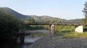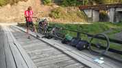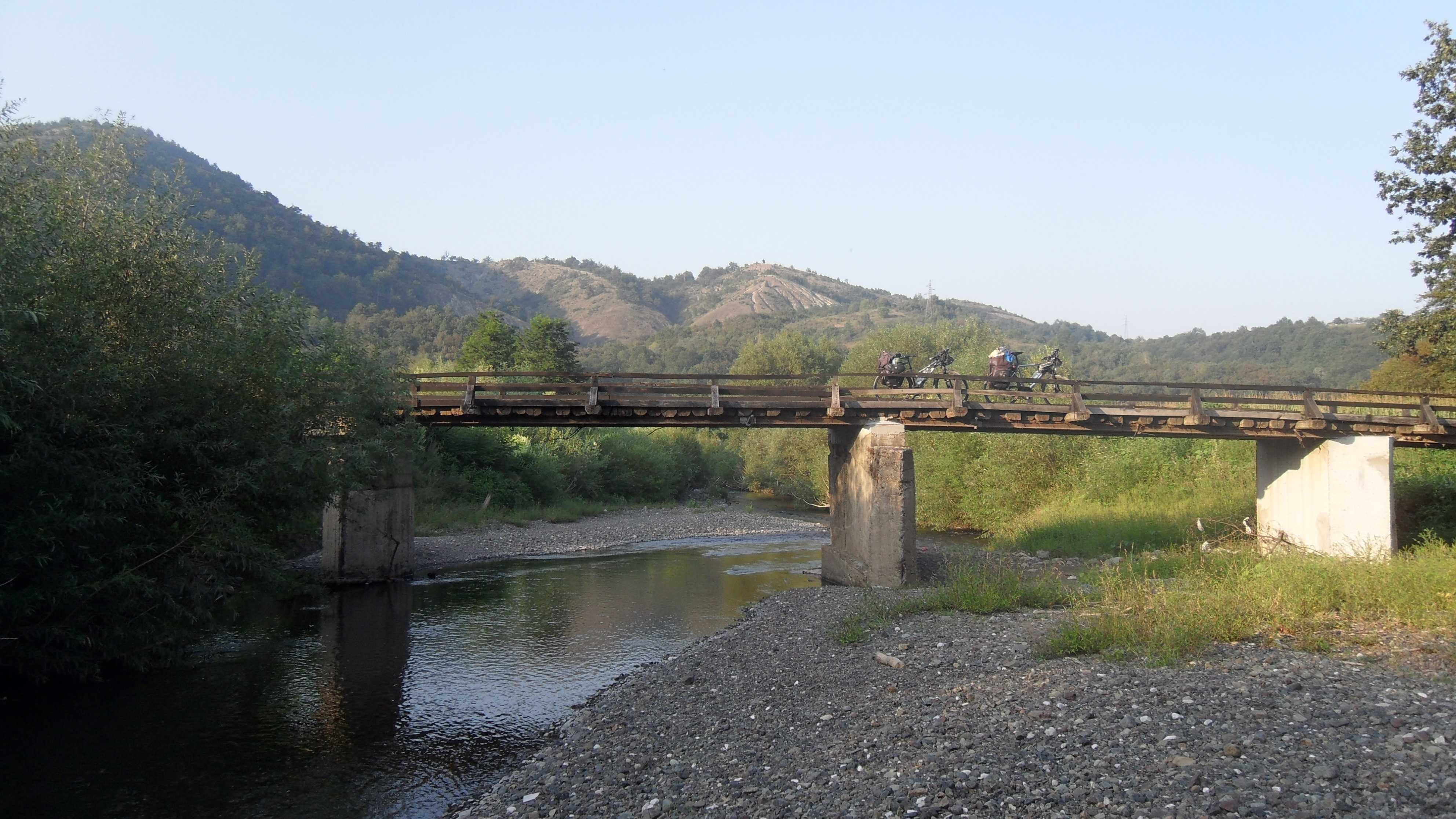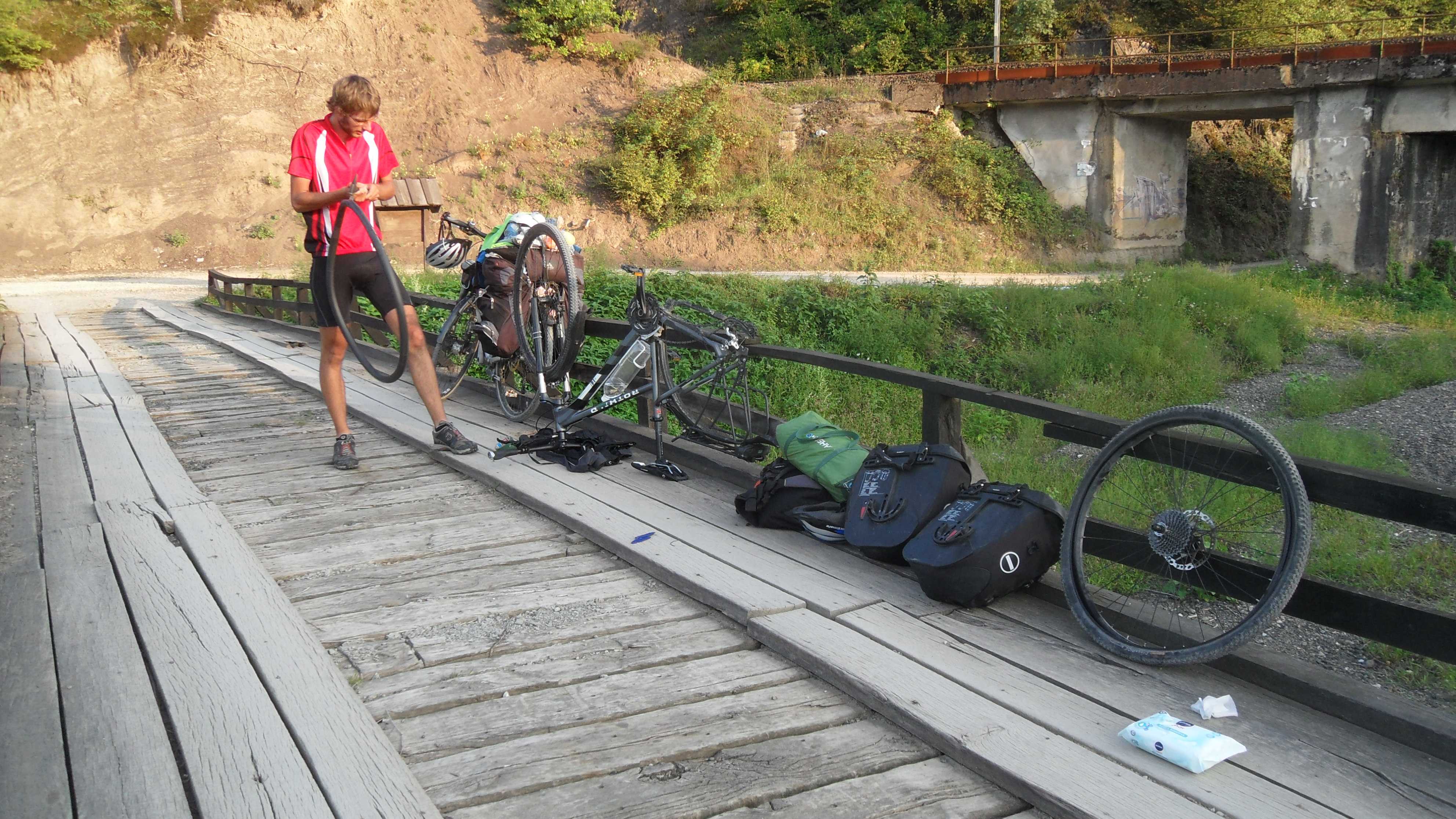 Die Landschaft ist nach wie vor hügelig bis bergig, aber unsere Route führt uns vor allem durch Flusstäler und so geht es immer nur sehr leicht bergauf und bergab und wir kommen trotz unserer späten Abfahrtszeit gut voran. Gegen Ende eines längeren Schotterstraßenabschnitts entlang der Eisenbahnstrecke, der uns den Umweg über Prnjavor, den die größere Straße nimmt, erspart, ist ein Hinterreifen platt. Zugegeben, der Reifen hätte sich kaum eine schönere Stelle aussuchen können: Wir flicken ihn auf einer schönen Holzbrücke, die über einen kleinen Fluss führt, mit dessen Wasser wir das Loch im Schlauch suchen können.