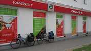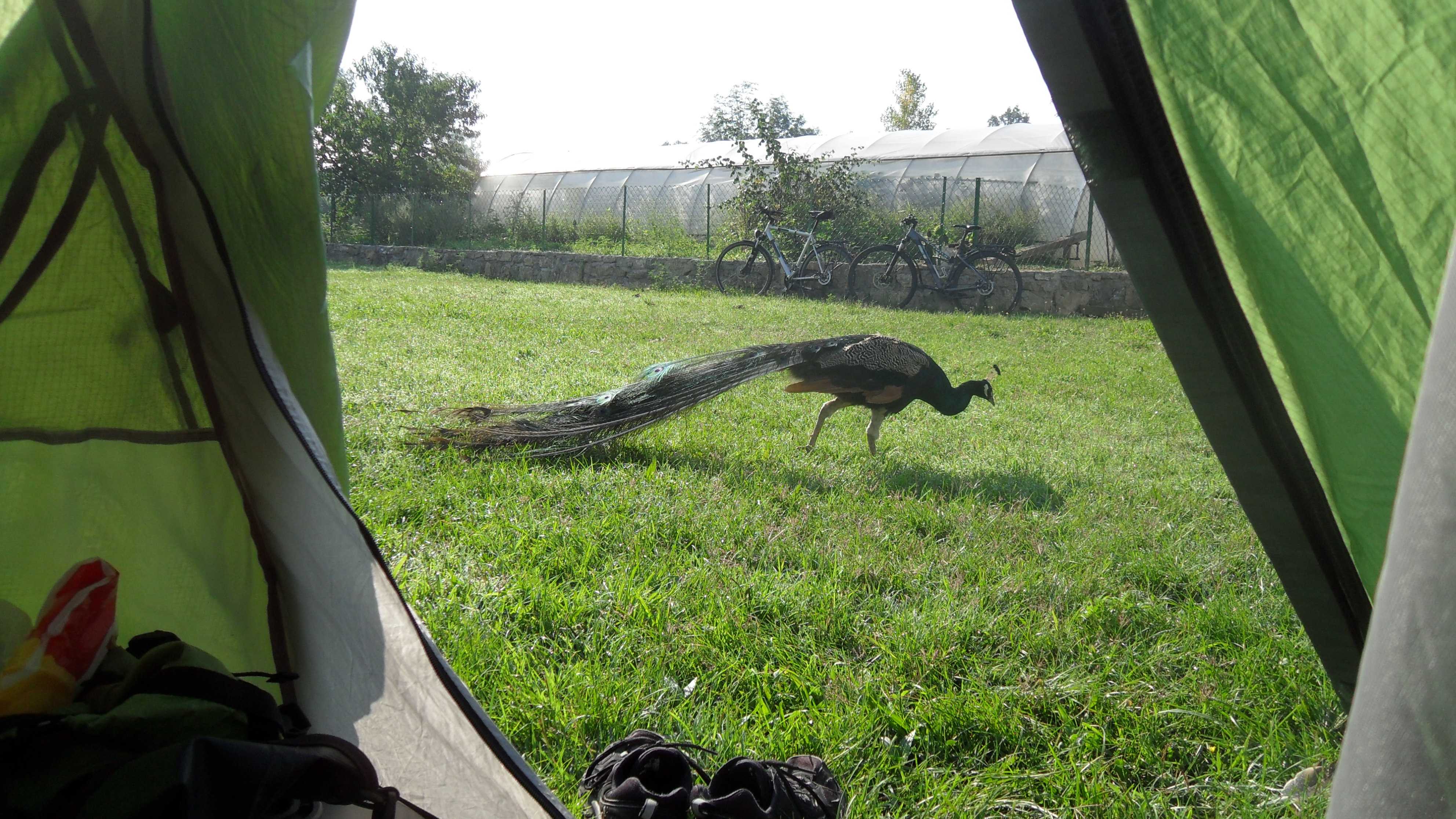 Am nächsten Morgen haben wir die Ereignisse des Vortages längst vergessen: Der erste Blick aus dem Zelt geht nicht auf den geflickten Hinterreifen und erst als wir losfahren wollen bemerken wir, dass der Reifen erneut platt ist. Wie sich herausstellt, hat der Flicken vom Vortag gehalten, es ist ein neues Loch. Wir bringen also Flicken Nummer drei am Schlauch an (das erste Loch entstand schon vor unserer Abfahrt in Regensburg), suchen Schlauch und Felge noch gründlicher als zuvor auf spitze Stellen ab, finden wieder nichts, reinigen den kompletten Mantel innen mit einem feuchten Tuch und brechen schließlich auf in der Sorge, doch etwas übersehen zu haben.