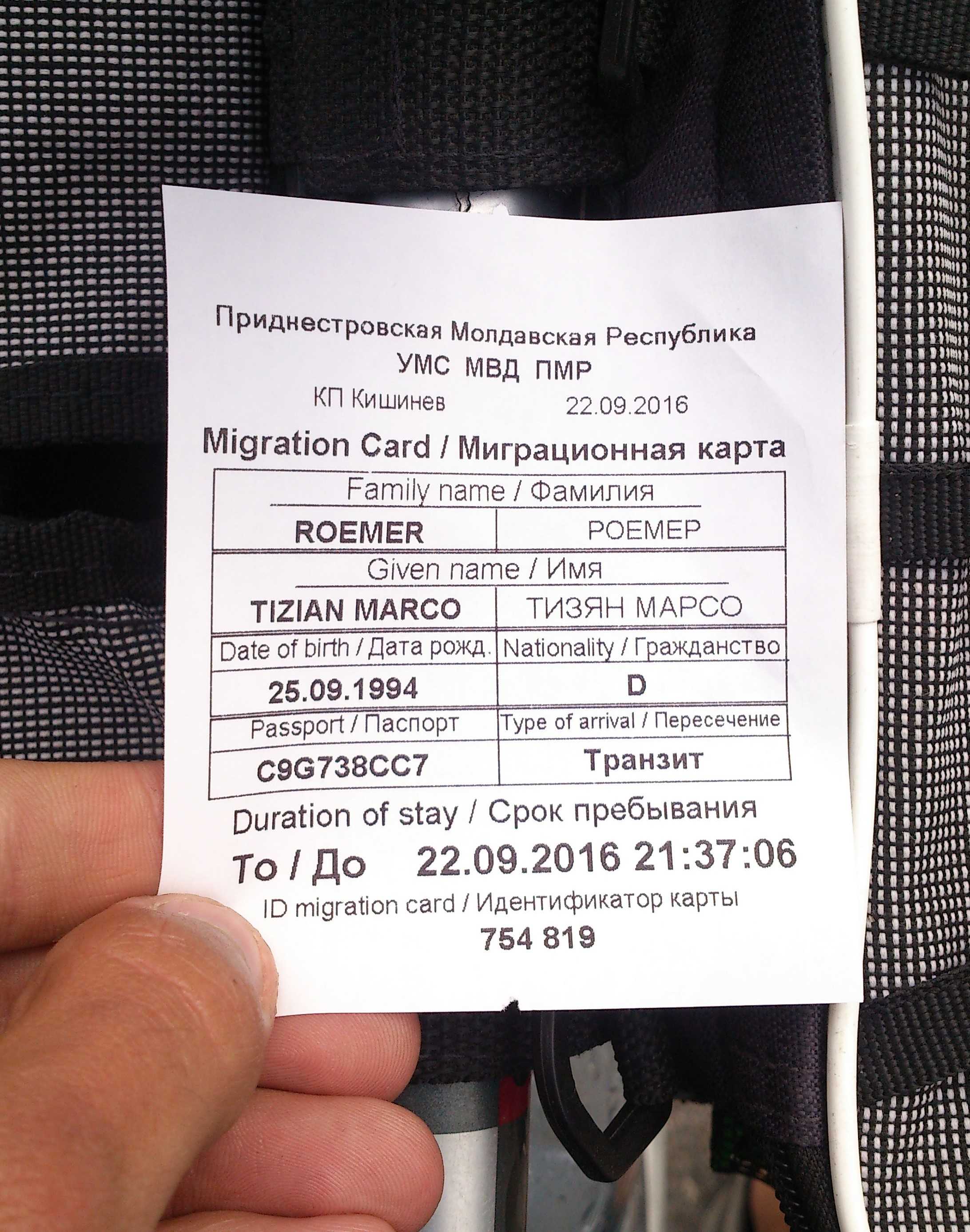 Man will wissen, wo ich hinwill, ich sage Tiraspol und Odessa. Wie lange ich in Tiraspol bleiben will. Zwei Nächte. „Problem“. Offenbar ist das nicht möglich. Man fragt mich „Hotel?“ Ich nicke und nenne mein Hostel. Sie kennen es und fragen „Lenina Street 28?“ Ich nicke, das ist die Adresse. Aber nach wie vor machen sie nicht den Eindruck, dass Problem sei gelöst. Übernachten darf ich in Tiraspol offenbar nicht. Man vermittelt immer noch den Eindruck, ich tue etwas Illegales und man sagt „Protokoll“. Er schreibt meinen Nachnamen auf ein kyrillisches Formular. Ich sage: „Registration Tiraspol“ und meine damit die Verlängerung meines Aufenthaltes. Sie nicken, ja, Registration. Und ganz plötzlich legen sie das „Protokoll“ beiseite, geben mir den Einreisezettel und sagen „Okay, go, go“. Ich will nochmal nachfragen, ob wirklich alles okay ist, aber sie sagen nur „go, go“ und weisen auf die Tür. Draußen checkt man nochmal, ob ich den Zettel erhalten habe und winkt mich durch.