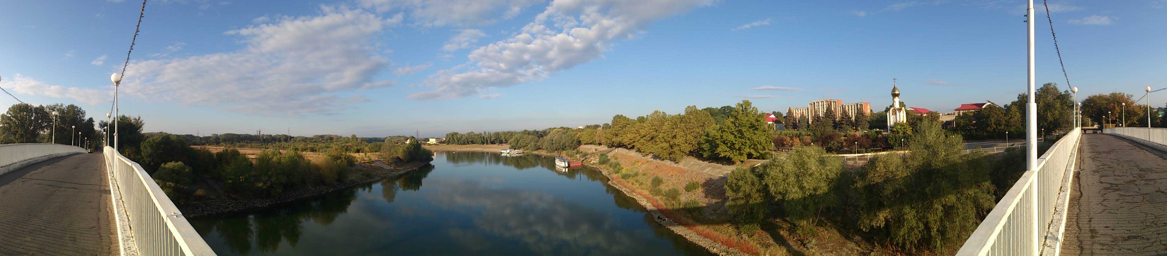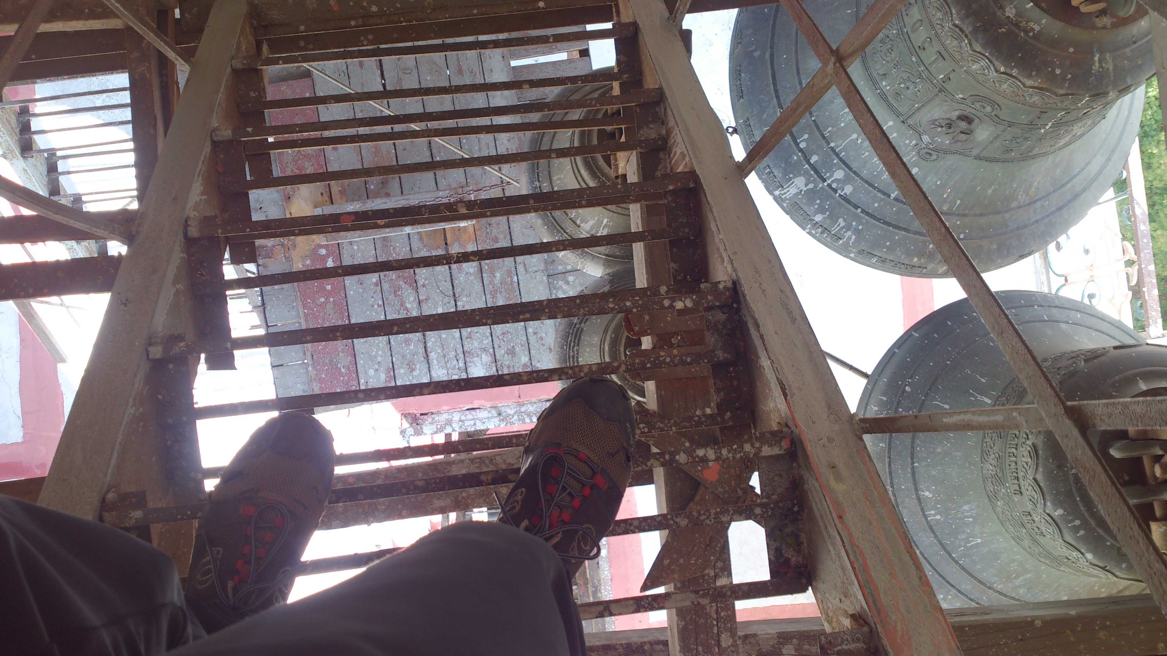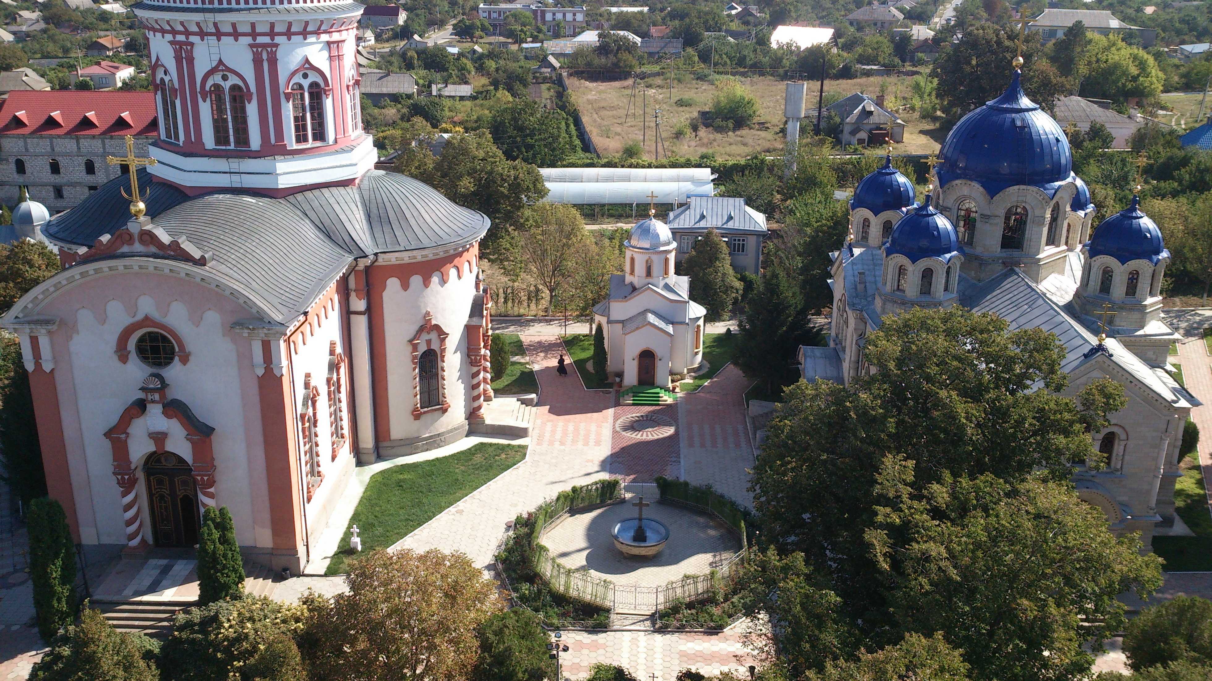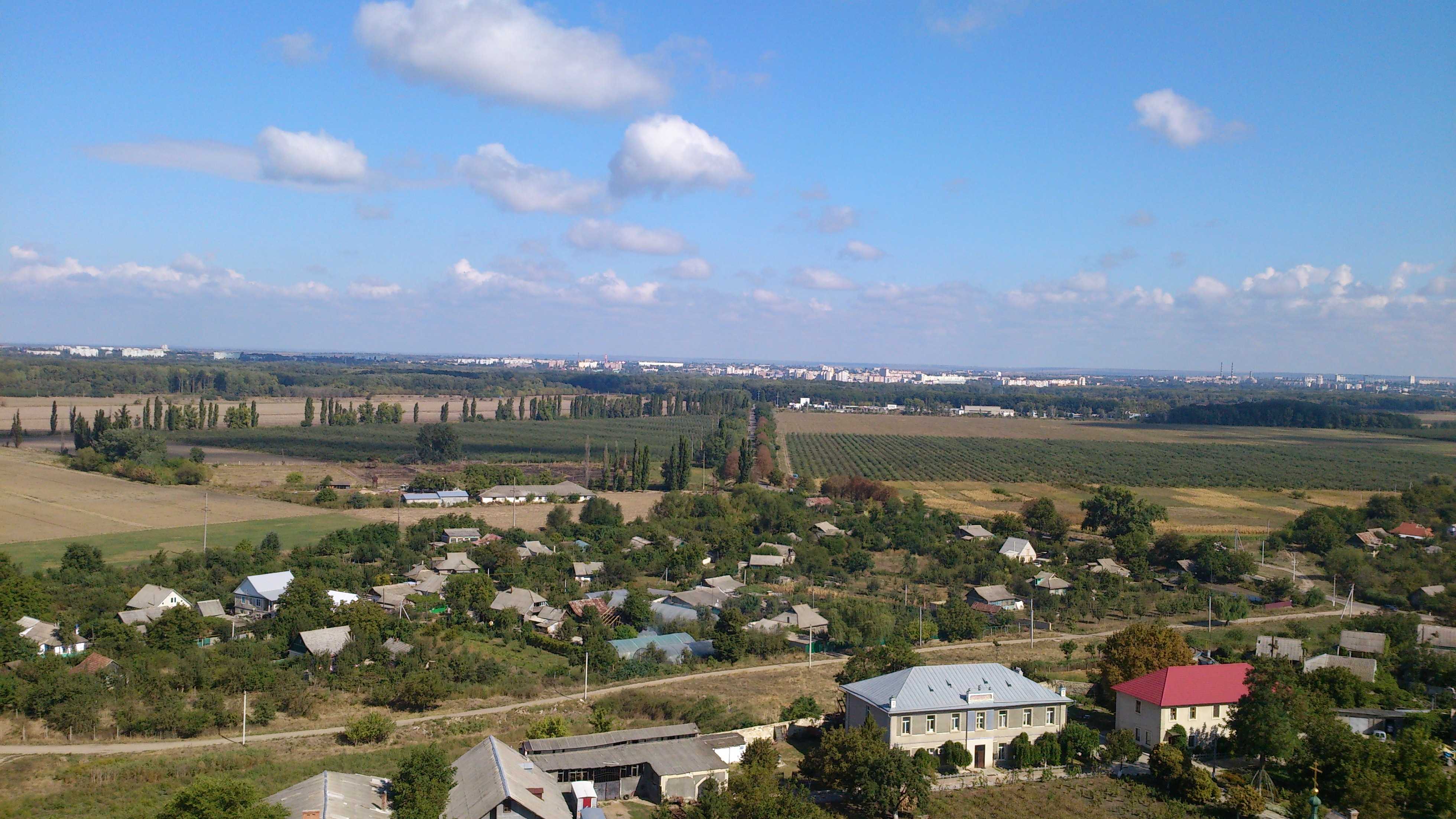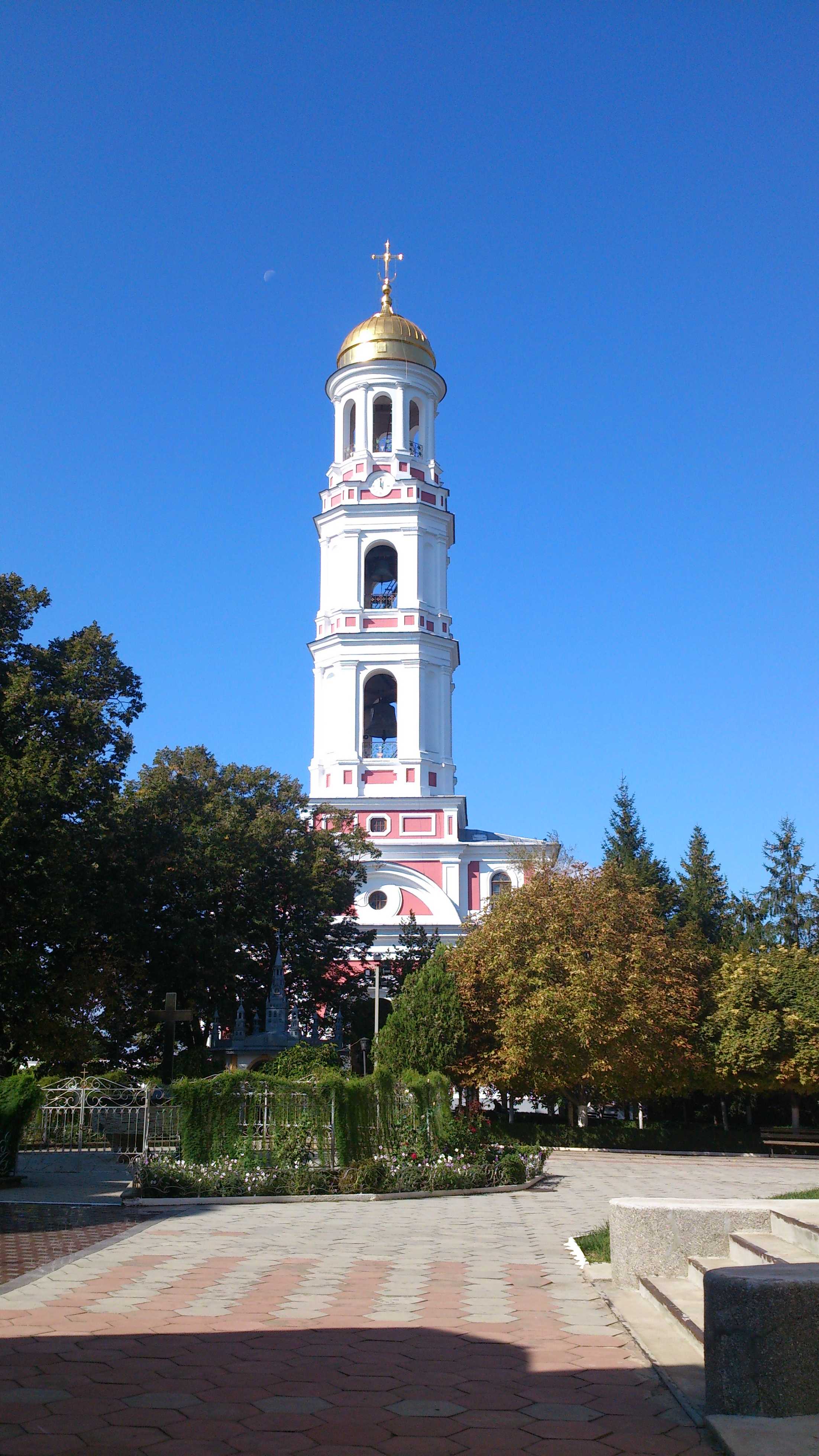 Während meines Ruhetages in Tiraspol fahre ich auf den Tip des Hostels hin die acht Kilometer nach Kitskany und zum dortigen orthodoxen Kloster. Man könne den dortigen Turm besteigen. Ich betrete den Klostergarten, in dem ein paar ältere Herren (keine Mönche, aber Mönche laufen auch rum) sitzen. Man bittet mich um ein wenig Geld. Ich will auf christlichem Gelände keinen schlechten Eindruck machen und gebe einem der Leute zwei transnistrische Rubel. Ich schaue mir die Kirche von innen an und beim Rausgehen bittet mich auch der dortige Mönch um eine Spende. Okay, ich gebe drei Rubel. Sie nehmen es mit einem freundlichen Schulterzucken, das wohl bedeutet, dass ich es bei dem geringen Betrag auch hätte bleiben lassen können. Von leicht schlechtem Gewissen geplagt stecke ich später noch zehn Rubel in ein Spendenkästchen. Die Tür zum Turm ist verschlossen und ich frage, ob ich da hochdarf. Der Mönch zuckt nur mit der Schulter. Ich frage einen anderen, anscheinend den „Chef-Mönch“ (vielleicht der Abt?) und der spricht mit dem anderen Mönch und gebietet mir zu warten. Dieser geht weg und erst dachte ich, er holt den Schlüssel, aber dann gießt er nur die Blumen und macht keine Anstalten, mir irgendwie zu helfen. Da spricht mich der Bettler wieder an, dem ich vorhin die zwei Rubel zugesteckt habe. Er fragt mich gestikulierend, ob ich auf den Turm hoch will. Ich nicke. Er reibt mit schelmischem Grinsen seinen Zeigefinger am Daumen. Okay, dann zahle ich eben Eintritt. Er schafft es schließlich mit seinem Russisch, den Mönch dazu zu bringen, mir aufzuschließen. Ich steige den Turm hoch. Es geht auf einer dünnen, fragil aussehenden Metalleiter mit fingerdünnen Sprossen immer höher und höher. Erst an den kleinen und großen Glocken vorbei und schließlich ganz oben zum Taubennistplatz. Die Aussicht ist tatsächlich nicht schlecht. Ich steige wieder herab und gebe dem Mann für seine Bemühungen fünf Rubel. Er bedankt sich mit einer sehr herzlichen Umarmung.