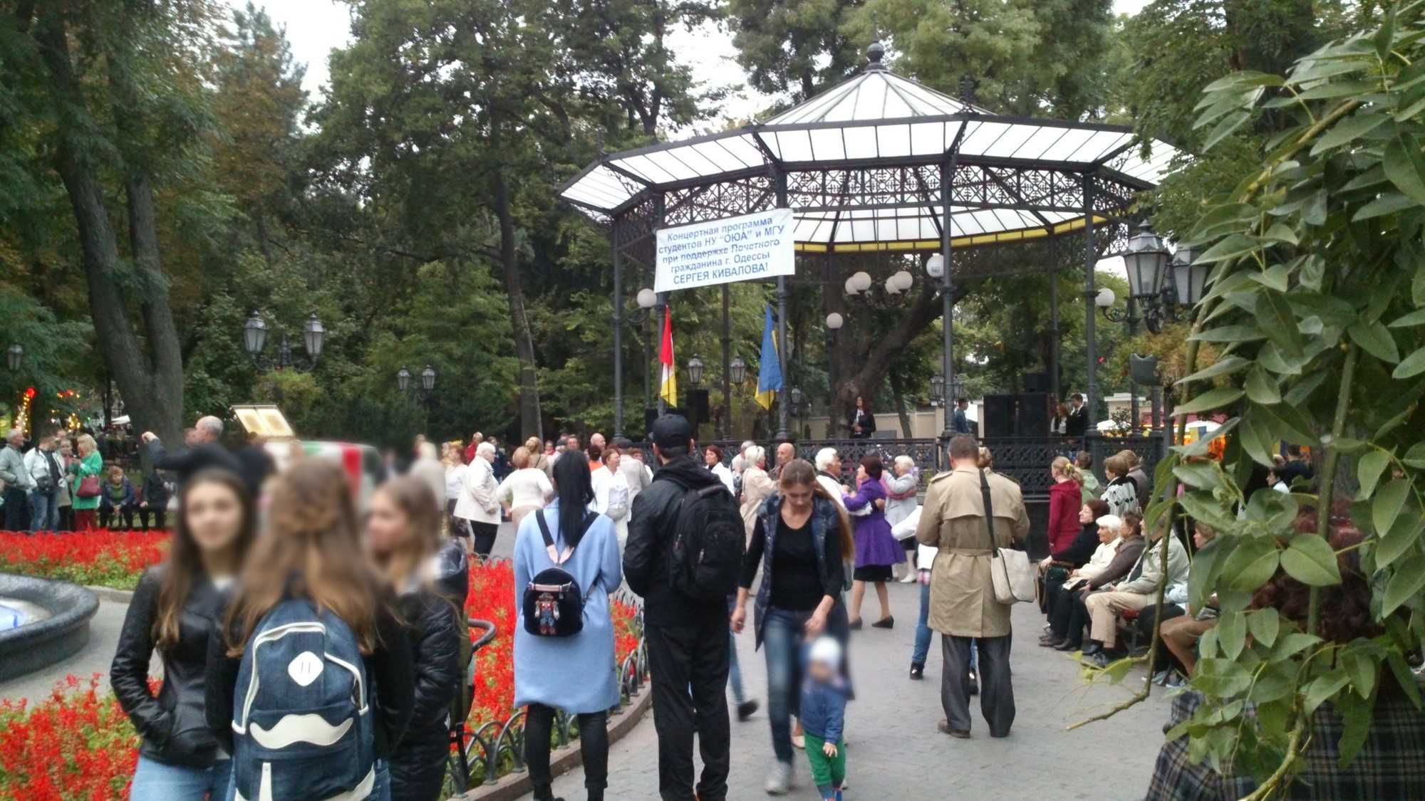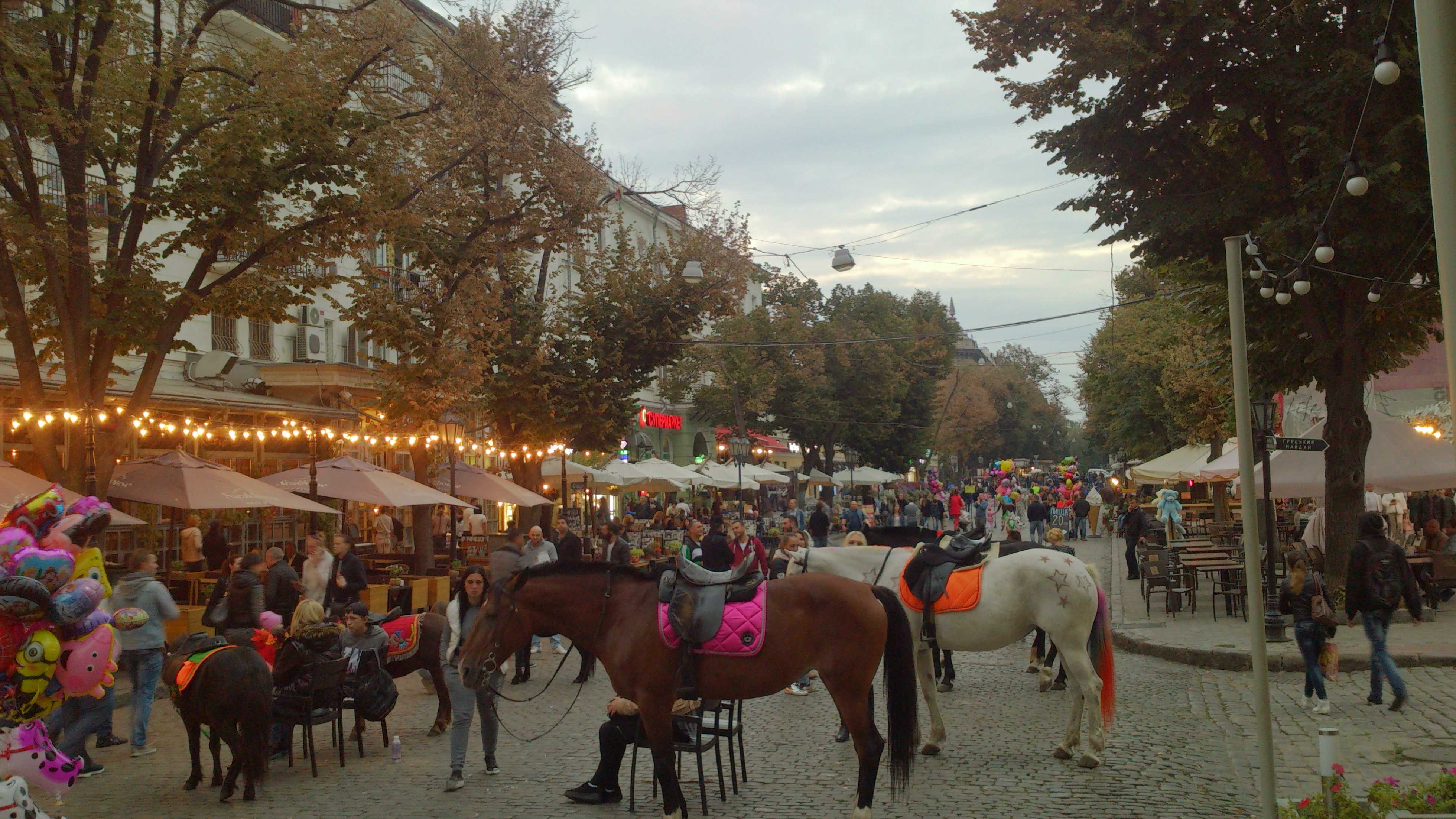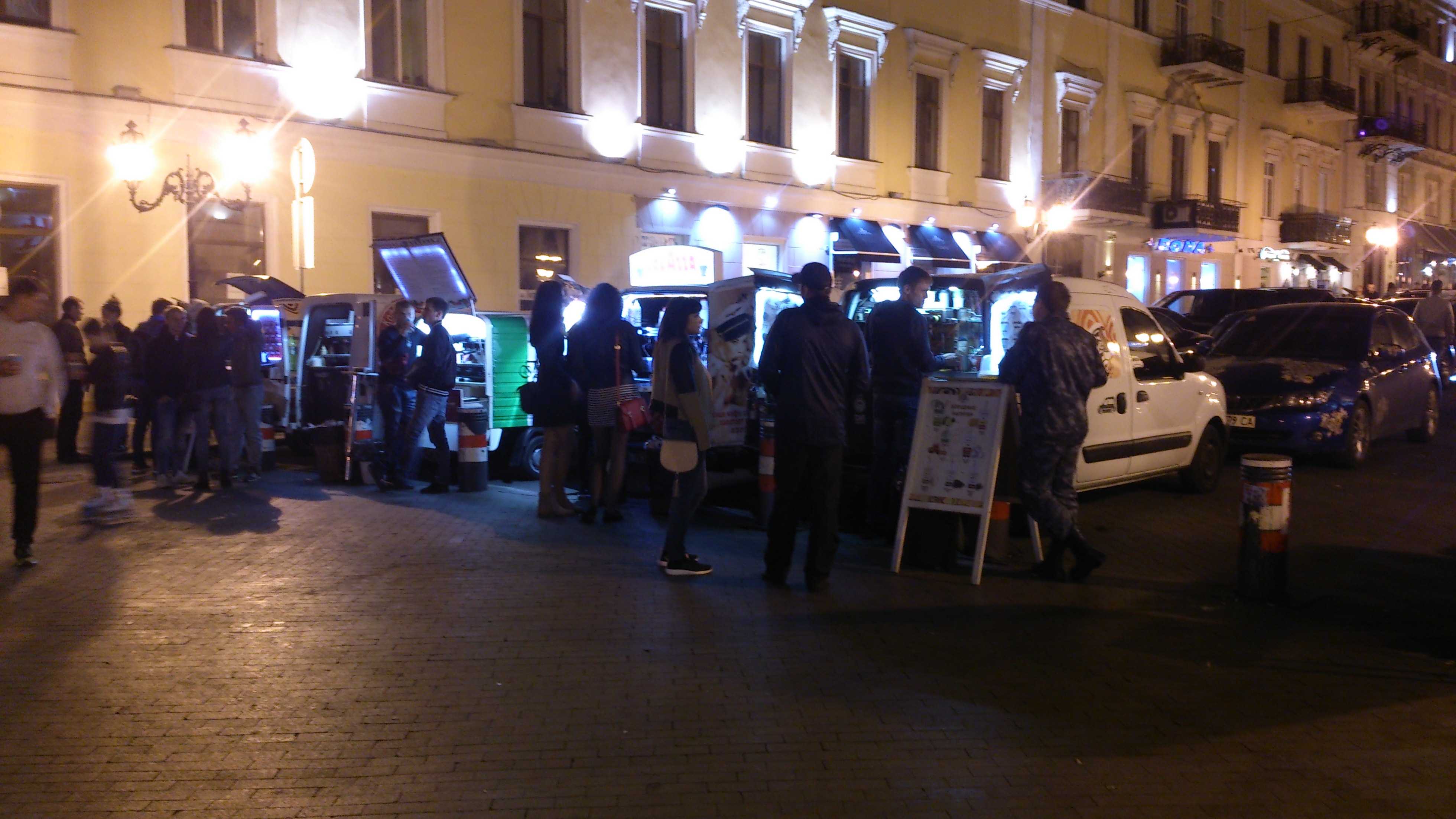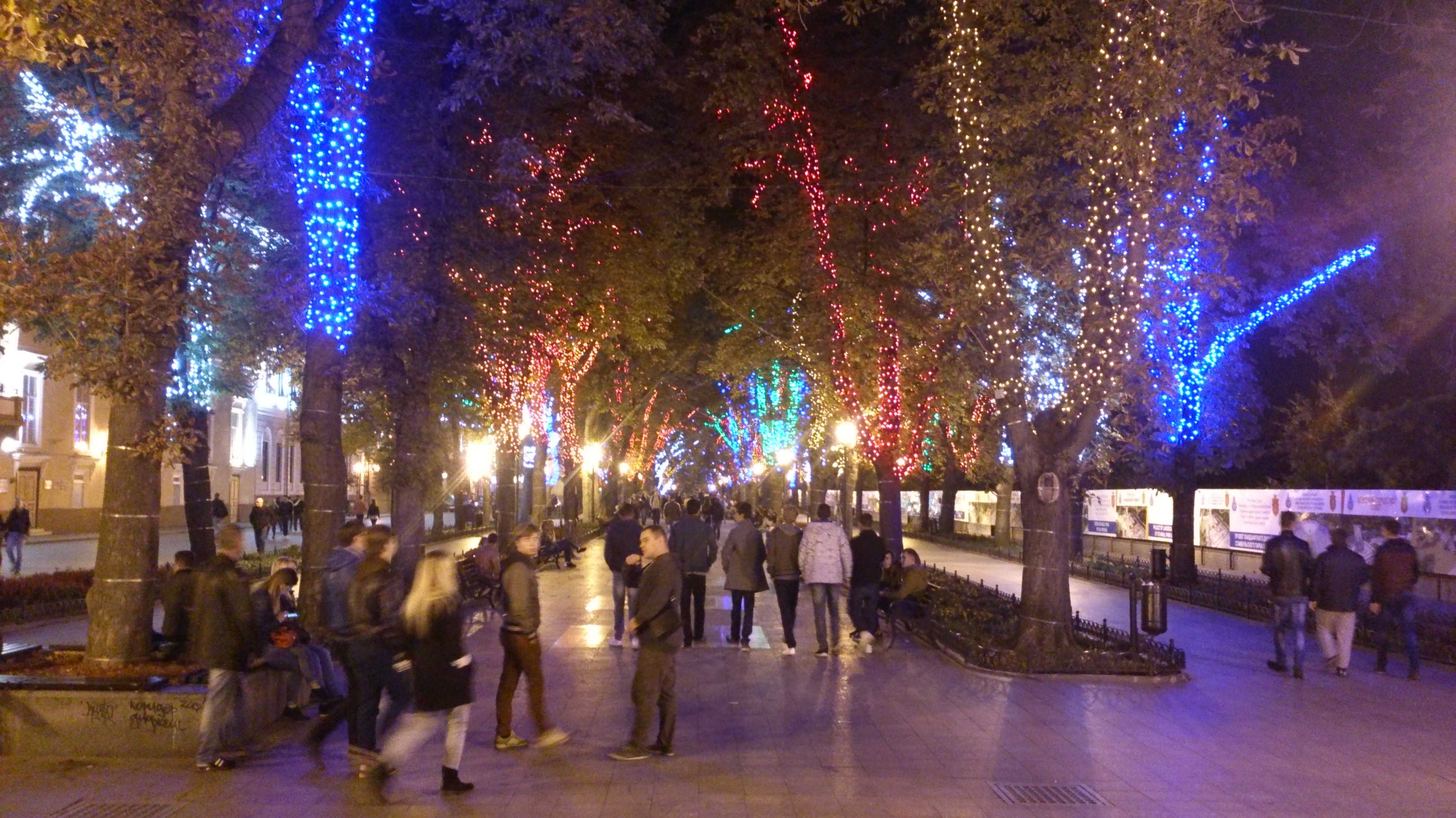 Und Odessa ist eine wirklich stimmungsvolle und für diese Größe auch sehr gemütliche Stadt. Überall spielen Straßenmusiker, in einem Park tanzen die Leute dazu. Kinder spielen Basketball und fahren mit Skateboards durch die Grünanlagen. Die Bäume sind mit Lichterketten geschmückt, die Straßenlaternen vom Stil aus den Anfängen des zwanzigsten Jahrhunderts und überall wird an winzigen Ständen Kaffee verkauft – da hat zum Beispiel ein Smart eine professionelle Kaffeemaschine, Becher und Sirups im Kofferraum und bietet sämtliche Kaffee-Varianten an, die man auch in Cafés bekommt.